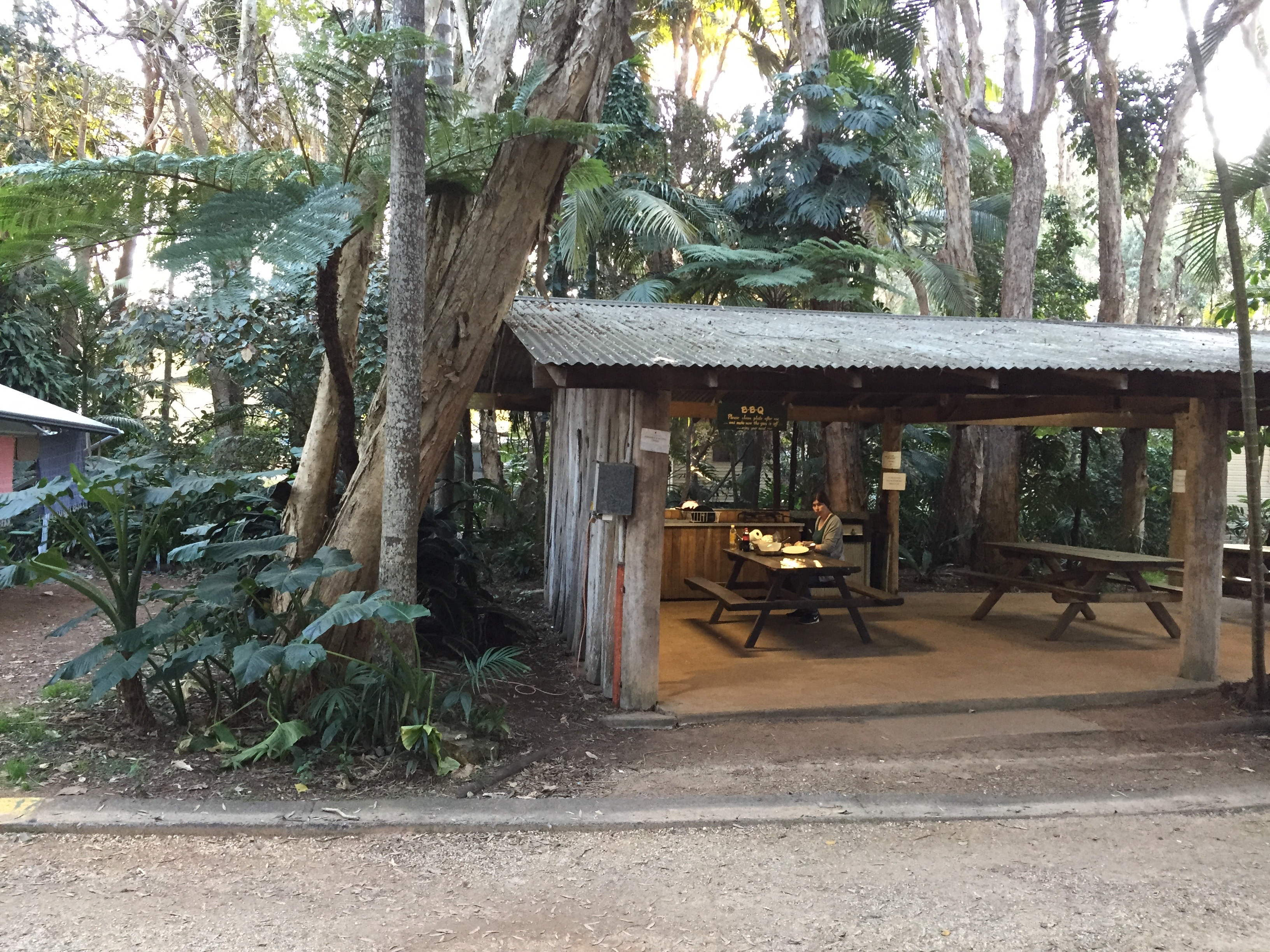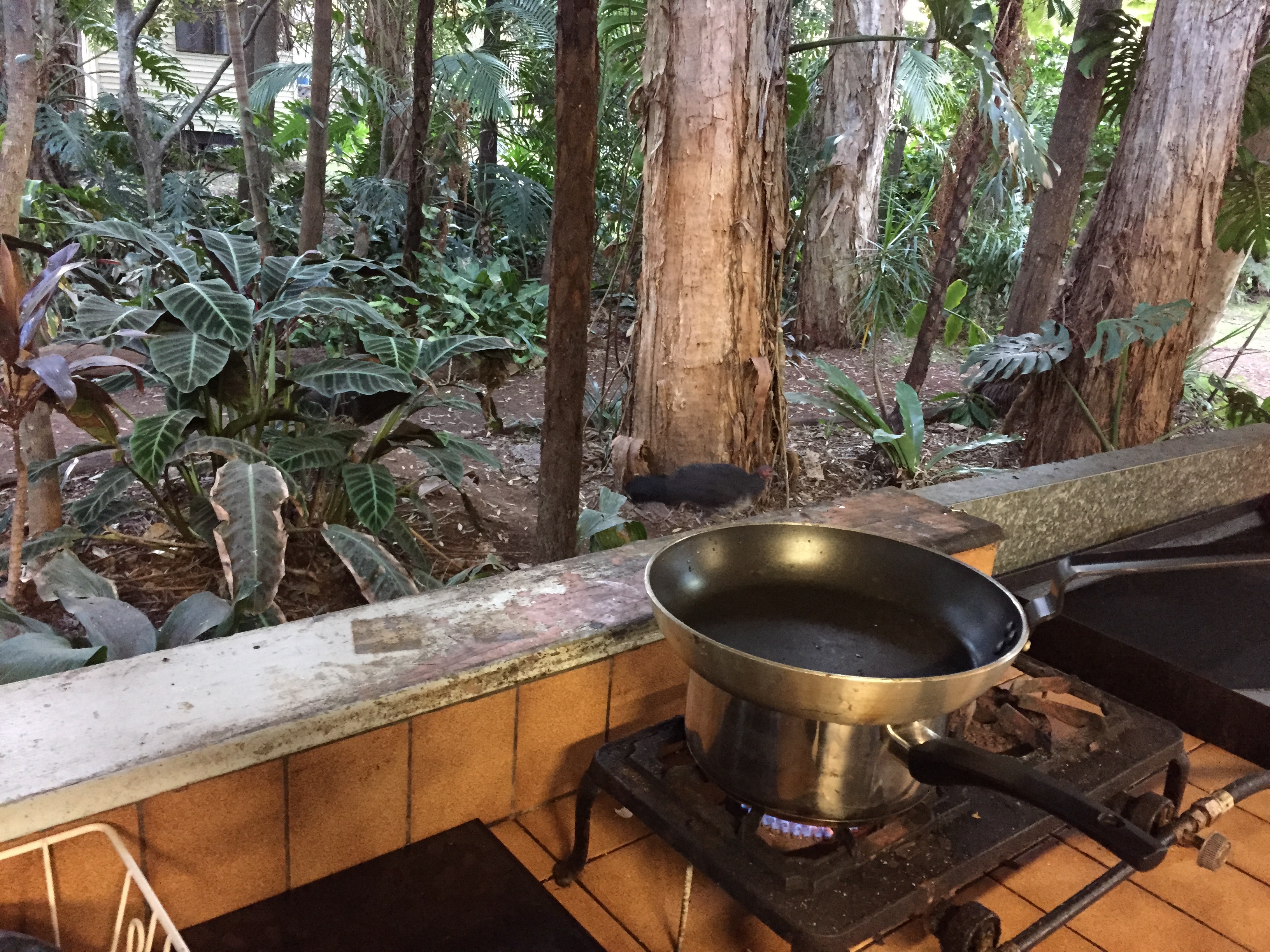 Nach insgesamt etwa 350km erreichten wir um 15:30 endlich das Tagesziel. Der Campingplatz ist eine Wucht.Alles wirkt total natürlich, mit riesigen Urwaldbäumen. Sogar ein Koala wurde kurz vor unserer Ankunft gesichtet. Wir haben aber nur komisch Hühner entdecken können. Unser Abendessen haben wir an einem Freiluftherd zubereitet und auch im Freien genossen.