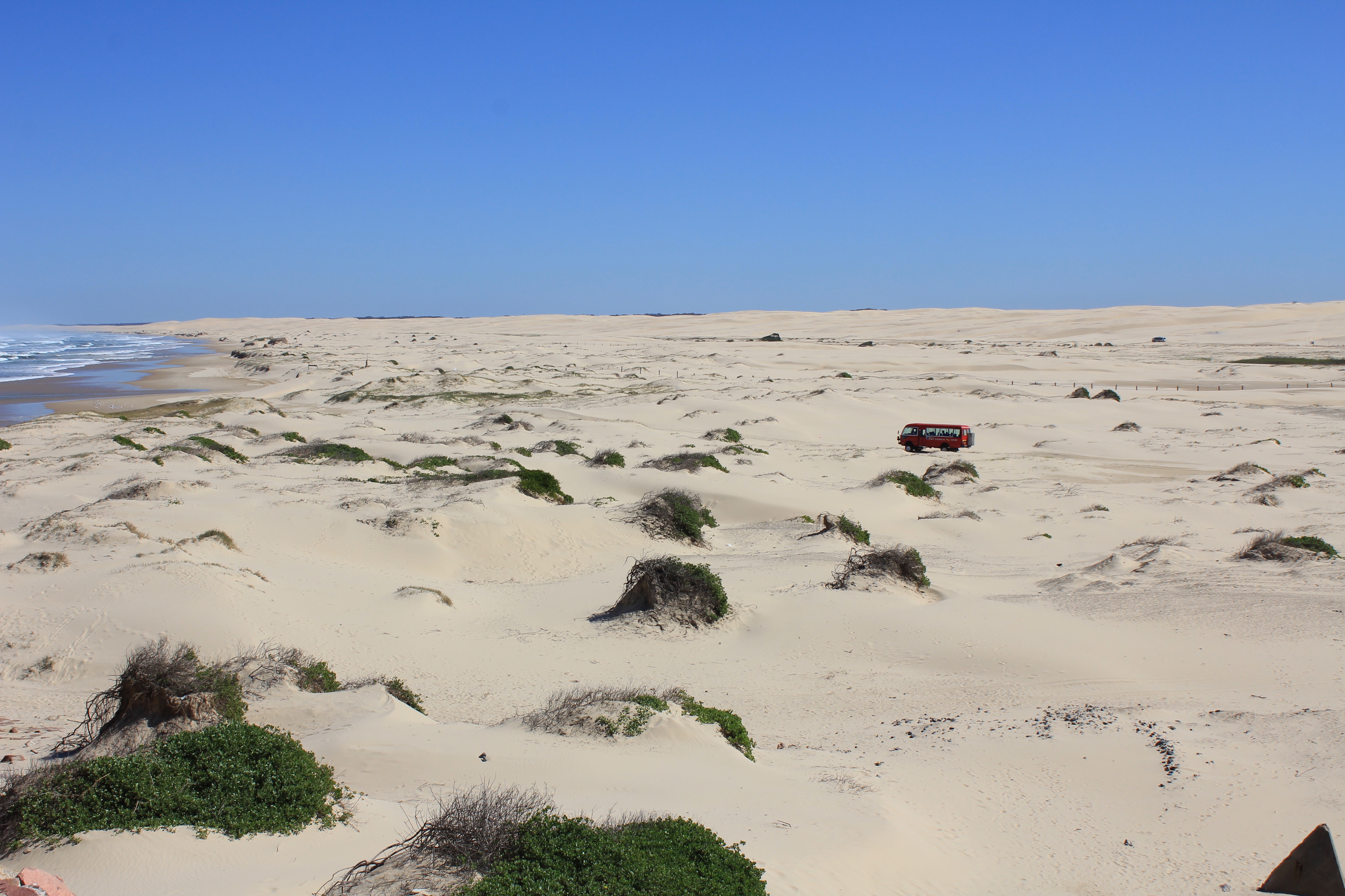 In Anna Bay selbst trifft das Meer auf riesige Sanddünen, das wirkt ganz schön surreal. Die Dünen sind wirklich riesig und man hat sie teilweise von der Straße von weitem gesehen. Der Wind ist noch ziemlich frisch hier, die Wellen dementsprechend gewaltig. An der tollen Aussicht erfreute sich auch eine Reisegruppe Asiaten, die man hier übrigens überall antrifft.