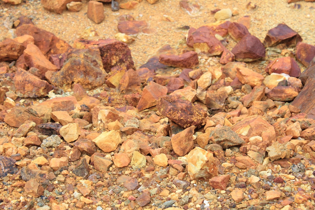 Der interessante Teil folgte dann direkt am Minengelände. Unglaublich was hier angerichtet wurde. Anfang 1900 war es das größte von Menschenhand geschaffene Loch in der südlichen Hemisphäre. Heute gefüllt mit saurem Wasser, Überreste der Abtragung. Das wird jetzt von der Umweltbehörde überwacht. Ein paar alte Maschinen stehen noch rum und ein Schornstein von der Kupferherstellung. Auch die Steine sind alle total verfärbt von dem Sulfat, das als Beiprodukt entstanden ist.