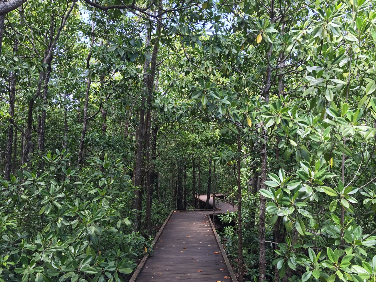 Erste Station war der Mangroven Walk. Ein einstündiger Rundweg über Planken und Schotterwege durch - Überraschung - Mangroven und später auch trockenere Gefilde. Da wurde es ganz schön warm. 28 Grad hatten wir heute. Durch den dollen Wind ziemlich unbemerkt, aber im Windschatten dann so richtig warm.