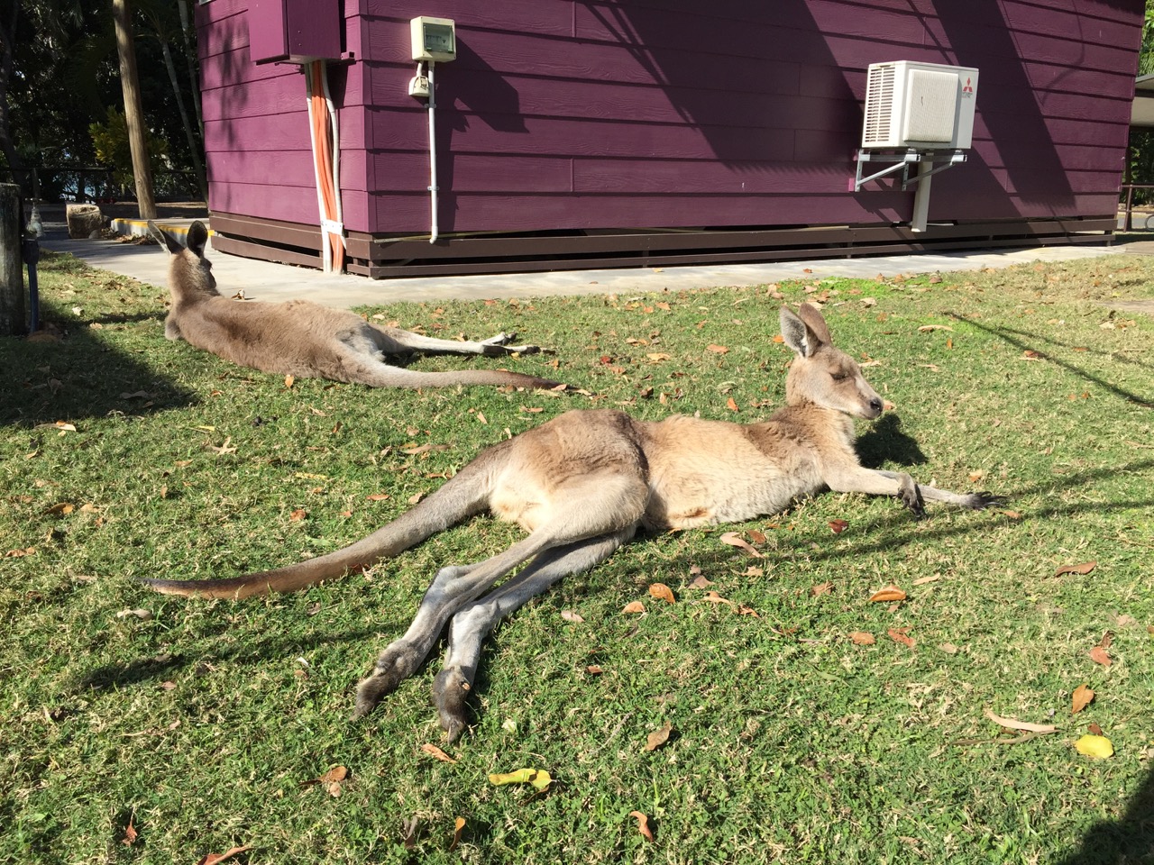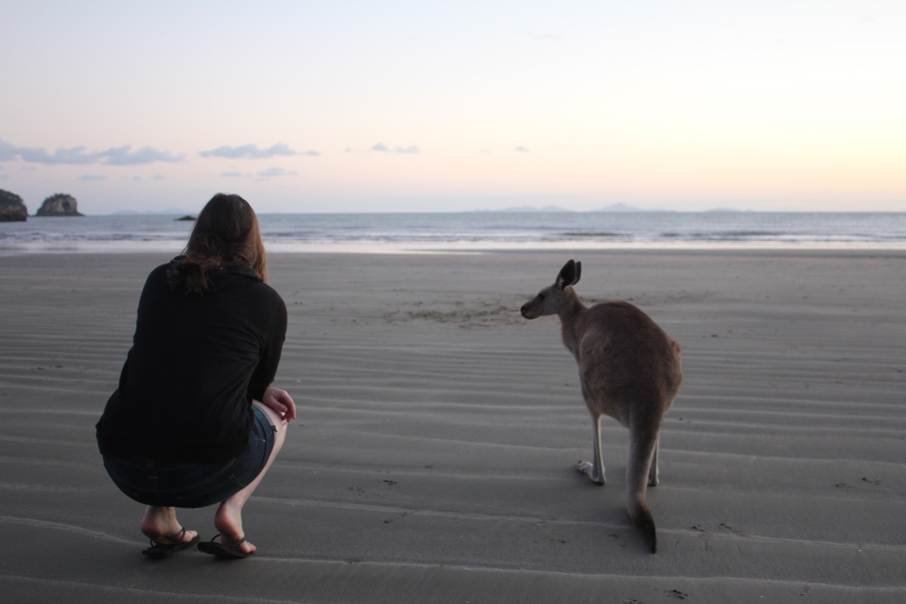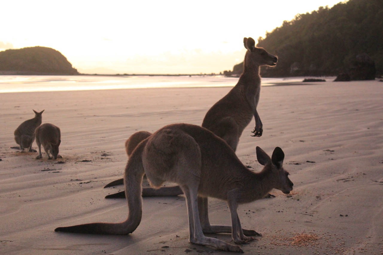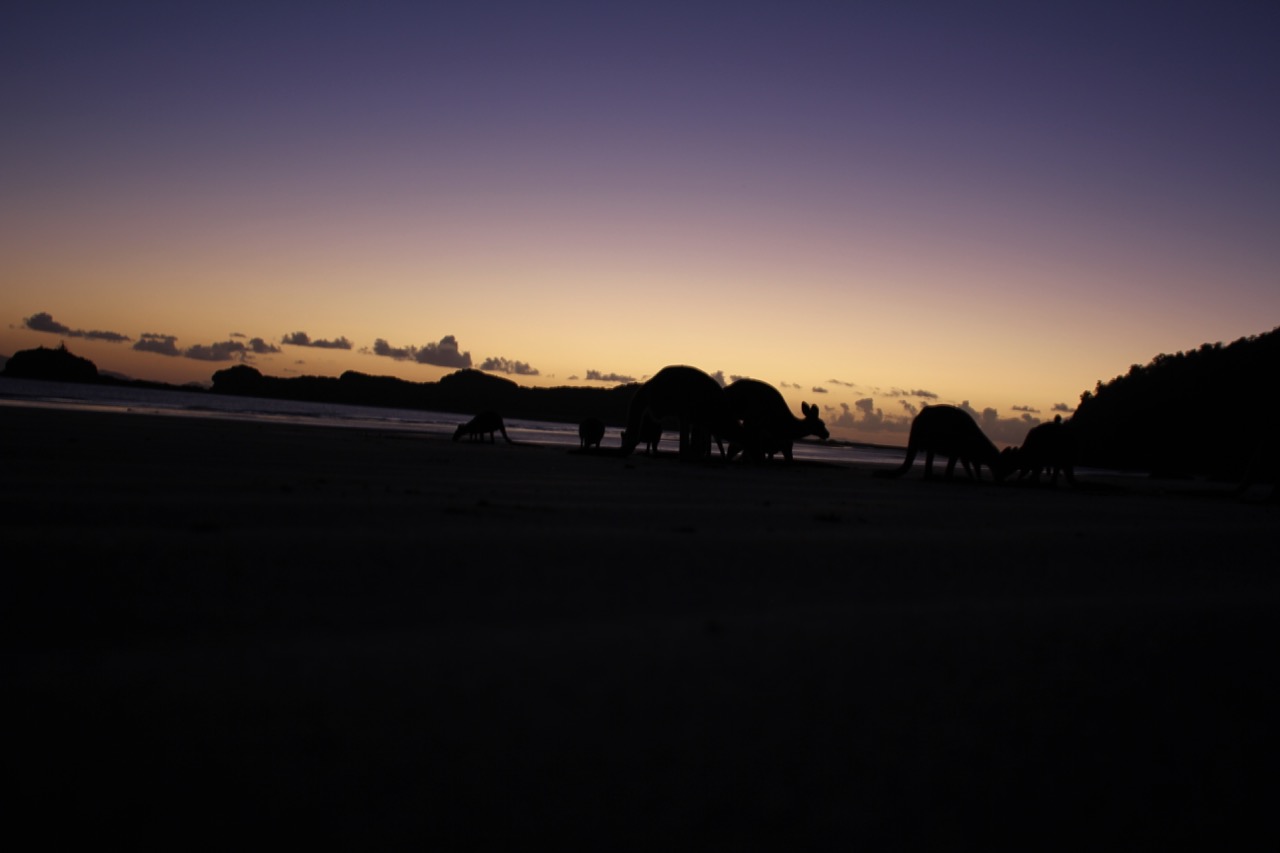 Guten Morgen, es ist nun bereits der 15. und da es das Highlight ist noch in diesem Artikel. Das Morgenritual an Cape Hillsborough. Die mysteriös zum Sonnenaufgang erscheinenden Kängurus und Wallabies. Uns wurde gesagt zwischen 6 6:30 sollen wir runter. Unser Wecker klingelte bereits um 5:30 und das war auch Weise. Man konnte die Sonne schon aufgehen sehen. Also schnell rein in die Sachen, Kamera schnappen und runter zum Strand. Die Wallabies saßen schon fast alle da. Und mysteriöser Weise kam ein Mann begleitet von Emily und Bridget vom Campingplatz Gelände. Beladen mit Futter für das morgendliche Mysterium. Schön war es wirklich. Die Kängurus und Wallabies aufgereiht vor dem dem Sonnenaufgang. Um sie herum jede Menge Menschen die sie beobachteten. Mir würde das ja nicht passen, wenn mir so viele auf mein Essen starren, aber nunja. Für uns war das eine echt feine Sache.