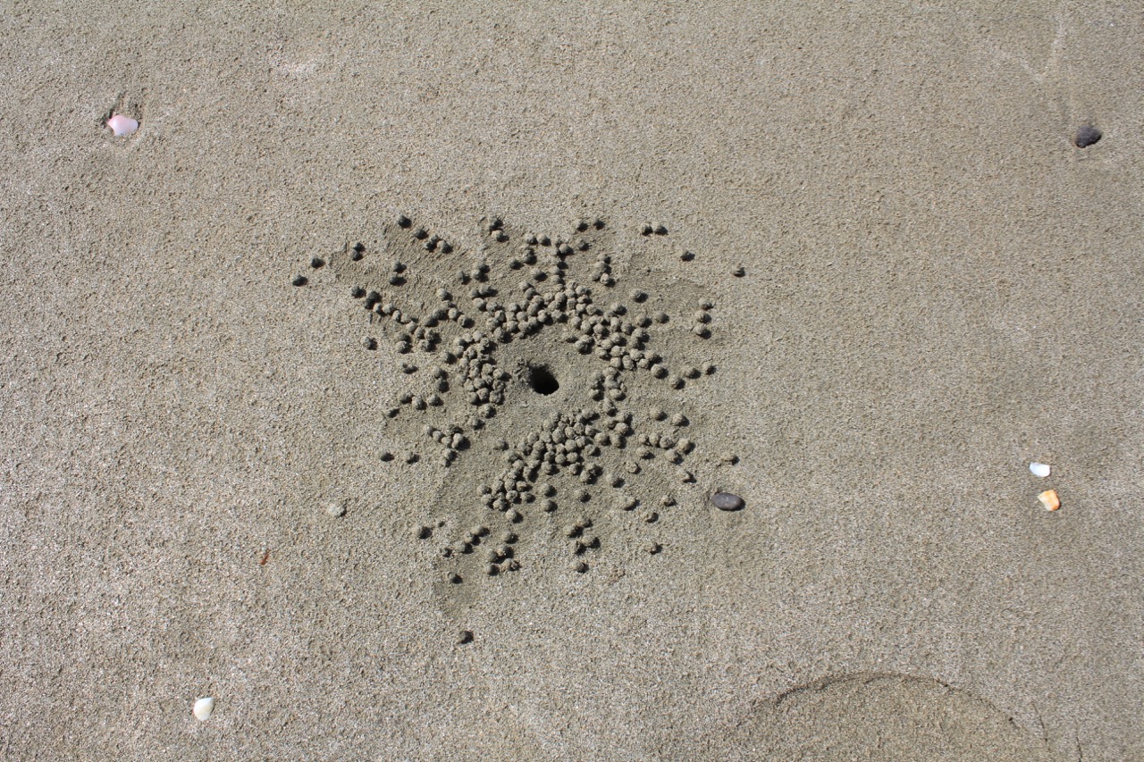 Wir erkundeten den Strand und entdeckten mehrere hundert Meter über uns eine Aussichtsplattform. Und noch etwas anderes sehr außergewöhnliches. Da waren lauter kleine Kugeln am Strand. Lustig angeordnet lagen die da rum. In der Mitte eines Kugelhaufens entdeckten wir ein kleines Loch. Etwas später erhaschten wir dann den Blick eines kleinen Krebses, der in einem der Löcher verschwand und kurze Zeit später flog eine kleine Sandkugel aus dem Loch. Die verursachen also die lustigen Kugelformationen.
