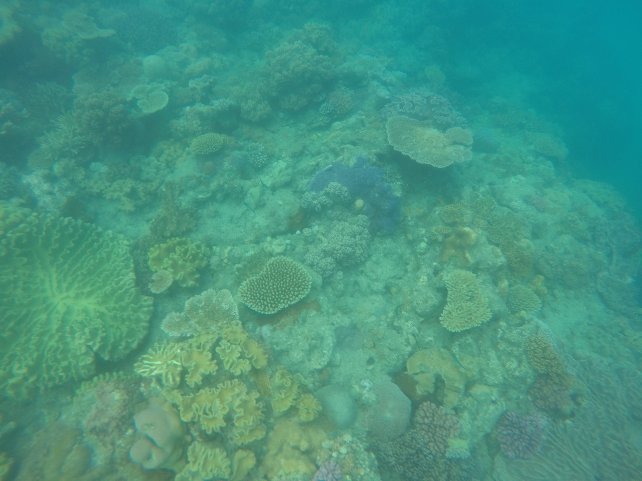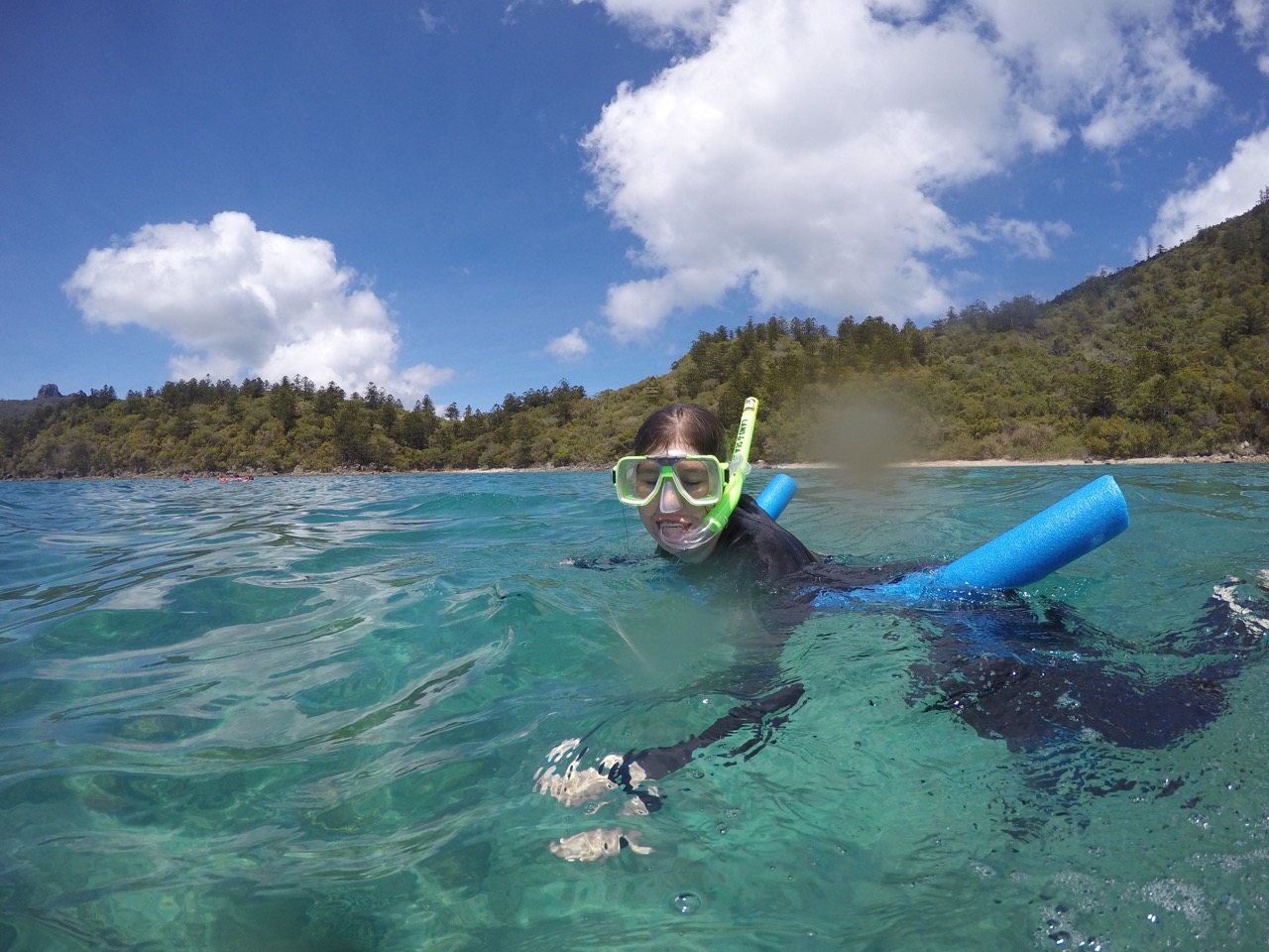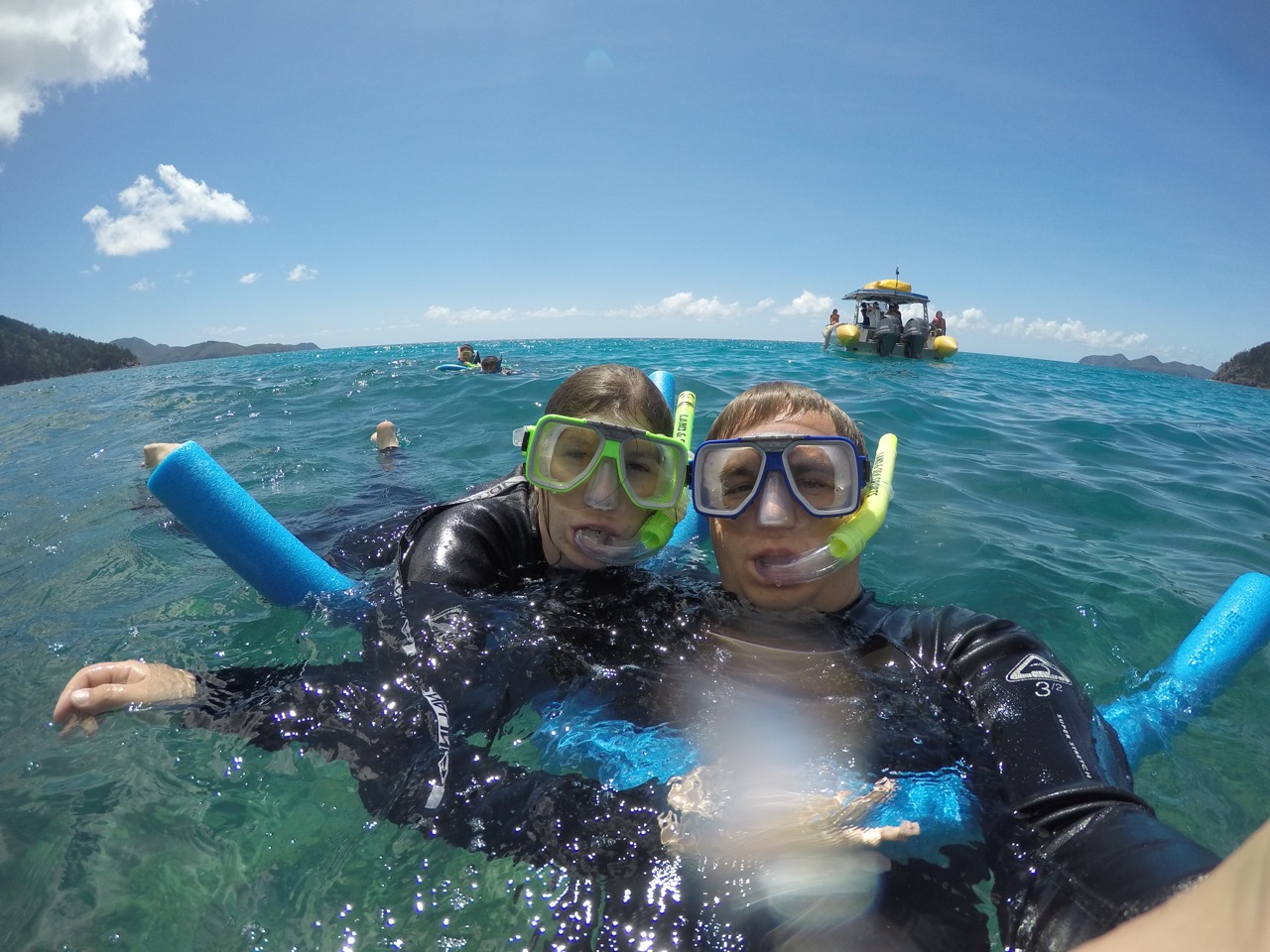 Angekommen hieß es Tauchanzug an, Brille und Schnorchel auf und ab ins Wasser. Wir waren witzigerweise die beiden einzigen, die ihren Anzug instinktiv falschrum angezogen haben, also mit dem Reisverschluss vorne und nicht hinten. Also die enge Pelle wieder abstreifen und richtig anziehen. Nun konnte es aber losgehen. Von oben sieht das Wasser ja nur super blau aus. Sobald man seinen Kopf aber unter Wasser hält, eröffnet sich einem eine neue Welt. Das Great Barrier Reef. Wir befinden uns hier etwa in der Mitte des Riffes zwischen dem südlichsten und nördlichsten Punkt des Riffs. Man sagt ja, je weiter es in den Norden geht, umso schöner und bunter wird es. Für den Anfang war es hier schonmal gar nicht schlecht. Jede Menge Hartkorallen und kleinere bis mittel große Fische tummelten sich im Wasser. Angeblich haben auch welche eine Schildkröte gesehen...hier ein paar unserer Eindrücke. Es gab netterweise Poolnudeln, weil wir ja im Urlaub sind und uns nicht anstrengen sollen ;)