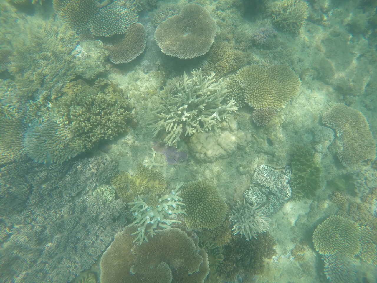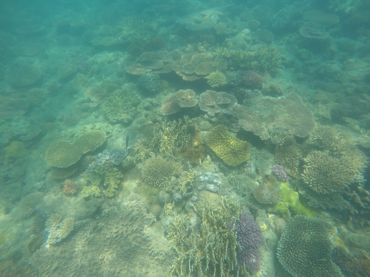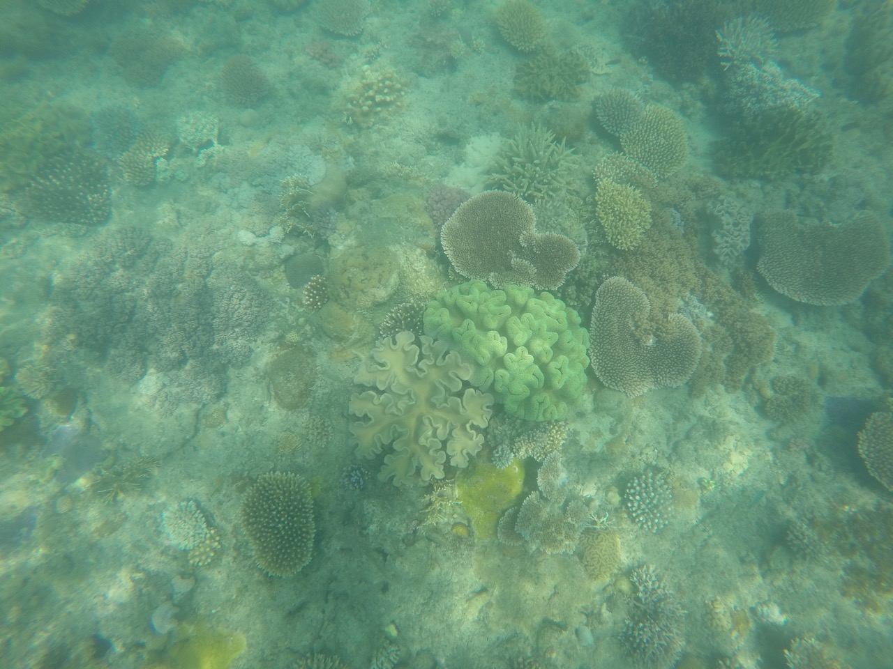 Angekommen hieß es Tauchanzug an, Brille und Schnorchel auf und ab ins Wasser. Wir waren witzigerweise die beiden einzigen, die ihren Anzug instinktiv falschrum angezogen haben, also mit dem Reisverschluss vorne und nicht hinten. Also die enge Pelle wieder abstreifen und richtig anziehen. Nun konnte es aber losgehen. Von oben sieht das Wasser ja nur super blau aus. Sobald man seinen Kopf aber unter Wasser hält, eröffnet sich einem eine neue Welt. Das Great Barrier Reef. Wir befinden uns hier etwa in der Mitte des Riffes zwischen dem südlichsten und nördlichsten Punkt des Riffs. Man sagt ja, je weiter es in den Norden geht, umso schöner und bunter wird es. Für den Anfang war es hier schonmal gar nicht schlecht. Jede Menge Hartkorallen und kleinere bis mittel große Fische tummelten sich im Wasser. Angeblich haben auch welche eine Schildkröte gesehen...hier ein paar unserer Eindrücke. Es gab netterweise Poolnudeln, weil wir ja im Urlaub sind und uns nicht anstrengen sollen ;)