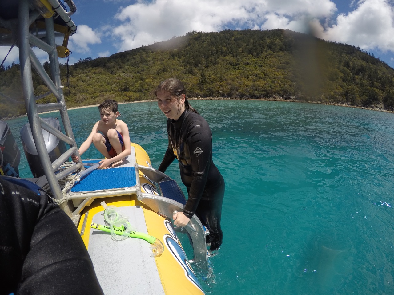 Um kurz nach 9 wurden wir am Campingplatz abgeholt und zu unserem Boot gebracht. Nach einem kurzen einchecken und der Abholung unserer Neoprenanzug dauert es auch nicht mehr lange, bis wir unser Boot "Wild Thing" ohne unsere Schuhe betreten durften. Mit uns fuhren 34 Passagiere und die Crew Dillan Jonas "D.J." und Matt. Mit atemberaubenden 70km/h und kurzzeitigen Sprints mit fast 100 erreichten wir nach 45 min den Schnorchelplatz.