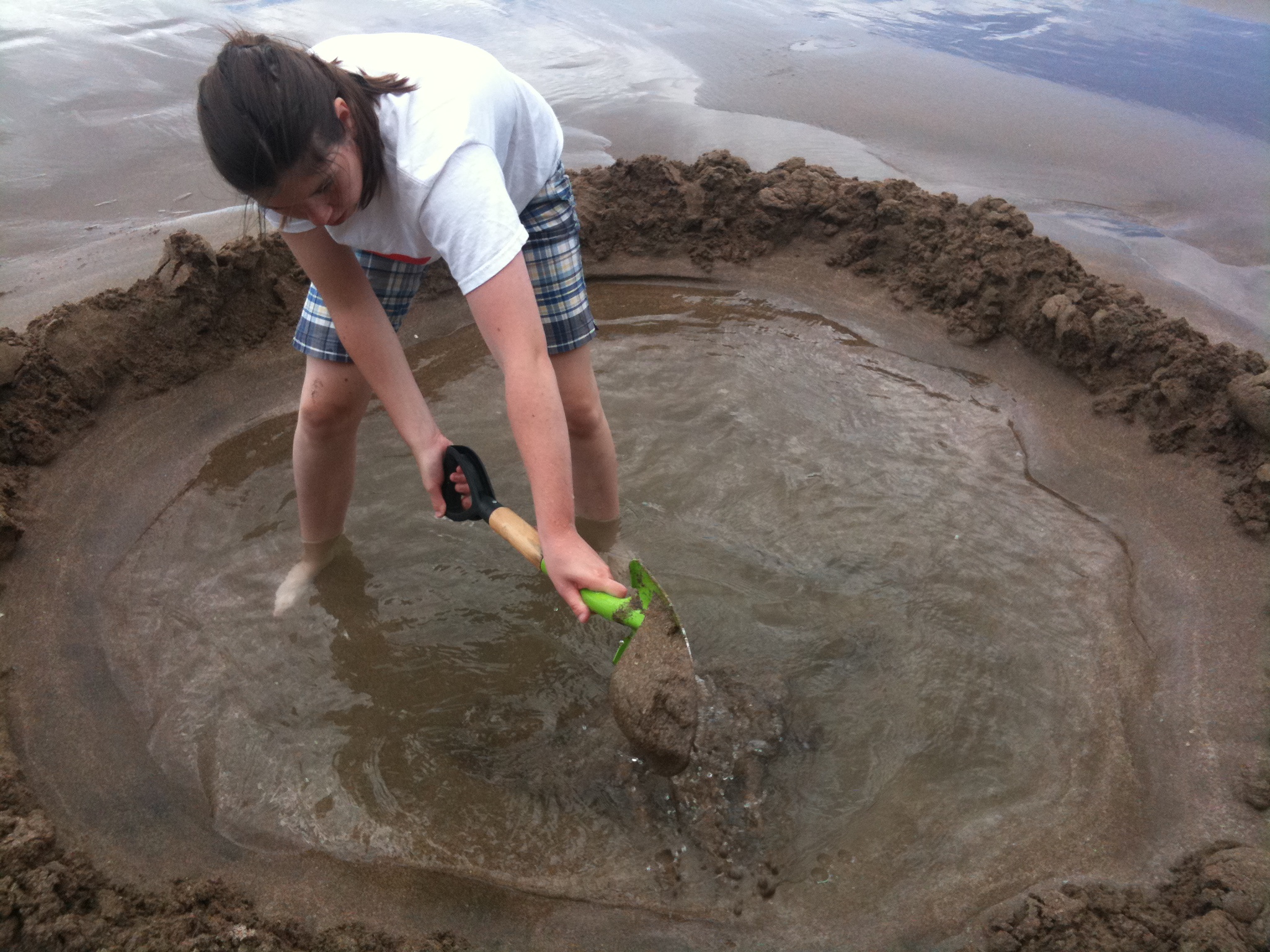 So gleich nach dem aufwachen und fertig machen sind wir los zum Hot Water Beach, denn wir können es kaum noch erwarten uns unser eigenes Loch zu buddeln :) Am Starnd haben wir uns dann unsere ersten neuseeländische FlipFlops gekauft und ne Buddle ausgeliehen, damit unser Loch auch was wird. Nur leider ist die Ebbe noch nicht soweit fortgeschritten und wir müssen noch warten. Als dann auch unsere asiatischen Fotofreunde am Ort des geschehens eingefunden haben, konnte es losgehen das Wasser war sogut wie weg und wir total motiviert. Irgendwie war unser Loch aber doch ein wenig zu nah im Wellenauslaufgefährdeten Bereich und ab und zu wurde unsere wachsende Mauer zu einer schrumpfenden. Irgendwann hat es dann aber doch geklappt und wir hatten unser eigenes warmes Loch am Hot Water Beach.