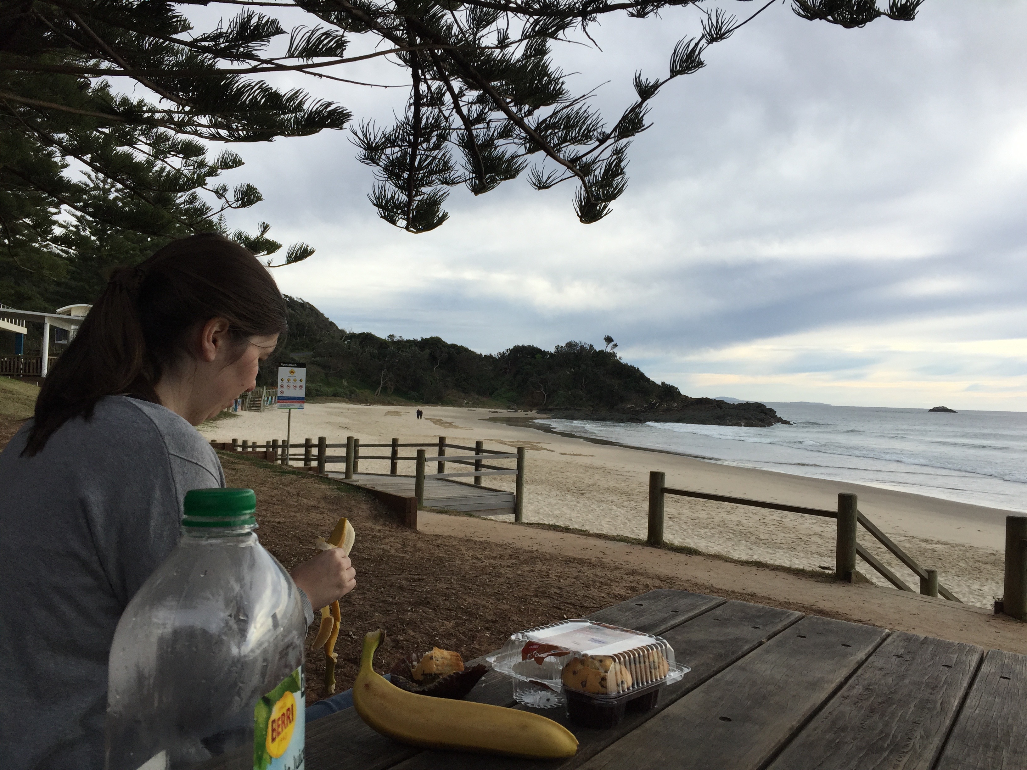 Frühstück gab es für uns heute noch in Rocky Beach, leider ohne Justus, Peter und Bob. Dafür aber mit sehr schöner Aussicht. Wir waren nicht die einzigen am Strand. Hinzu kam noch ein altes Ehepaar, sie mit Rollator, er mit Surfboard. Das ist Australien.