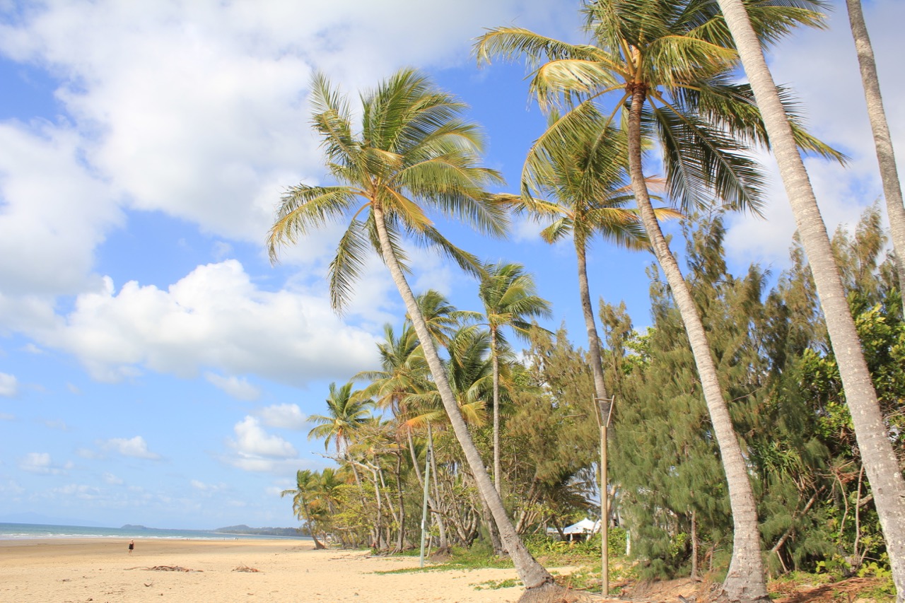 Die Nacht verbrachten wir tatsächlich ohne jegliches Vogelgezwitscher. So konnte es frisch und erholt um 8 Uhr losgehen. Unser Campingplatz war ja in South Mission Beach, wir fuhren nun erstmal an den Strand in Mission Beach.