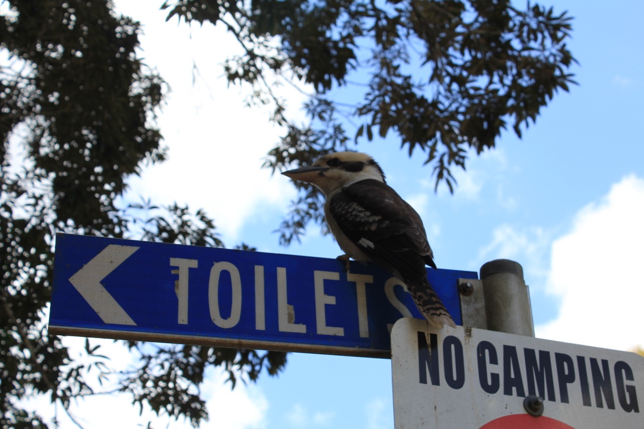Auf dem Kloschild saß dann auch ein echter Einheimischer, der Kookaburra. Der macht auch ein echt verrücktes Geräusch. Klingt als würde er jemanden auslachen.