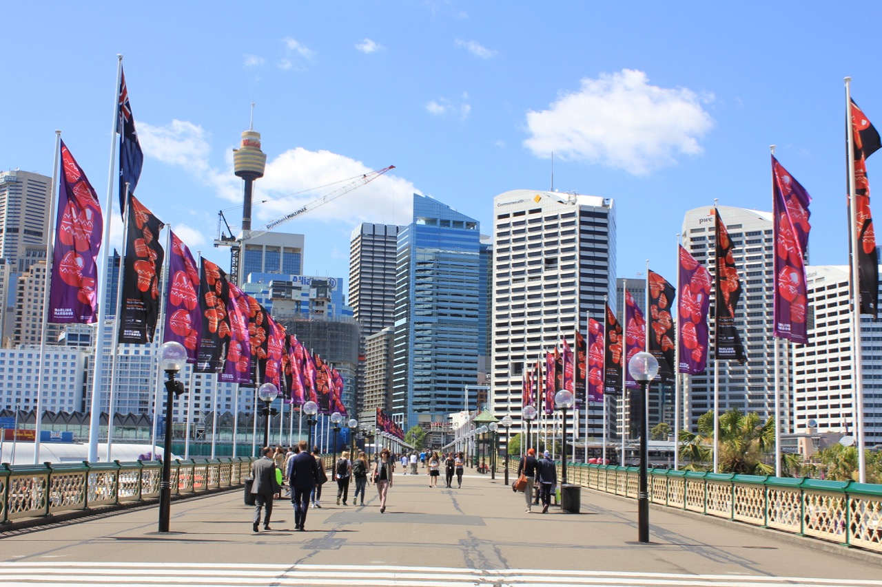 Vom Circular Quay fahren wir bis nach Darling Harbour, wo es bei unserem letzten Besuch noch eine Einschienenbahn gab, mit der man ein Stück durch die Stadt fahren konnte. Zu unser Überraschung gibt es davon aber nur noch die Bahnhöfe, der Rest wurde abgebaut um ein neues Messezentrum zu bauen. Das ICC. Wir schließen unsers, sie bauen sich ein neues.