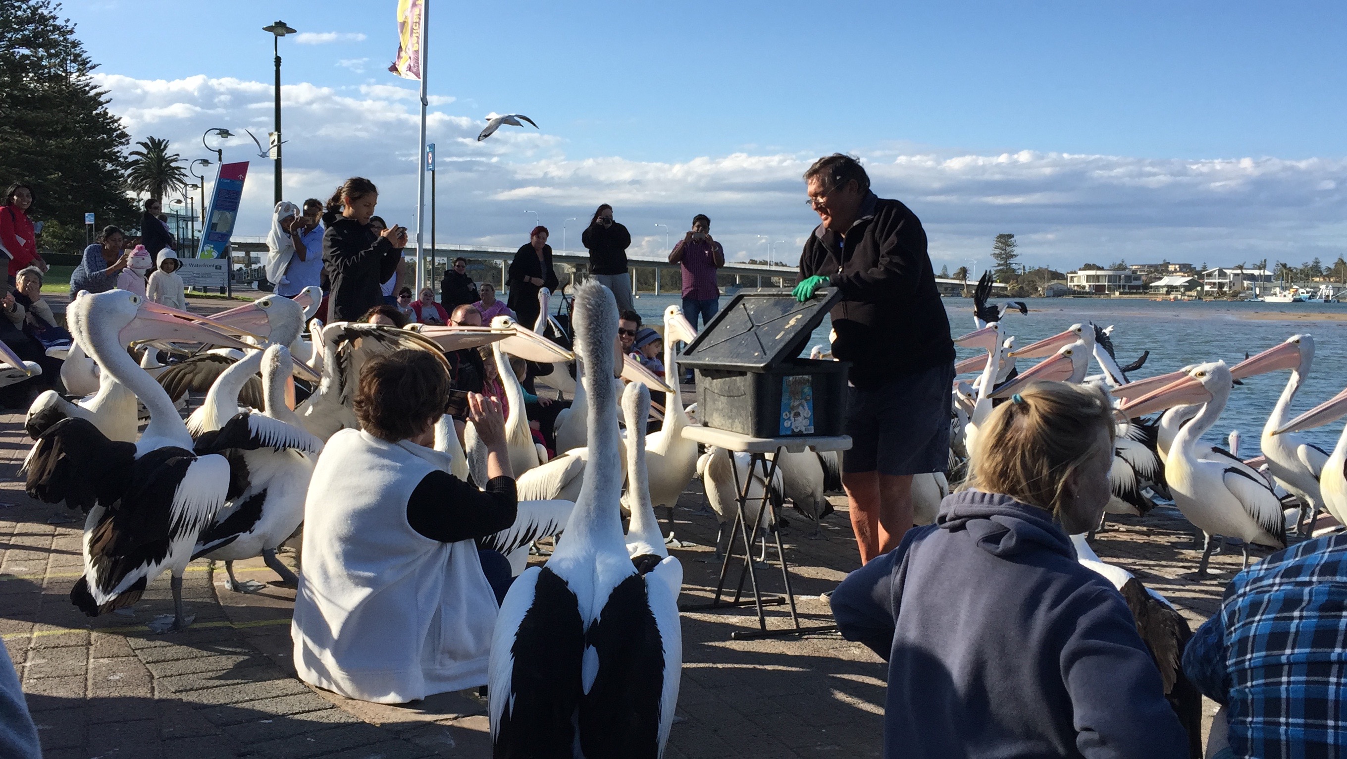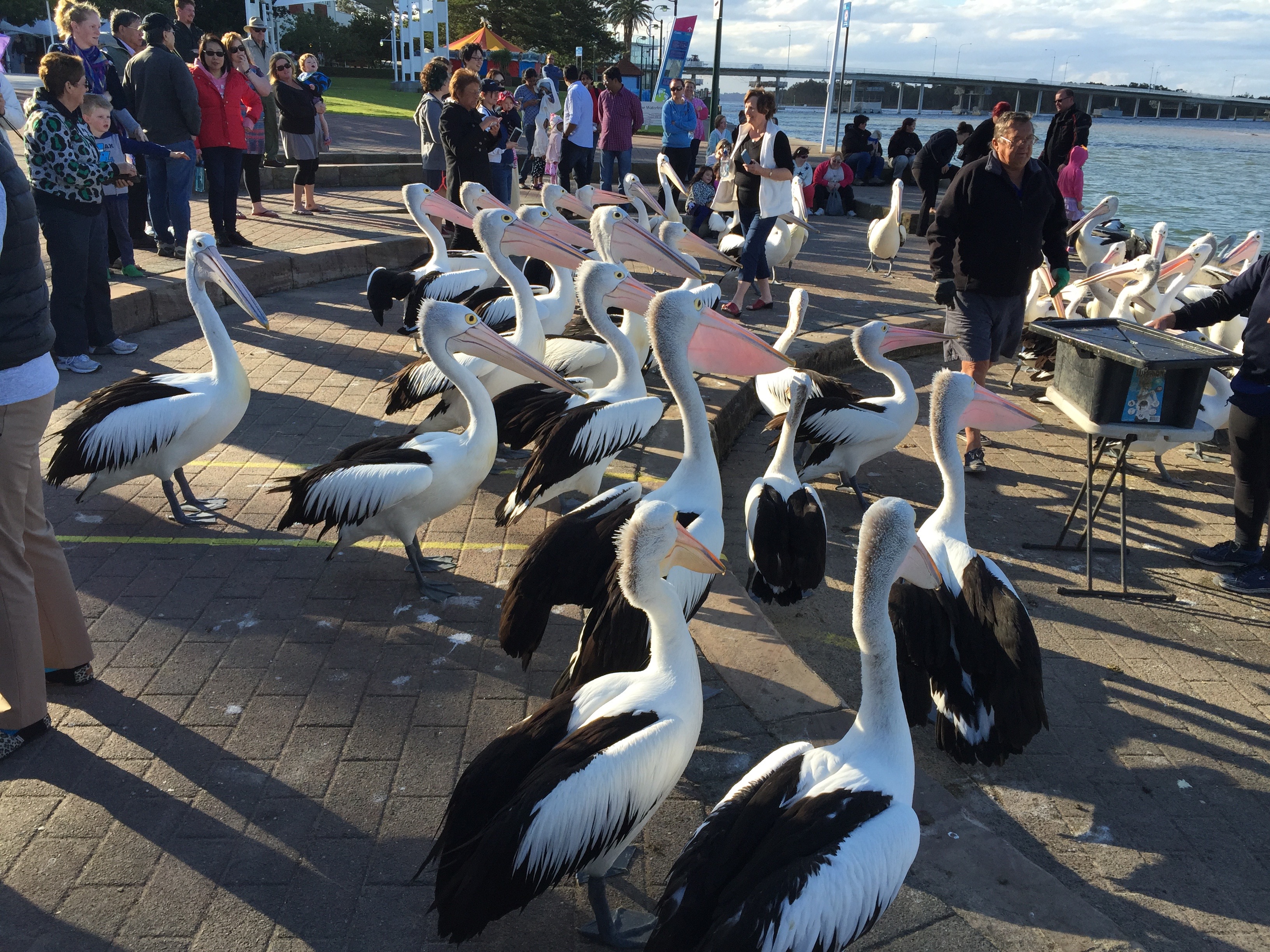 Nachmittags fand dann aber endlich die Attraktion statt weswegen wir hier überhaupt hin sind. Die Pelikanfütterung. In den 1930ern fingen lokale Fischhändler an ihre alten Fische am Abend an die Pelikane zu verfüttern, immer zur selben Zeit. Bis heute hat sich das in die Köpfe der Vögel so eingebrannt, dass alle jeden Tag rechtzeitig da sind um sich ihre Portion Fisch zu holen. Heute wird das von einer Tourismusorganisation gemacht, die dafür nur ein paar Spenden haben möchte. Ein echt spaßiges Erlebnis, dass zum großen Teil auch von den Mitarbeitern lebt, die einem eine wunderbare Zeit bescheren.