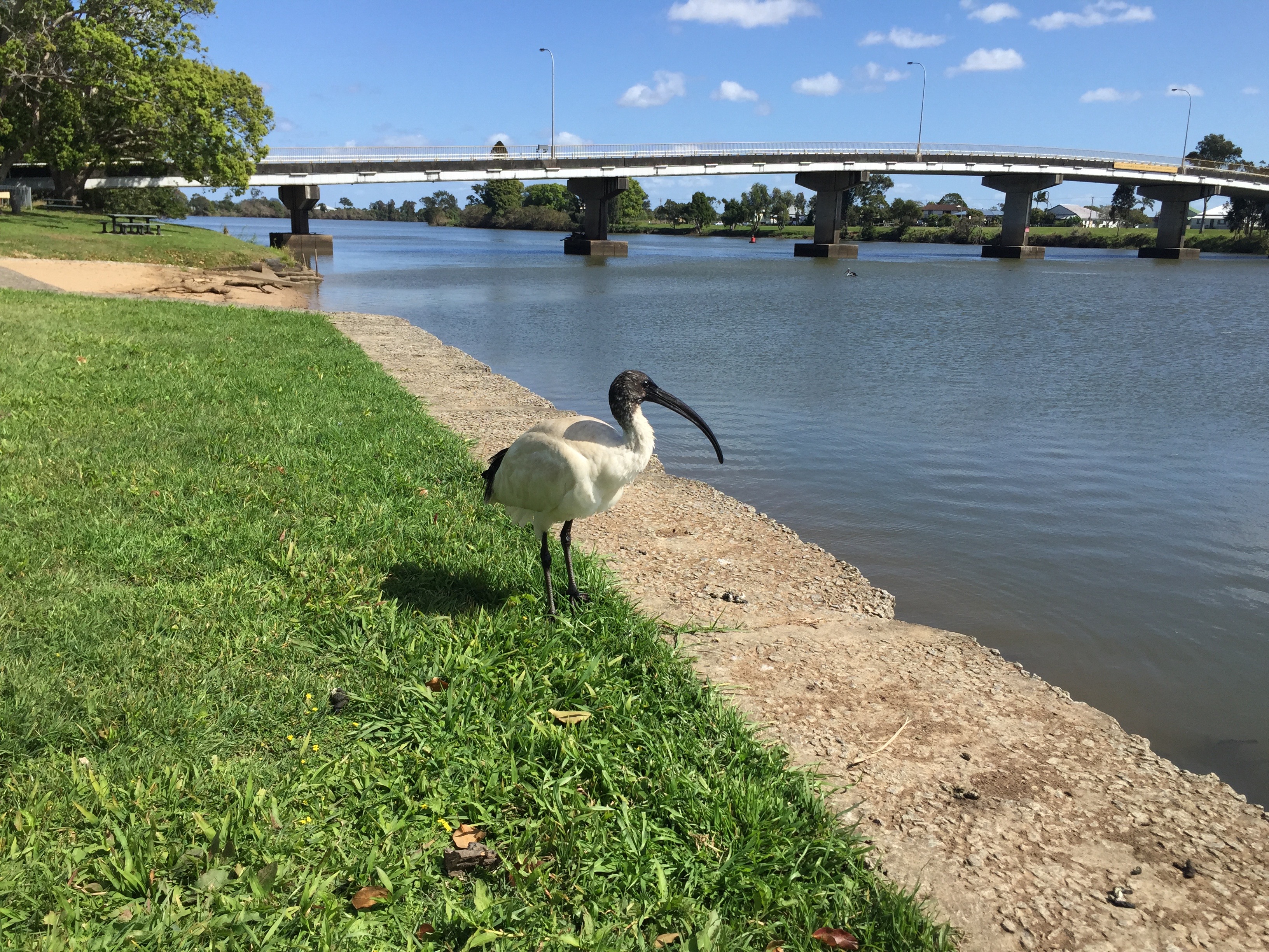 Tagesziel sollte Byron Bay sein. Auf unserem Weg fuhren wir vorbei an endlosen Zuckerrohr Plantagen und parallel zum riesigen Richmond River. In Woodbury - echt cooler Ortsname oder? - machten wir dann kurz halt um das Panorama einzufangen. Und was entdeckten wir dort im Fluss?! Neben den üblichen krummschnäbligen Vögeln doch tatsächlich wieder ein paar Pelikane. Der eine schwamm direkt auf uns zu. Wusste wohl von unserer früheren Bekanntschaft mit seinen Artgenossen.