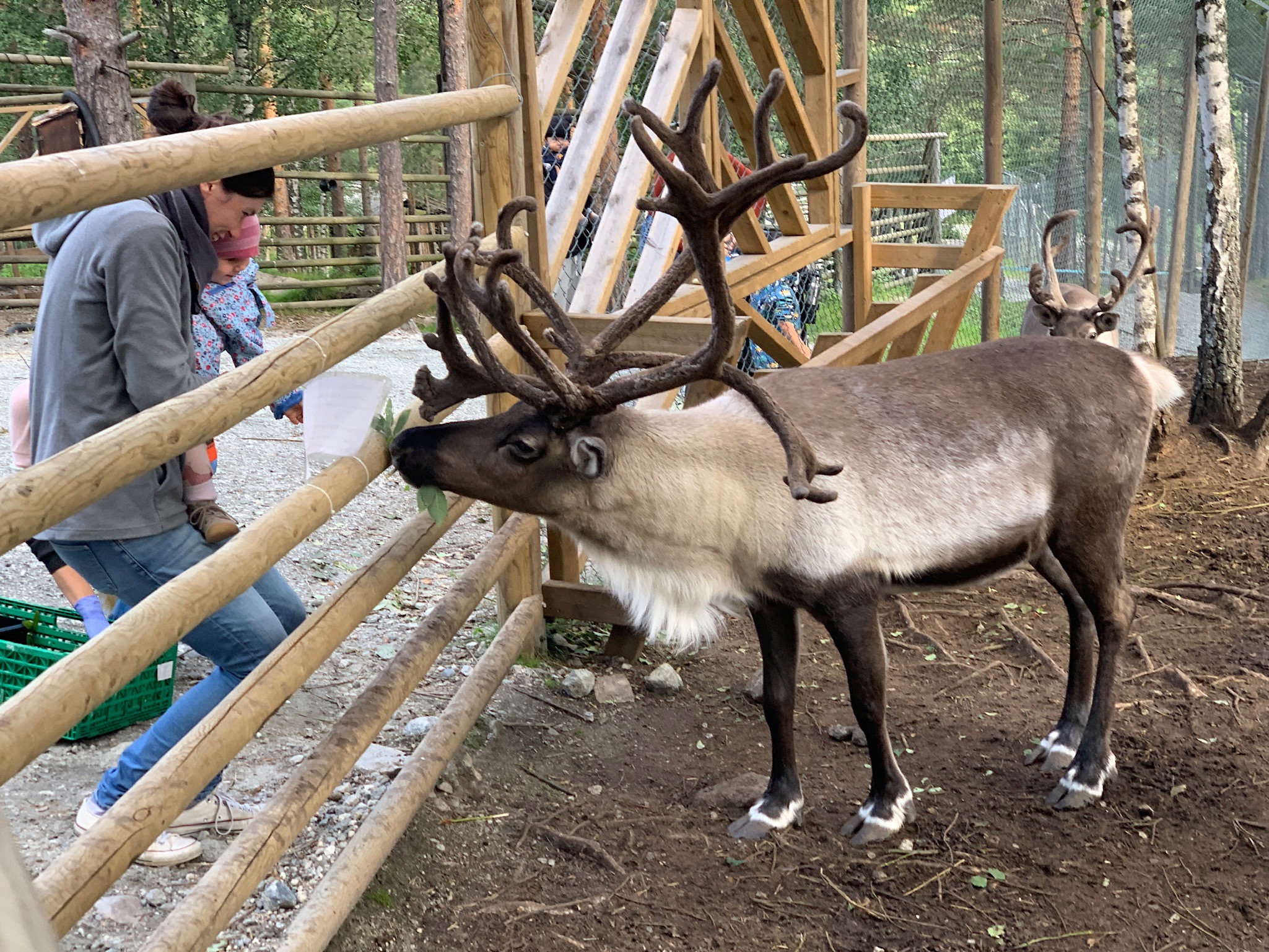 Da es sich aber um einen Abschnitt zur Desinfektion handelt, fragte die Zoowärterin, ob jemand nicht verstanden hat was sie sagte. Unsere Hände gingen als einzige nach oben. Bei der Desinfektion geht es überraschenderweise mal nicht um Corona, sondern ein Bakterium was im Umlauf ist und nicht von Mensch auf Tier übertragen werden soll. Wer also füttern will muss Hände desinfizieren. Brav folgten wir auch der Anweisung und stellten uns die Schlange zum Füttern. Bei Elchen sind wir da ja schon echte Profis. Deswegen nachfolgend auch der Beweis, dass wir auch mit Rentieren umgehen können.