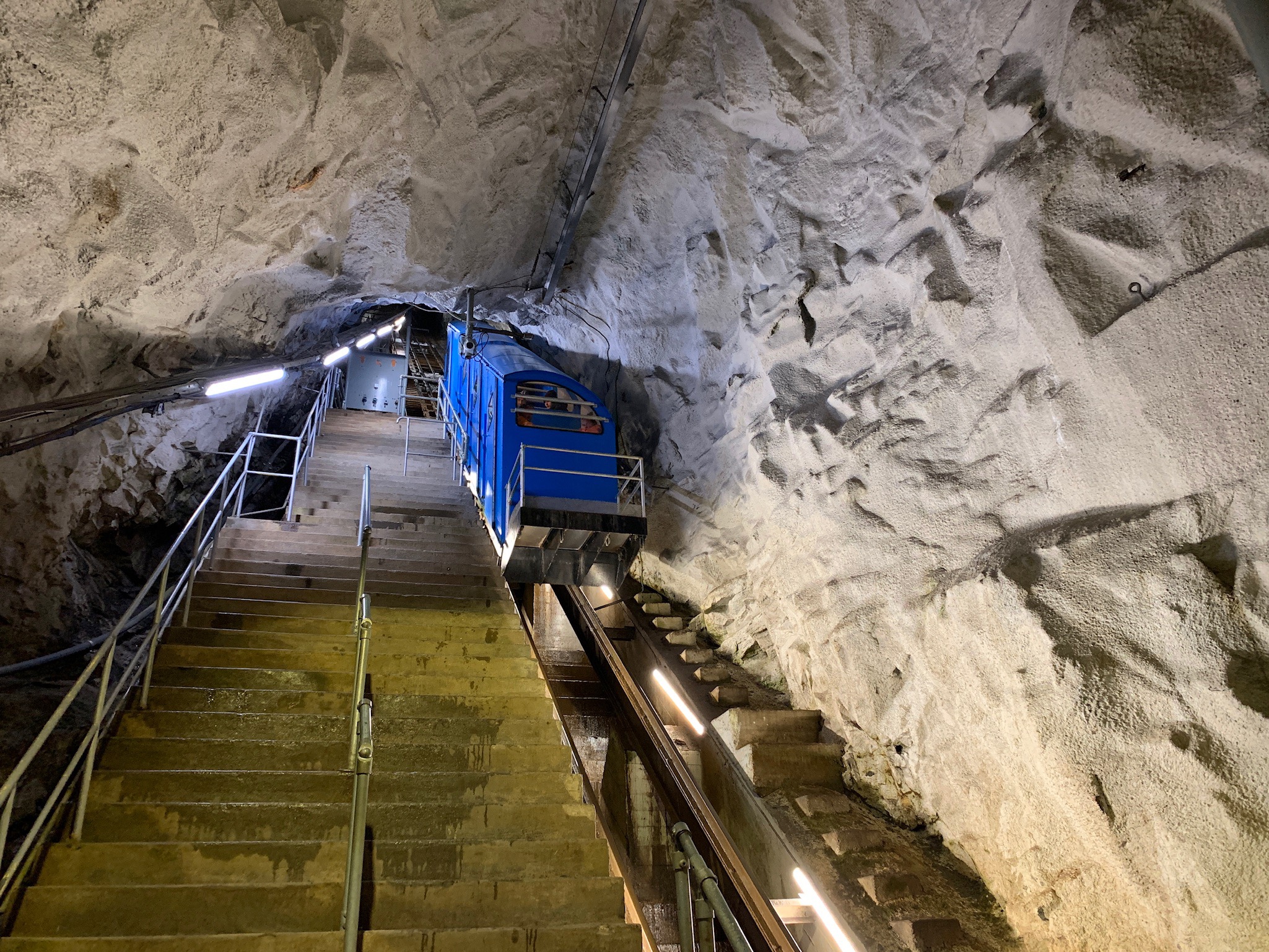 Man kann den Berg natürlich auch hochlaufen, wir entschieden uns mit Lotti aber vorerst für die abenteuerliche Variante "Zug". Zuerst fährt man auf rumpeligen Schienen 850m geradeaus in den Berg. Dann muss man aussteigen und das Gefährt wechseln. Dies ist nicht weniger spektakulär. Es geht einen Kilometer in 39 Gradwinkel direkt nach oben. Die Bahn wird an einem Kabel hochgezogen. An jedem Ende hängt eine Bahn, in die Mitte begegnen sie sich.