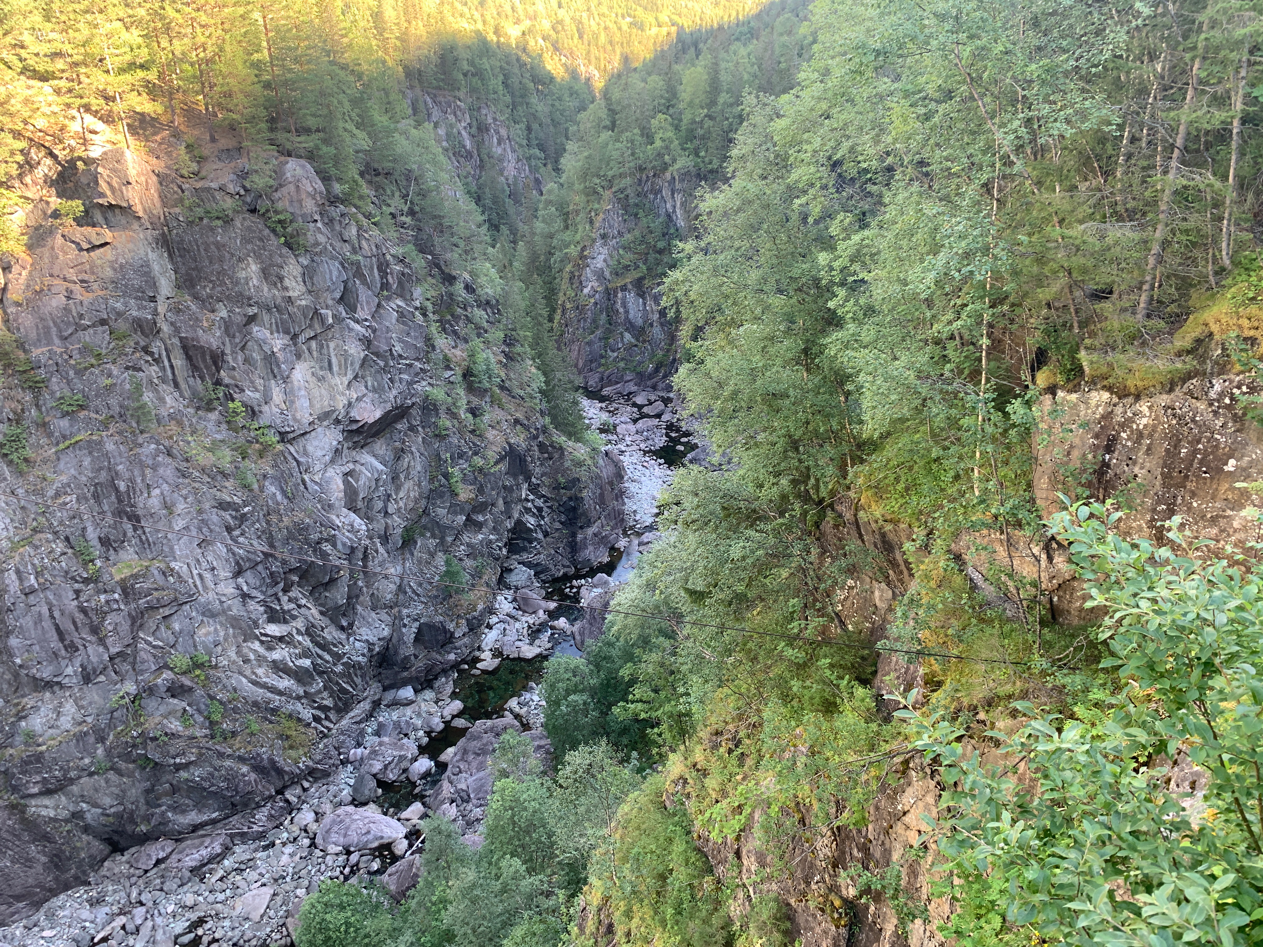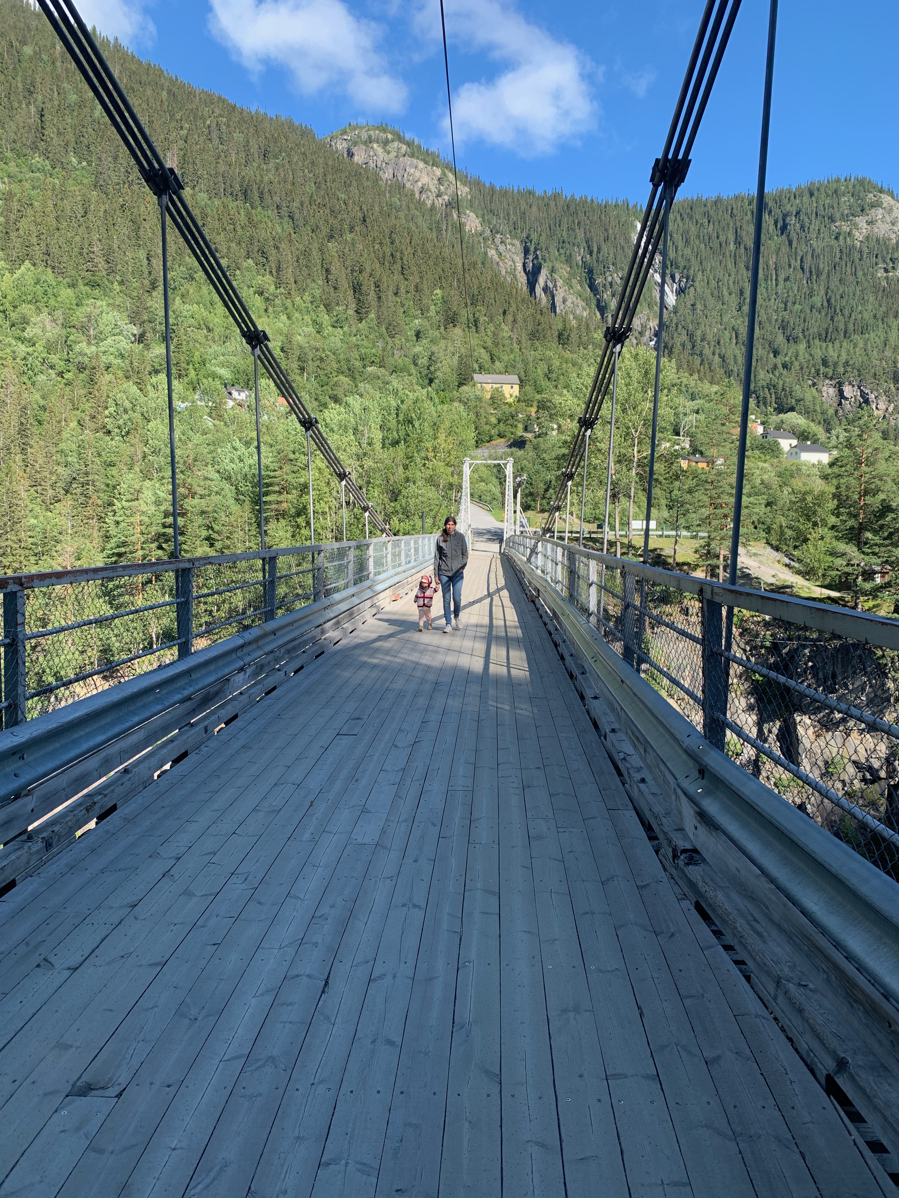 Geschichtlich ist das wohl auch aus deutscher Sicht ganz interessant, Stichwort schweres Wasser im zweiten Weltkrieg, aber die Details sind für uns heut nicht so spannend. Wir spazieren noch zu Lottis großer Begeisterung über die Hängebrücke, die das Tal überspannt. Dann fahren wir zur Mittagspause aber tatsächlich auf den Campingplatz.