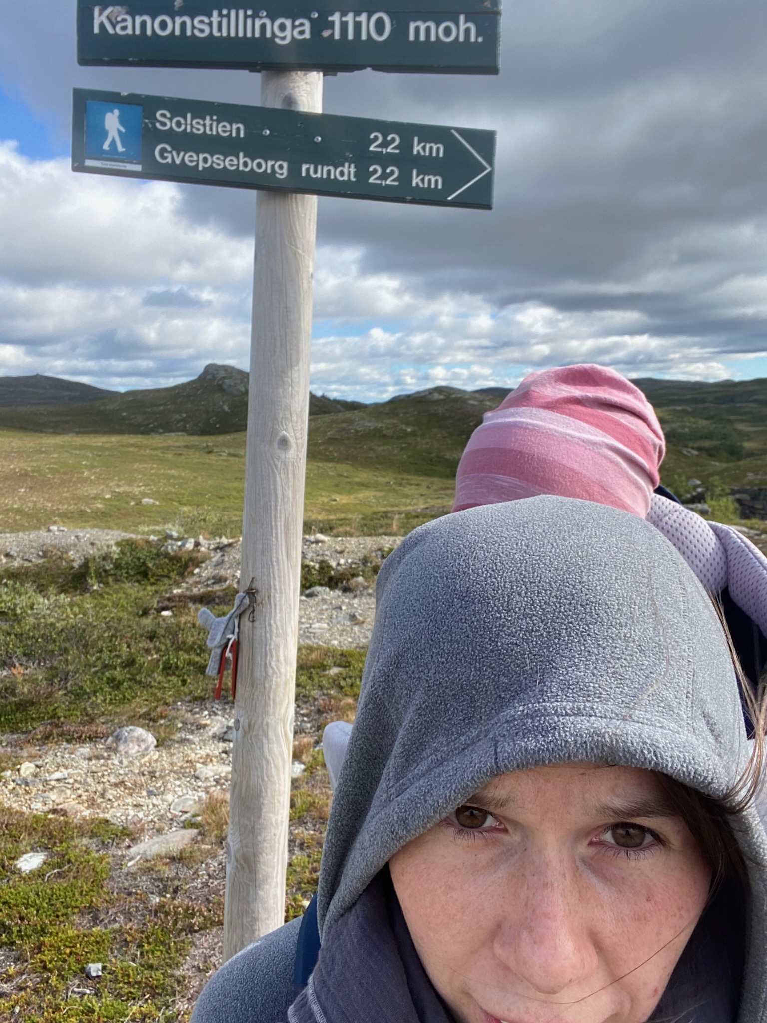 Hier oben ist es ganz schön windig und auf der anderen Talseite hat es angefangen zu regnen. Wir halten uns daher nicht allzu lange am Gipfel auf, sondern treten den Rückweg an. Während wir so den Berg herunter schlendern ist es Lotti im Rucksack zu langweilig geworden und sie ist eingeschlafen.