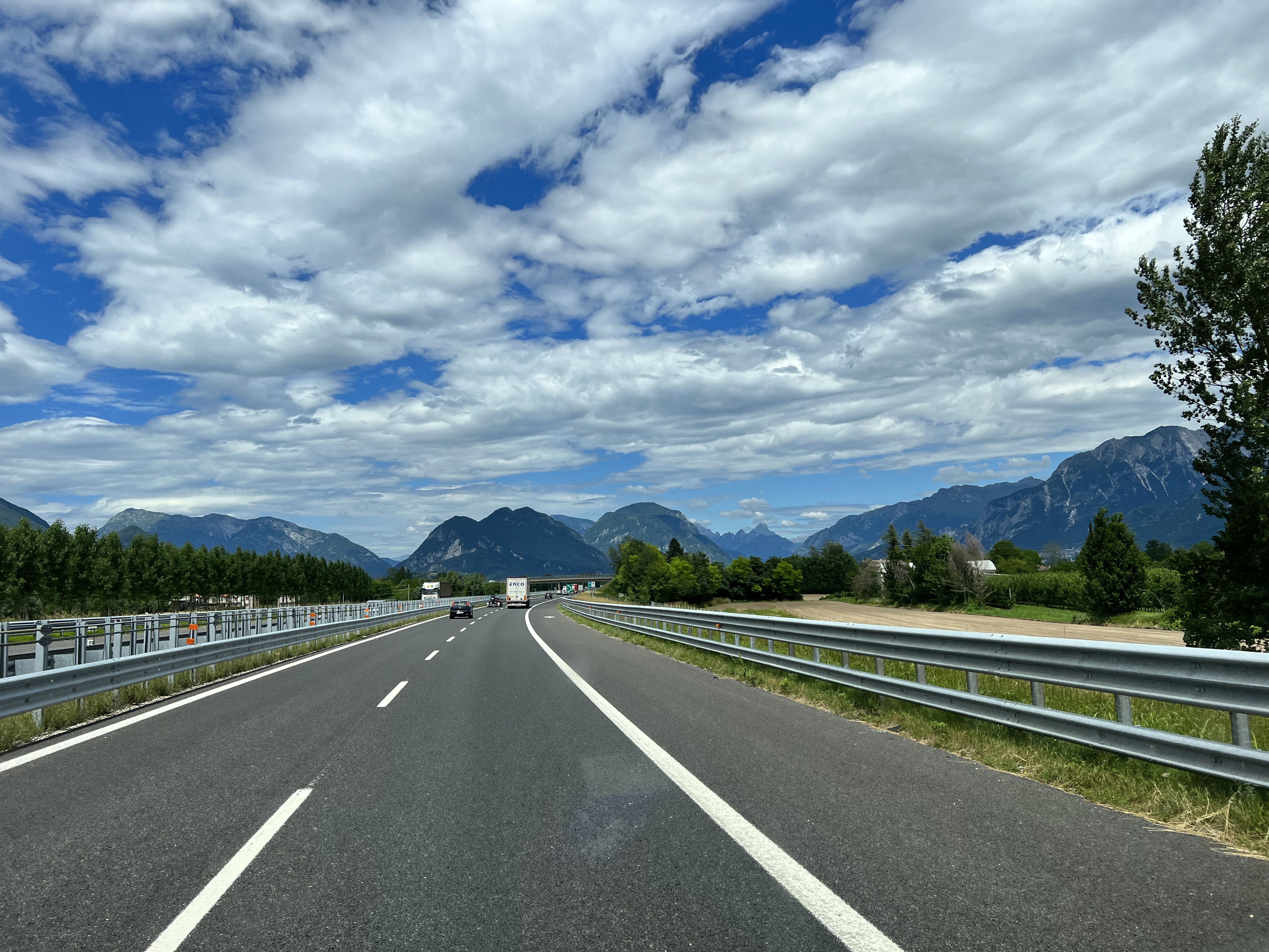 Am Wohnmobil angekommen, gibt es für Theo schnell eine Portion Mittag, sodass er die circa zweistündige Fahrt die vor uns liegt, für seinen Mittagsschlaf nutzen kann. Es dauert nicht lange, da ist sein Glas leer gegessen und wir sind Abfahrtbereit. Es geht mal wieder über eine Mautstraße - jetzt allerdings schon wieder Richtung Norden. An den ersten Schildern entlang der Autobahn ist Österreich schon wieder ausgeschildert. Auch an den Kennzeichen ist zu erkennen, dass wir uns der Grenze nähern. Auch die Landschaft verändert sich ziemlich rasant. Wo wir gerade noch am Ozean waren, befinden wir uns nun schon wieder in den Bergen.