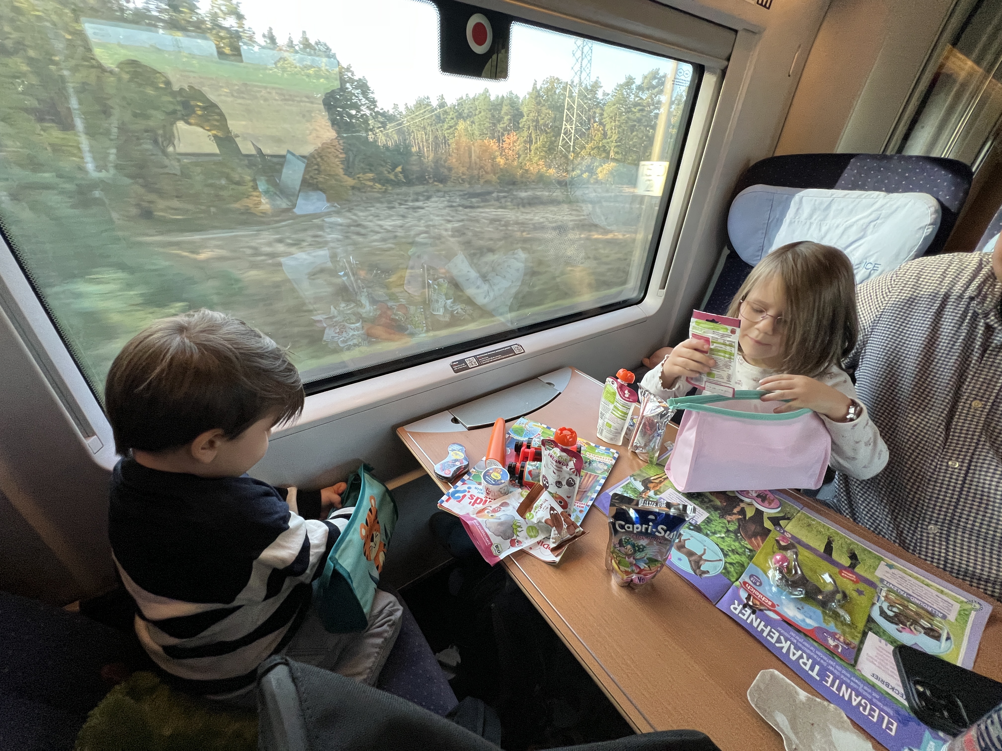 Normalerweise ist die Reise von Berlin nach Hamburg mit der Bahn ja gar kein Problem, im Moment verlängert sich die Reisezeit aber fast auf die doppelte Zeit - und so bekommen wir auf der Fahrt schon einen ersten Vorgeschmack auf das, was uns auf dem Rückflug (vermutlich) erwarten wird. Die erste Stunde sitzen Lotti und Theo noch am Tisch und beschäftigen sich abwechselnd mit ihren Pesto-Baguettes und den am Bahnhof gekauften Zeitungen. Irgendwann ist dann aber jede Geschichte gelesen und es wird langsam wuseliger an unserem Tisch. Wir sitzen aber im Familienabschnitt des Zuges, der heute allerdings nur von arbeitenden Menschen genutzt wird. Die müssen dann jetzt damit leben, dass die Schiebetür in der verbleibenden Reisezeit noch einiges zu tun bekommt.