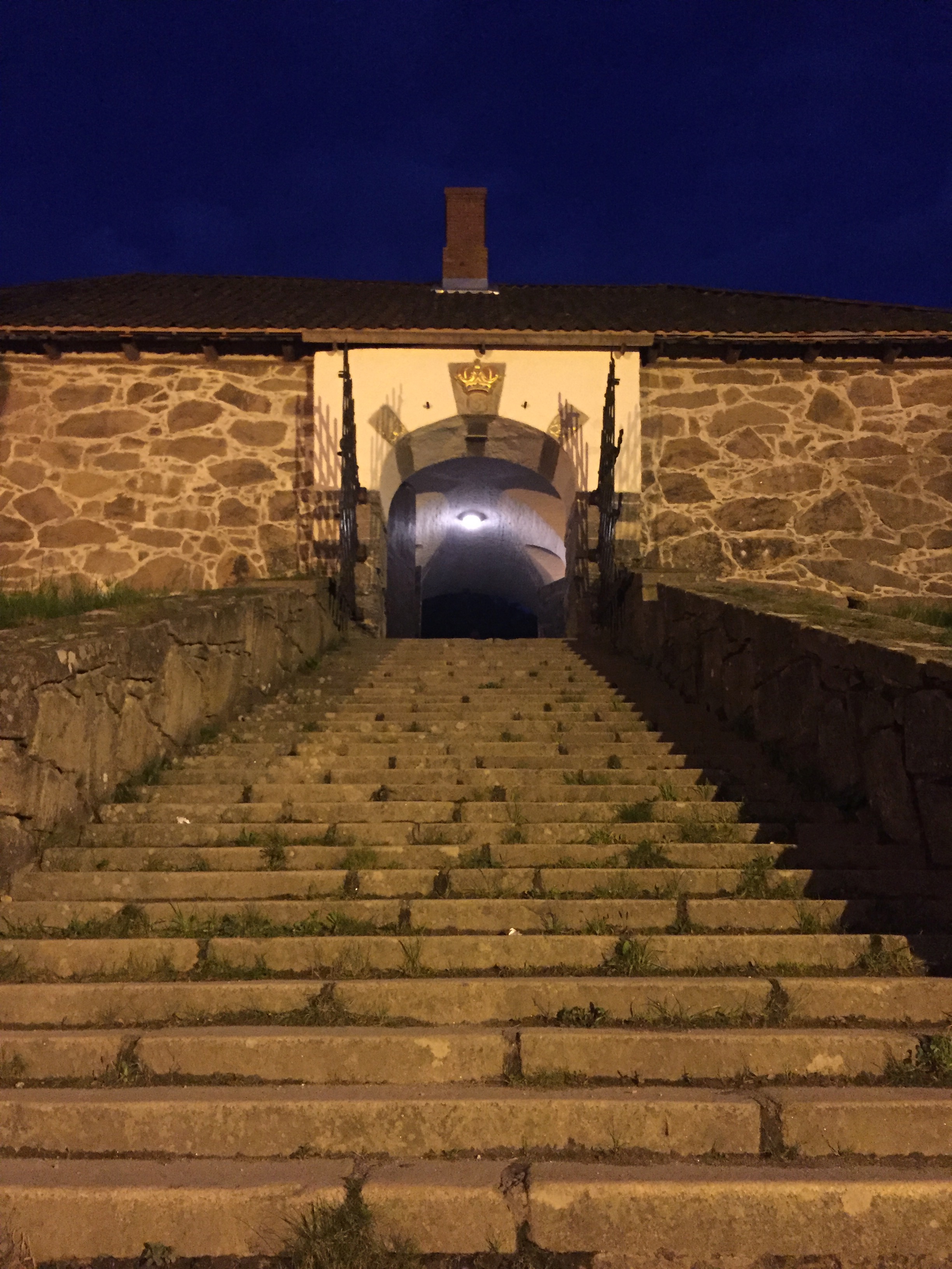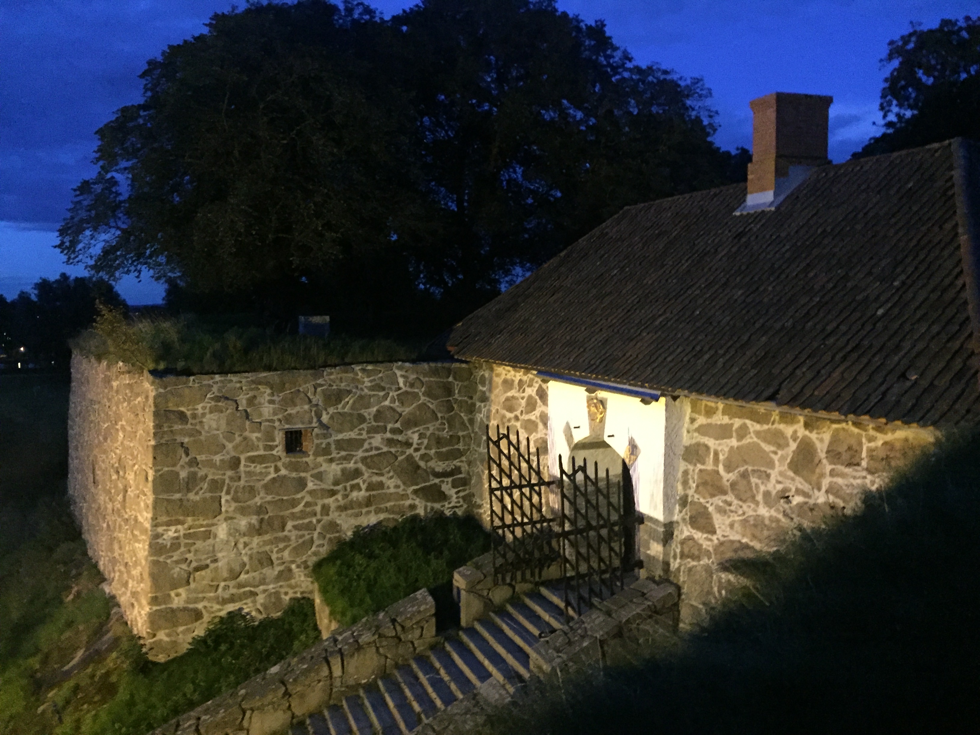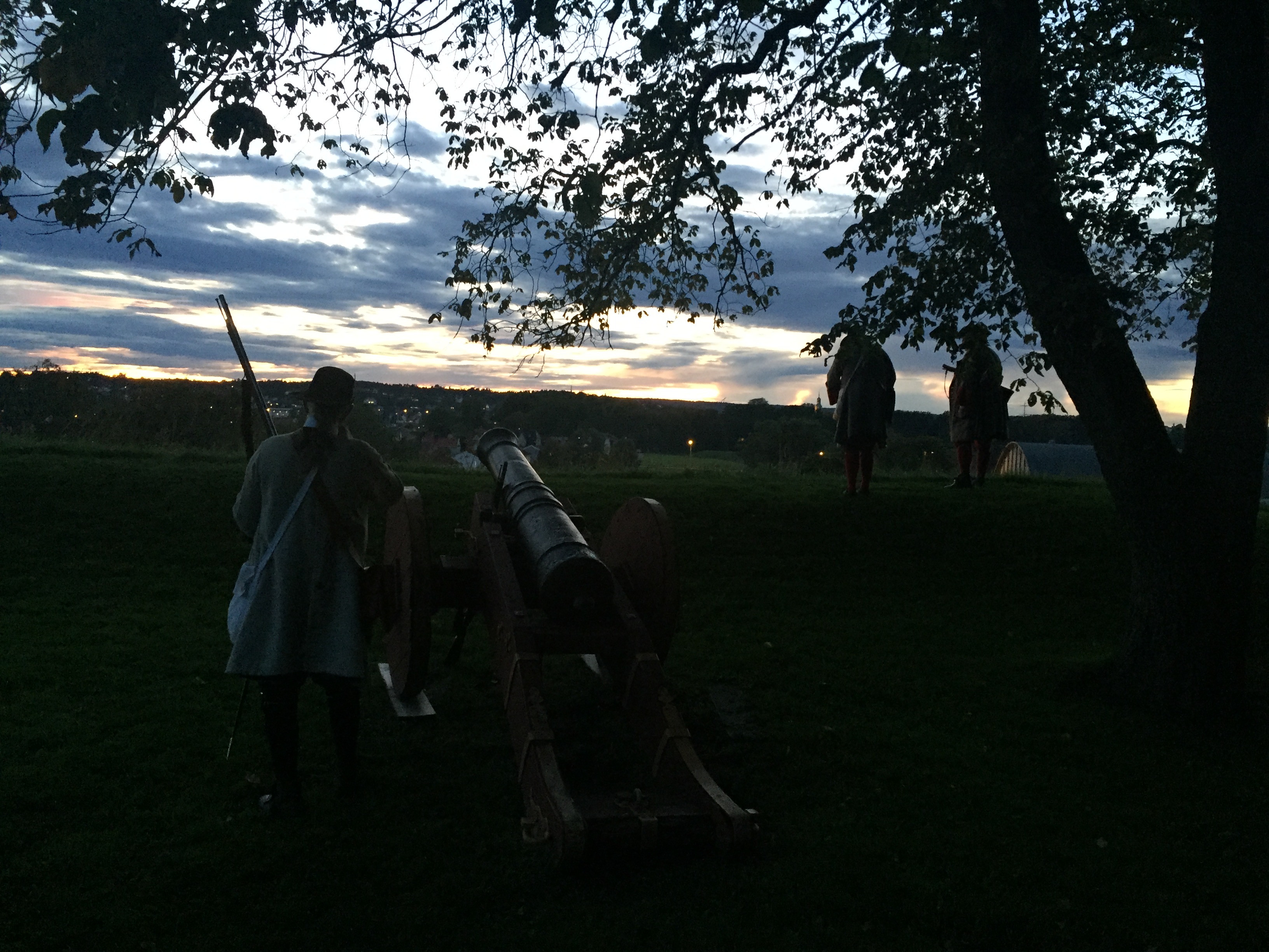 Zurück auf dem Campingplatz ertönten immer wieder laute Knalle und wir wunderten uns stark was das war. Schon in der Stadt hingen überall Fähnchen für das Fredrikstad-Fest, das diese Woche stattfindet. Da unser Campingplatz direkt am alten Fort liegt, sind wir dort schnell mal hin um zu gucken ob die Geräusche von dort kamen. Wir lagen Gold richtig. Schon auf dem Weg nach oben qualmte es aus der Richtung. Männer in Verkleidung von früher liefen über die Fortmauern und hatte Gewehre dabei.