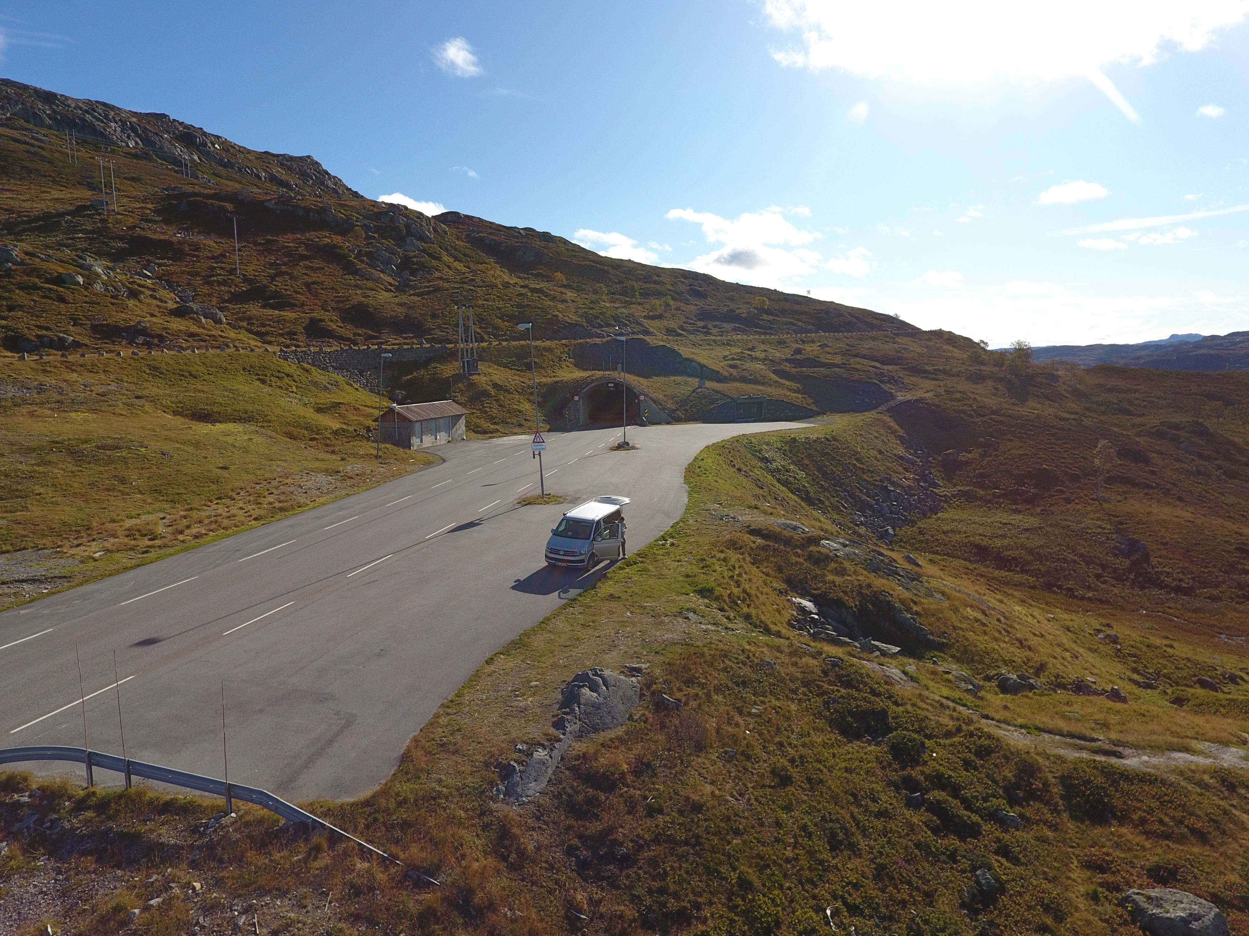 Gegen 10:00 machen wir uns auf den Weg. Der schon etwa 30Minuten später gestoppt wurde. Nicht etwa, weil uns etwas passiert wäre, sondern einfach, weil wir so beeindruckt von der Umgebung waren. Völlig unbemerkt fuhren wir bereits wieder auf 1.000m Höhe, umgeben von schneebedeckten Bergen und Seen. Und da heut tatsächlich mal ununterbrochen die Sonne scheint, erschien der Moment ideal für die Drohne. Wir fuhren extra nochmal den Tunnel zurück, um Karlson gut am Straßenrand parken zu können.