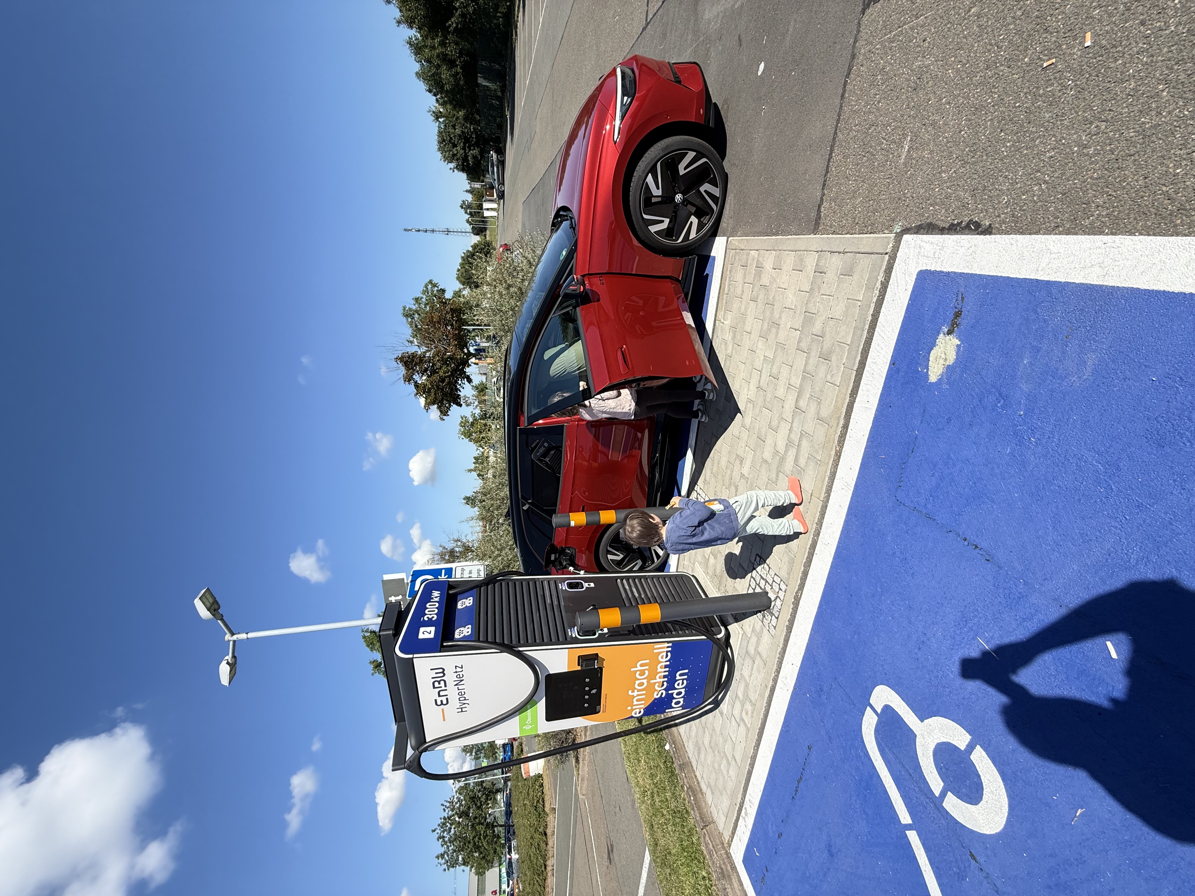 Unseren ersten Ladestop machen wir dann um 11 Uhr in der Nähe von Jena. Wir sind zwar kurz versucht, hier noch Freunde zu besuchen, entscheiden uns dann aber doch für die Weiterfahrt. Vor allem mit Blick auf die noch zu fahrende Strecke. Während unser Auto lädt besuchen wir das kleine Einkaufszentrum um uns ein paar Getränke für die Fahrt zu kaufen und die Toiletten zu nutzen. Das schaffen wir gerade so, bevor der Akku wieder ganz voll ist. Wir haben also nicht auf das Auto gewartet, sondern unser ID auf uns.