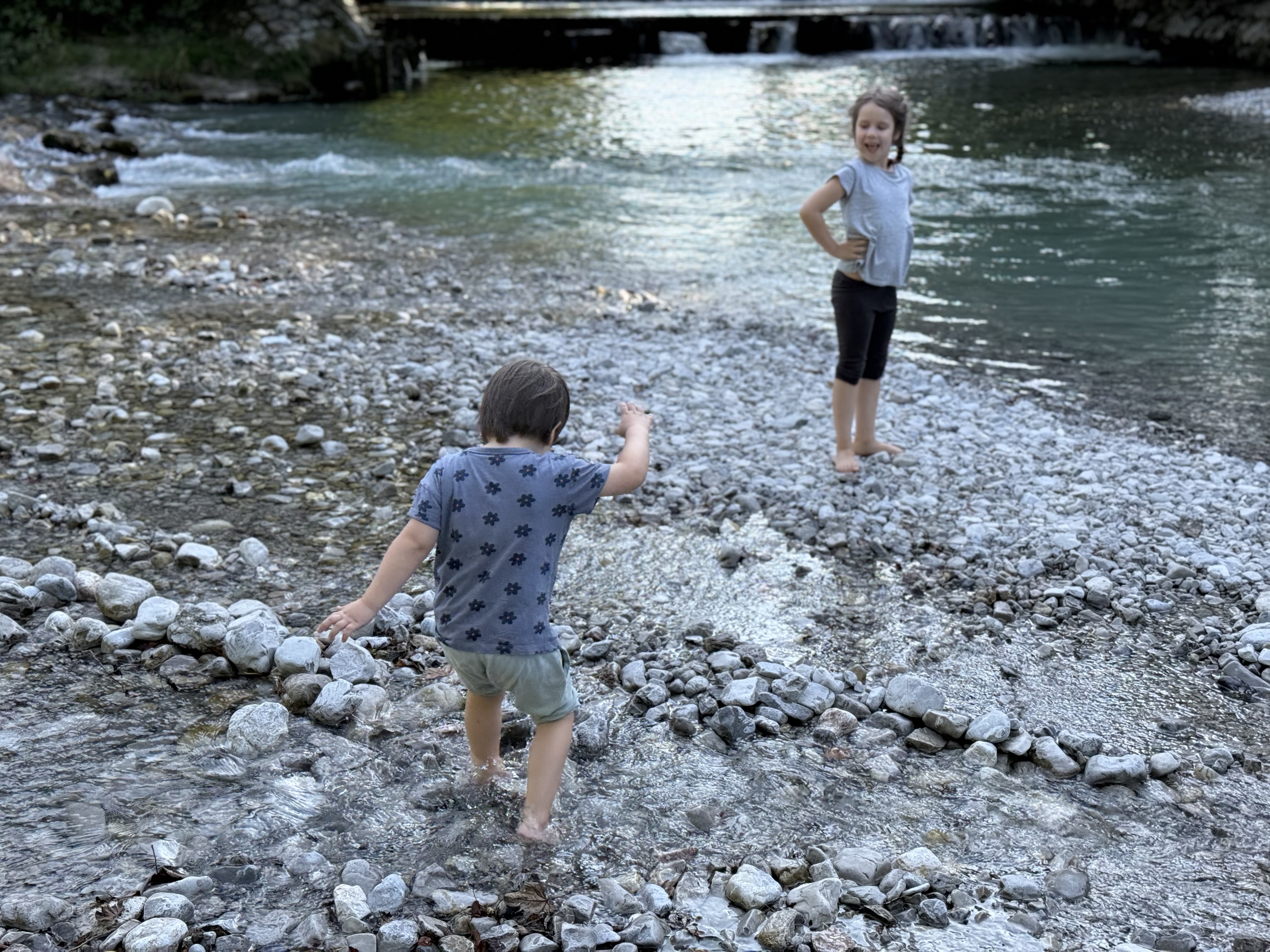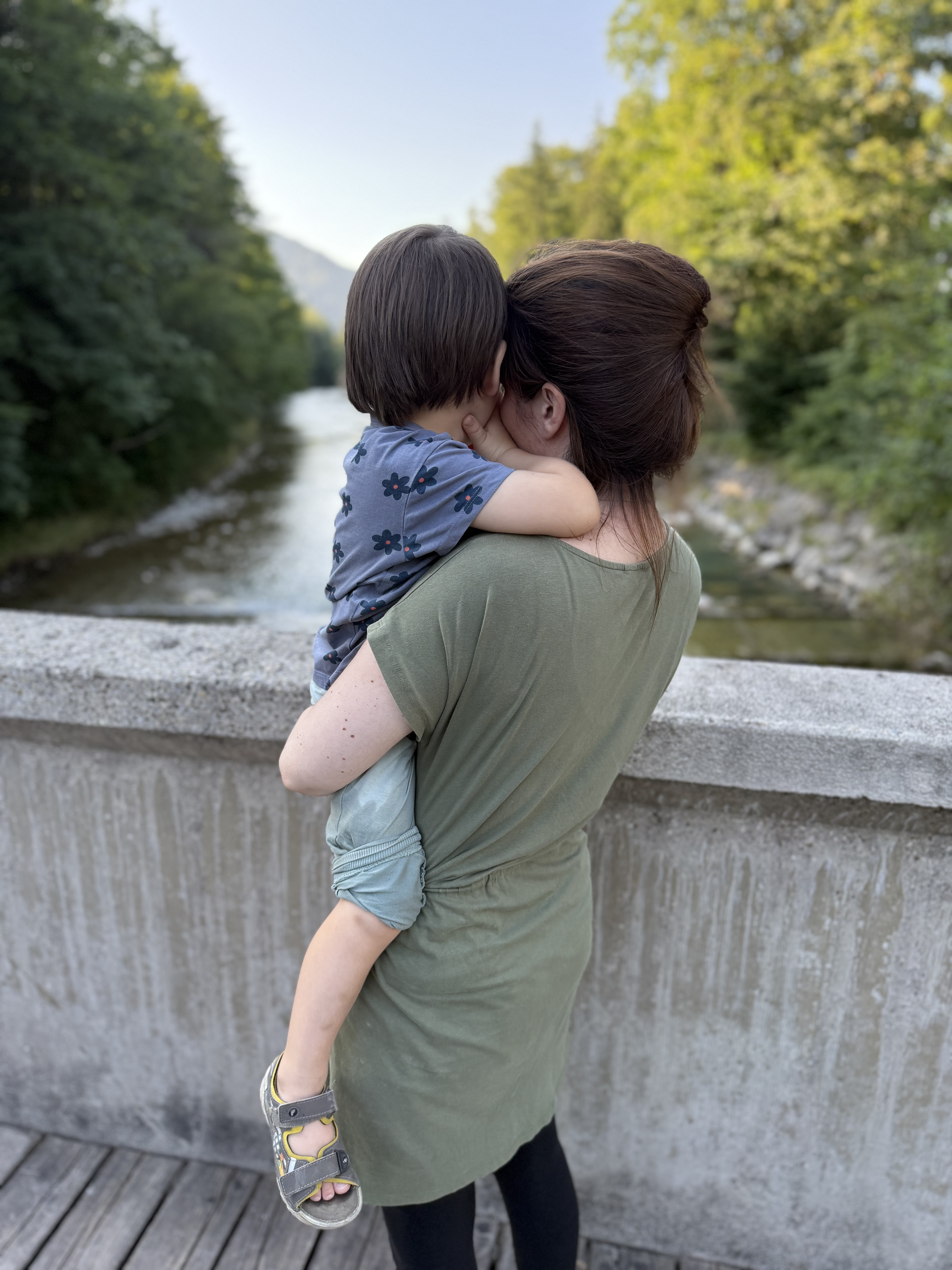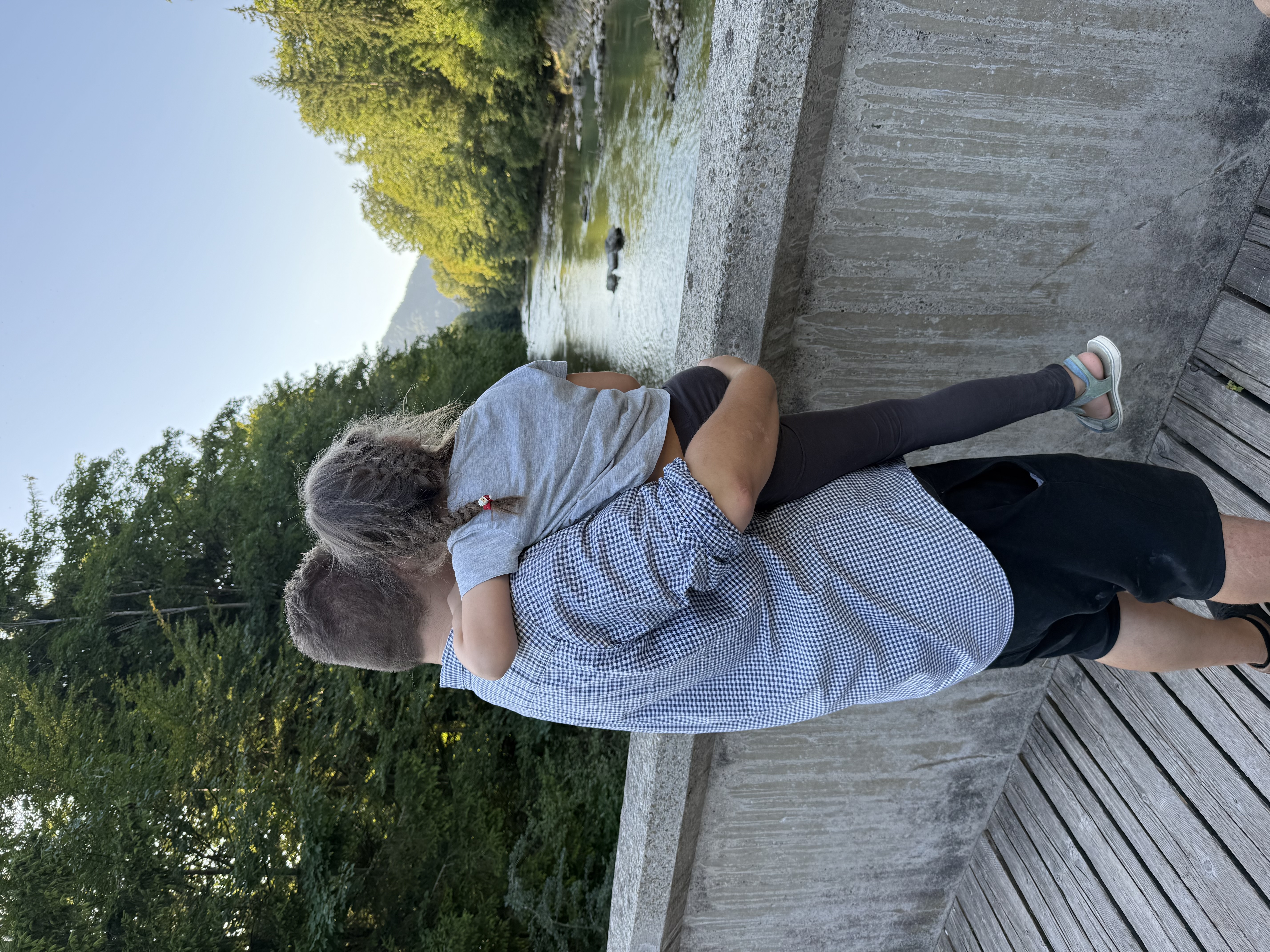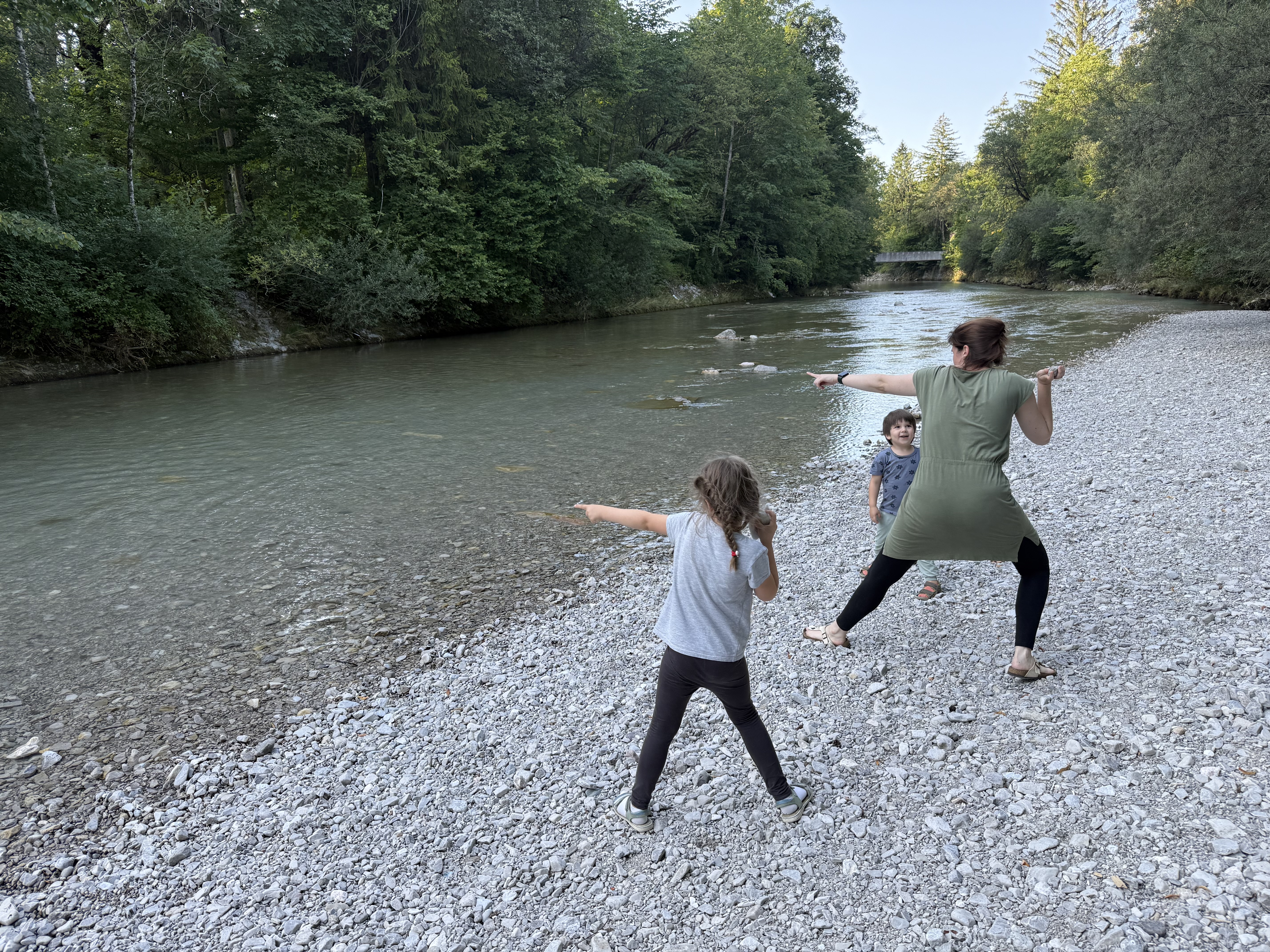 Unsere kleine Ferienwohnung die hier lediglich für eine Nacht gebucht haben müssen wir dann auch erst mal finden. Weil ja auch niemand mehr da ist den man fragen kann, gestaltet sich das erstmal schwierig. Nachdem wir kurz die ganze Wohnung angeschaut haben, entscheiden wir aber alle, dass wir noch etwas Bewegung brauchen. Wir fahren also noch mal die 5 Minuten zurück nach Ruhpolding und laufen ein Stück am Fluss entlang. An dessen Ufer vertreiben wir uns dann noch die Zeit mit dem Flitschen von Steinen und halten sogar die Füße in das kalte Flusswasser.