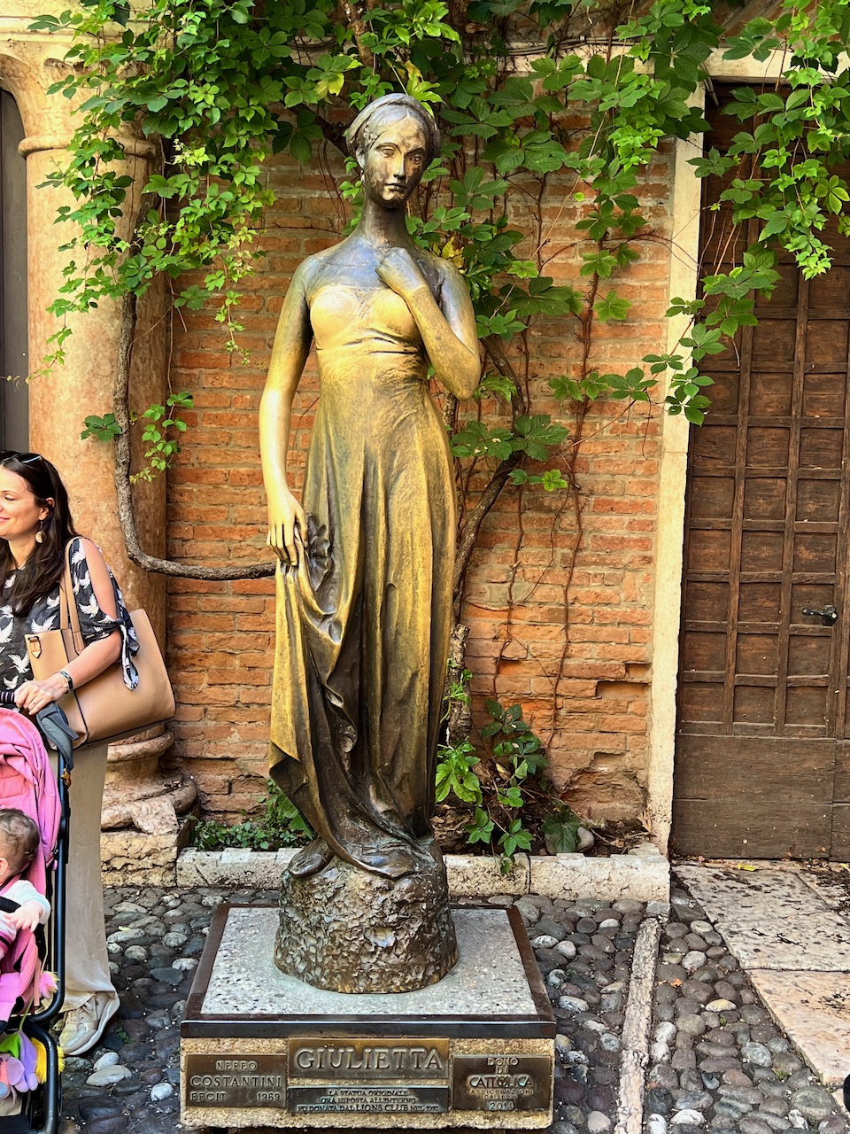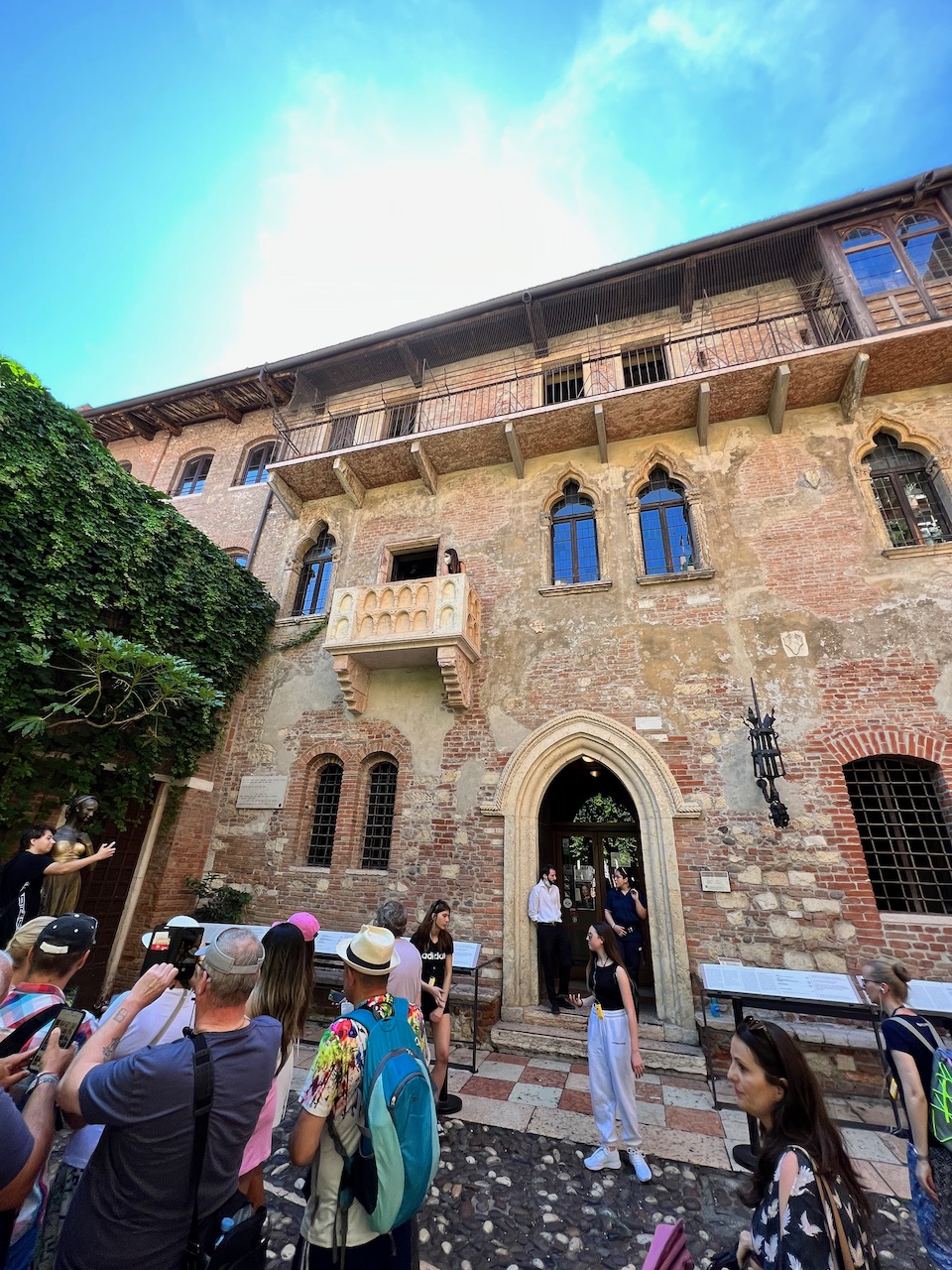 Das nächste Ziel muss natürlich der Balkon sein, von dem aus Julia ihrem Romeo die ewige Liebe versprach. Das Haus in dem die Familie Capulet vor gut 500 Jahren residierte ist heute relativ versteckt in einer kleinen Seitengasse. Man erkennt den Eingang zum Hof eigentlich nur an den Menschenmassen die in diese Richtung strömen. Vor Ort findet man dann eine ziemlich abgegrabbelte Julia-Statue und den berühmten Balkon. Hier hat man dann das Vergnügen alle paar Sekunden eine neue „Julia“ zu sehen, die auf die Menschenmassen herunter blickt. Jeder Touri der den Eintritt dafür zahlt, darf hier auch mal ran. Wir lassen das lieber, und suchen nun das Haus der Familie Montague. Das ist allerdings weniger prächtig, und besteht im Grunde nur aus der Wand, hinter der das Anwesen mal stand.