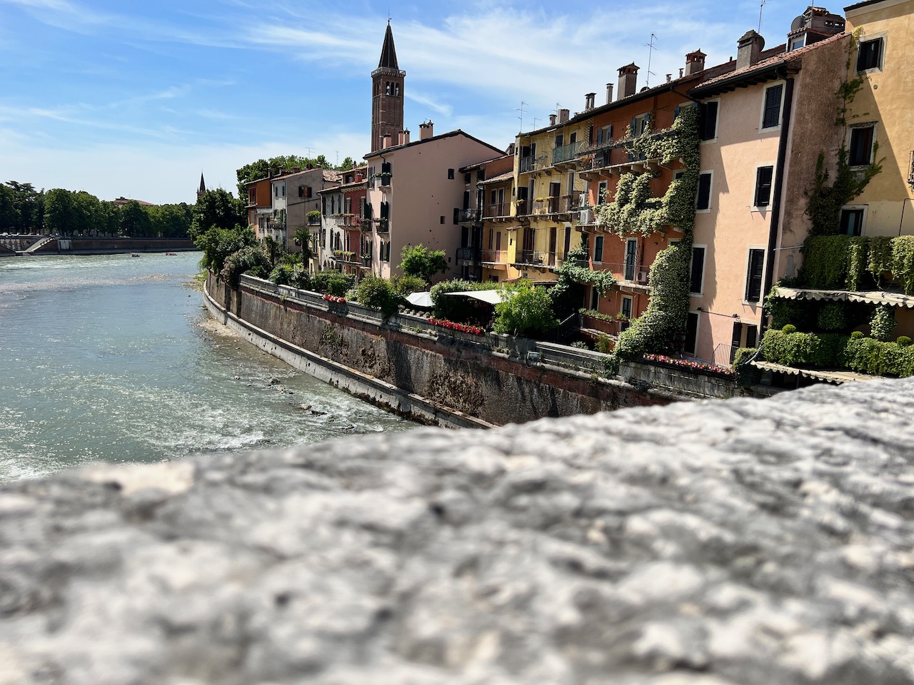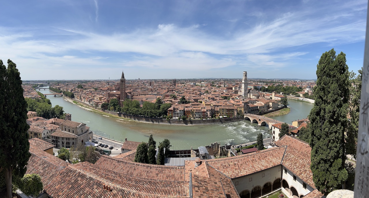 Von hier oben hat man eine wunderbare Aussicht auf ganz Verona. Theo beginnt zu diesem Zeitpunkt langsam mit seinem Mittagsschlaf. Während Jule ihn langsam ins Land der Träume befördert, genießt Lotti mit mir die Aussicht in alle Himmelsrichtungen. Ein „echter Italiener“ erklärt uns noch, dass man bei klarer Sicht sogar die Berge hinter der Stadt sehen könnte. Tatsächlich ist es in einiger Entfernung auf etwas diesig. Das ändert aber nichts an der 100% Sonnenscheingarantie die wir hier gebucht haben. Schatten spendet wenn überhaupt nur der aufgeheizte Beton der Häuser in den schmalen Gassen.