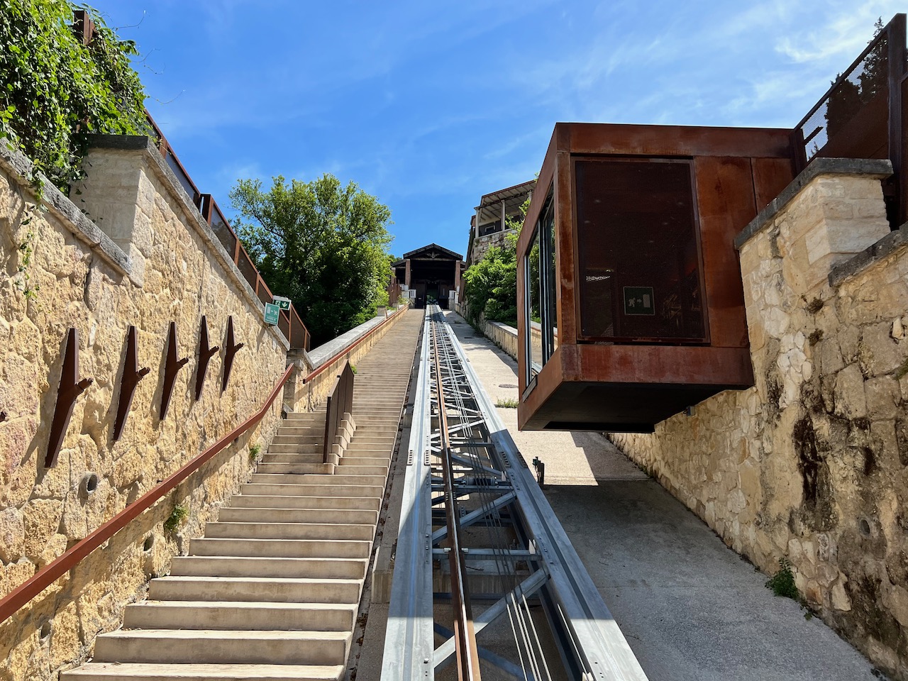 Von hier aus machen wir uns weiter auf den Weg zum Funicolare di Castel San Pietro. Eine Art Seilbahn die einem jede Menge Stufen auf dem Weg zum Schloss abnimmt. Schon auf dem Weg müssen wir Lotti gefühlte einhundert Mal versprechen, dass es keine Masten gibt, an denen die Gondel anfängt zu schaukeln. Allerdings handelt es sich hier ja um gar keine hängende Seilbahn, sondern um eine Art Fahrstuhl, der dann eine Schiene hoch fährt.