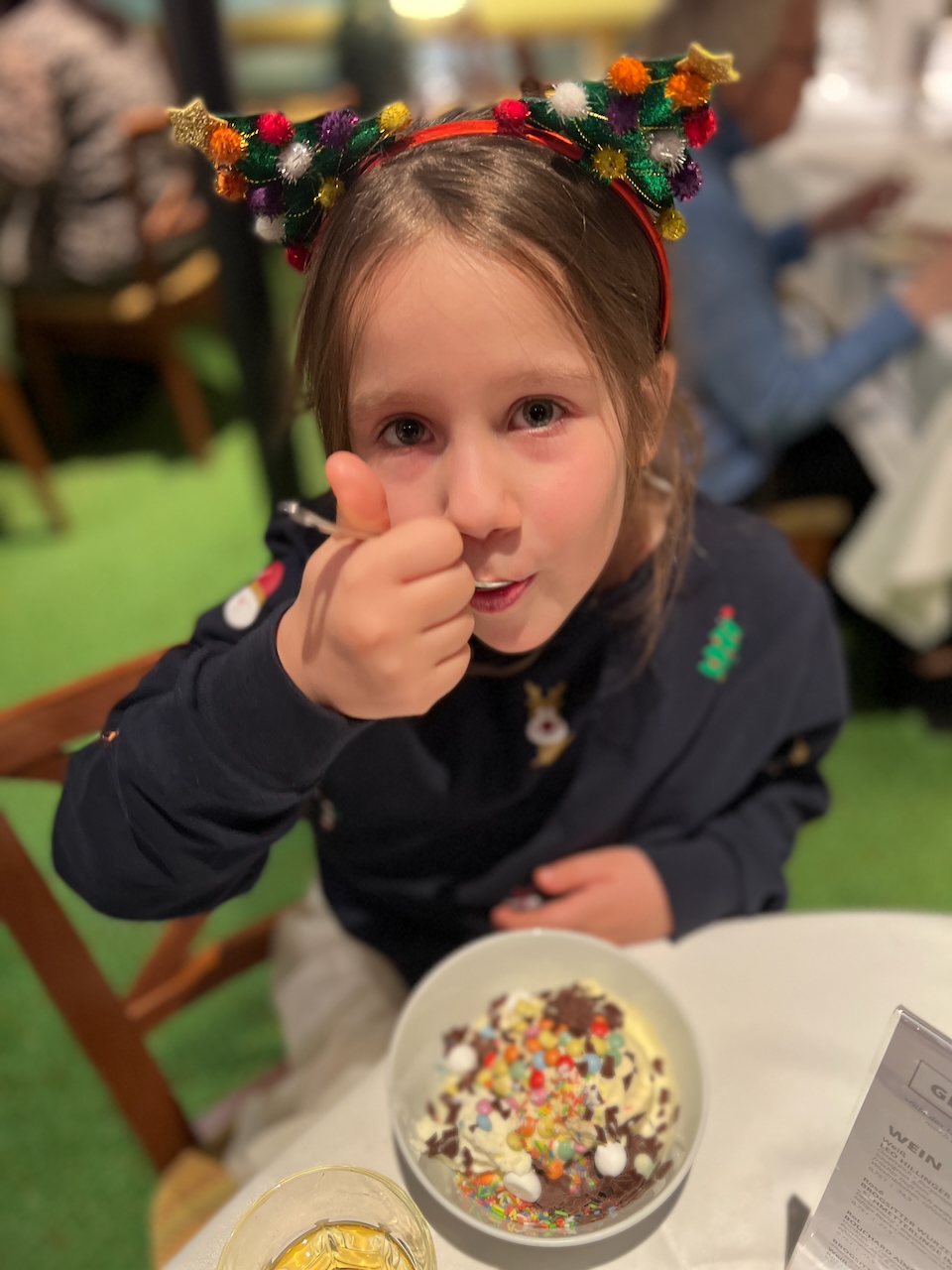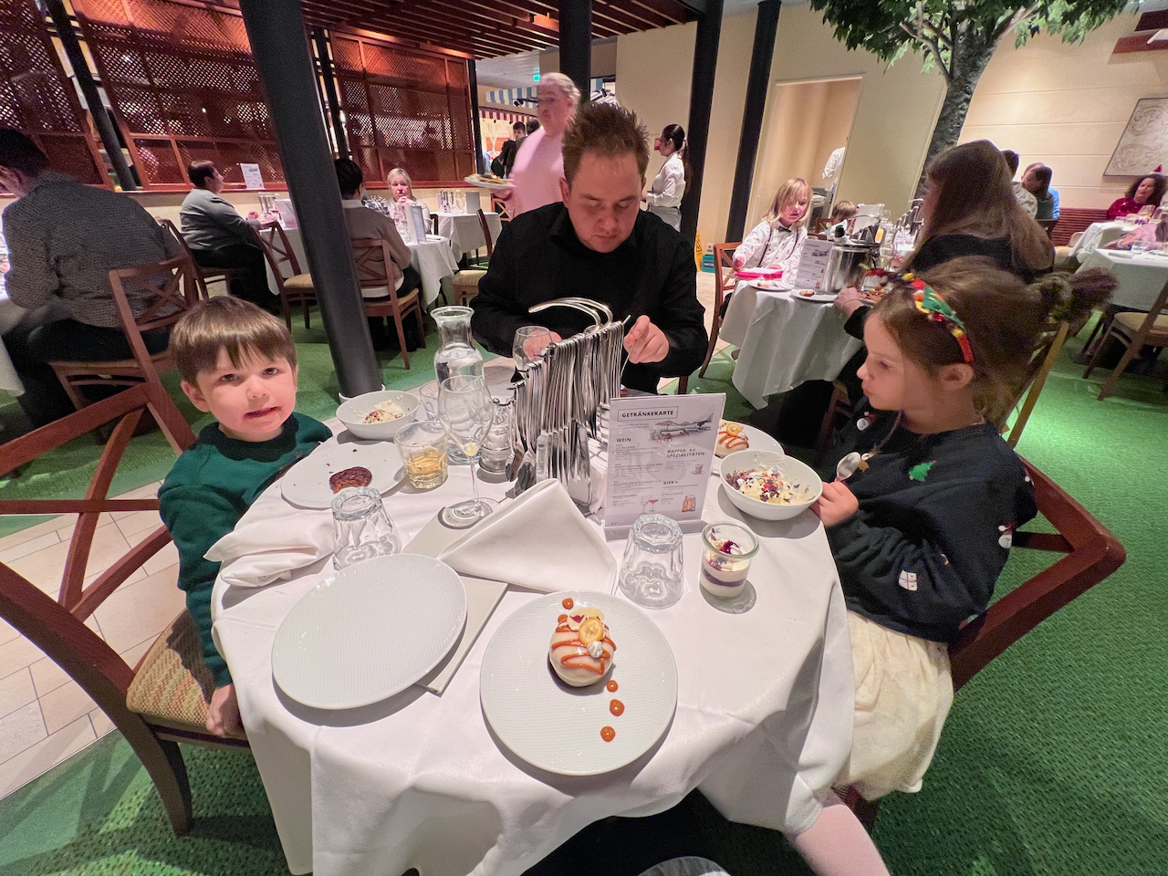 Wir haben es dann auch irgendwann zurück zum Schiff geschafft und freuen uns auf den Weihnachtsabend. Das Restaurant war natürlich schon zur Familienzeit brechend voll und eine riesige Schlange schlängelte sich am Buffet entlang und wartete auf die Gänsekeulen. Wir haben uns alle etwas gesucht und satt gegessen. Natürlich durfte das Aida Weihnachtsdessert nicht fehlen.