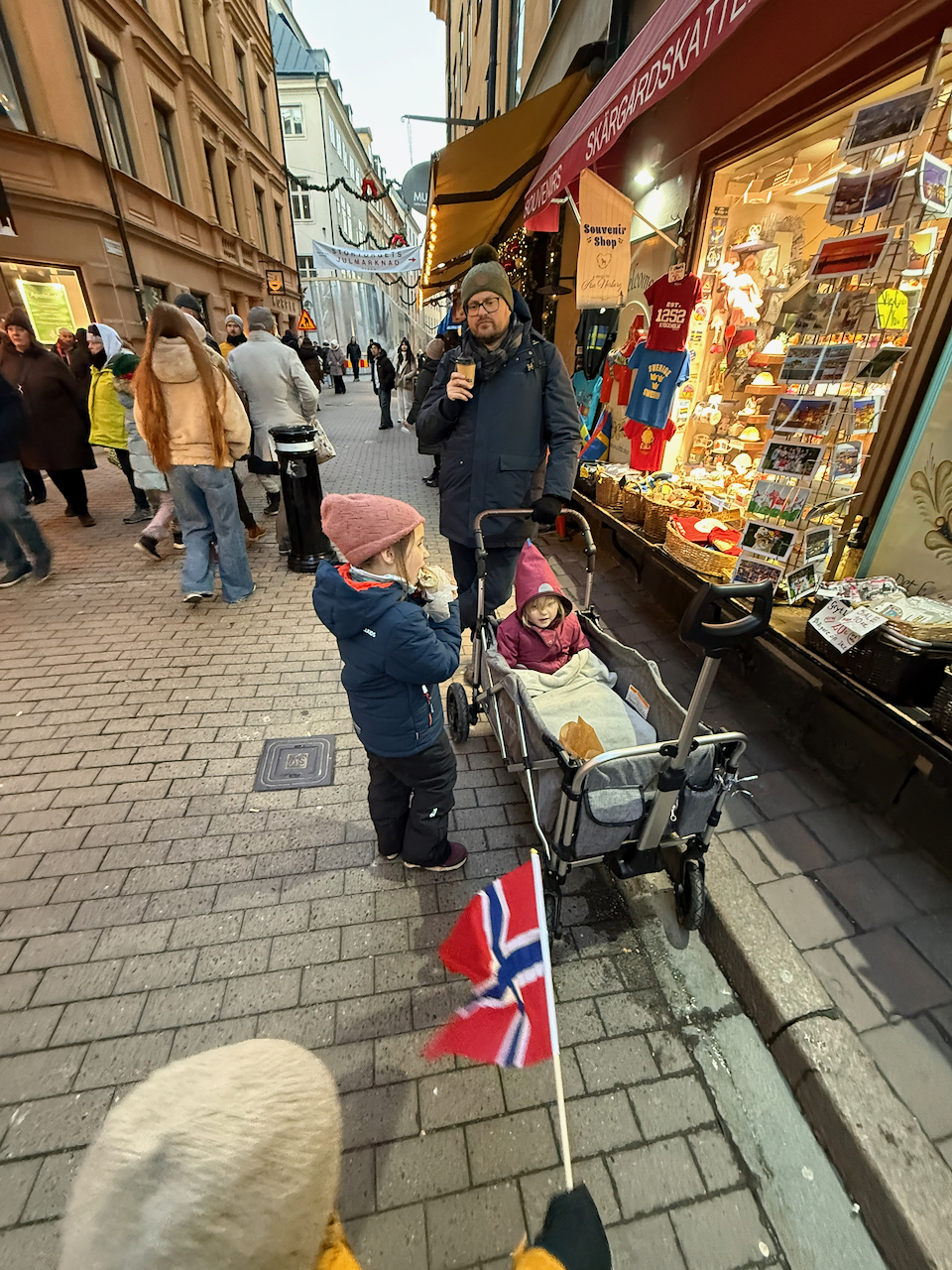 Am Palast selbst bleiben wir kurz stehen. Wir glauben sogar, den König gesehen zu haben – zumindest fährt eine Kolonne dunkler Volvos an uns vorbei, sehr geschlossen, sehr offiziell. Sicher wissen wir es natürlich nicht. Dafür erleben wir den Wachwechsel vor den Toren des Palastes. Ein ruhiger, fast feierlicher Moment, der uns kurz innehalten lässt, bevor wir weiterziehen. Bei den Kinder löst das Szenario auch tausend Fragen aus, die wir versuchen auf dem Weg einzufangen und zu besprechen. Da wir nun aber direkt in der Altstadt sind, werden die Fragen schnell weniger, weil die Schaufenster spannender sind.