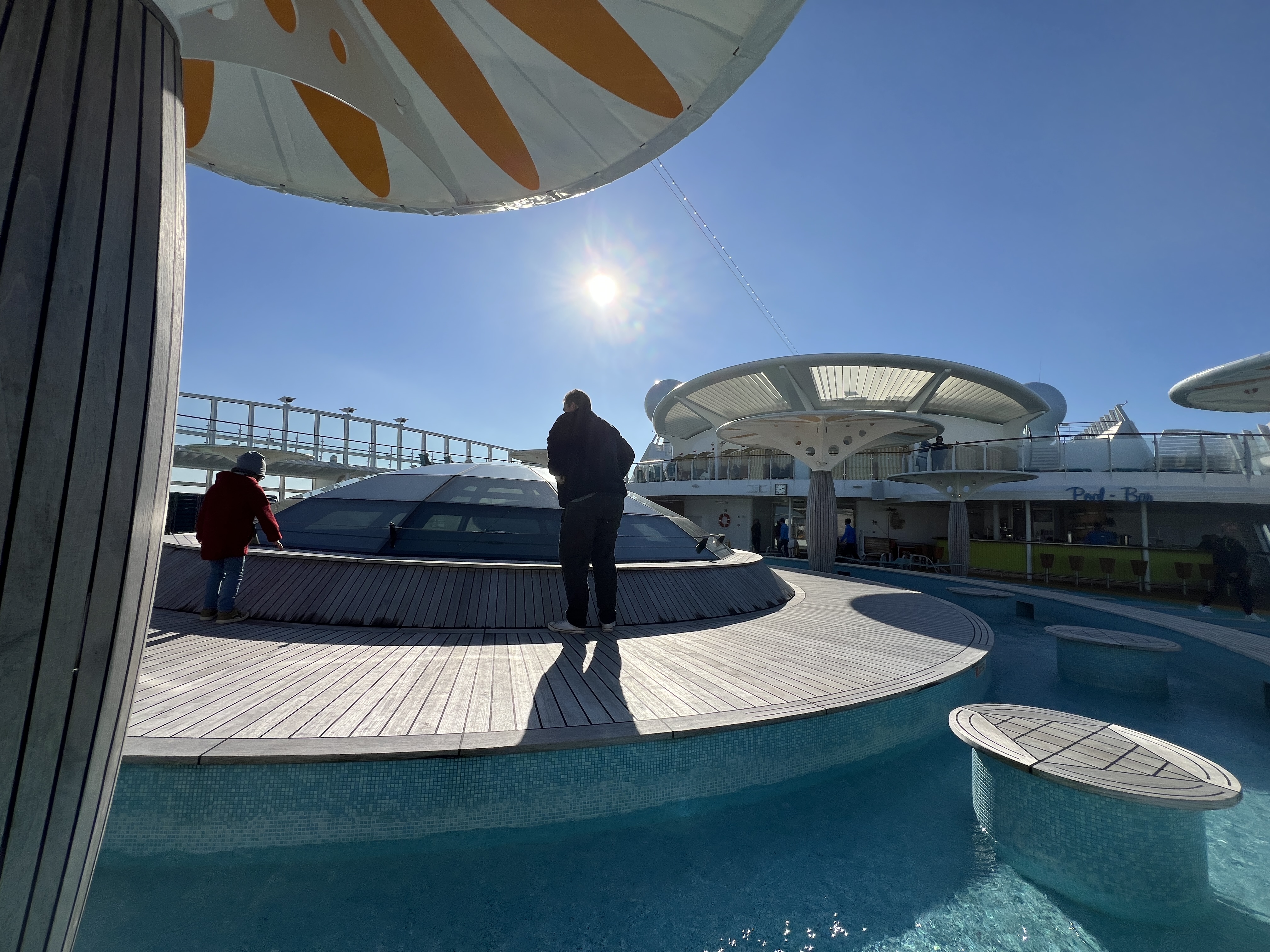 Nach dem Mittagessen haben eine kurze Ruhepause in der Kabine eingelegt. Bevor wir die Zeit am Nachmittag nutzen wir um alle vier noch die restlichen Ecken des Schiffes zu erkunden. Der strahlende Sonnenschein ermöglicht dabei auch den ein oder anderen Gang durch die Außenbereiche. In einer windstillen Ecke gibt es dann einen Milchshake.