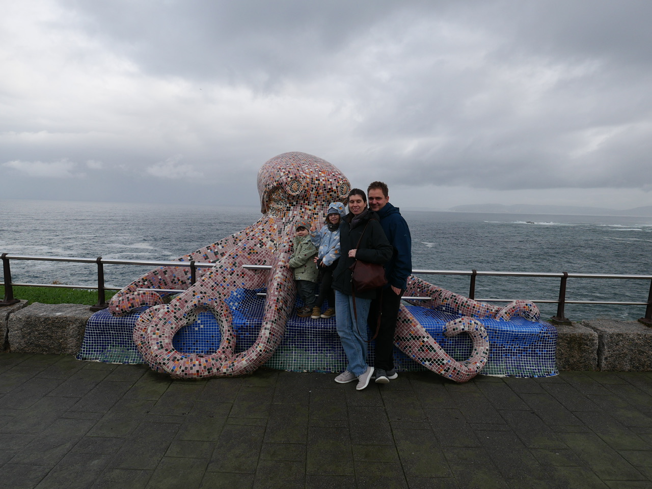 Dann ließ Alberto uns bei der mit Mosaik besetzten Riesenkrake raus und schoss professionell Fotos mit dem Herkulesturm und dem Milleniumturm im Hintergrund. Natürlich waren auch wir auf dem Bild.