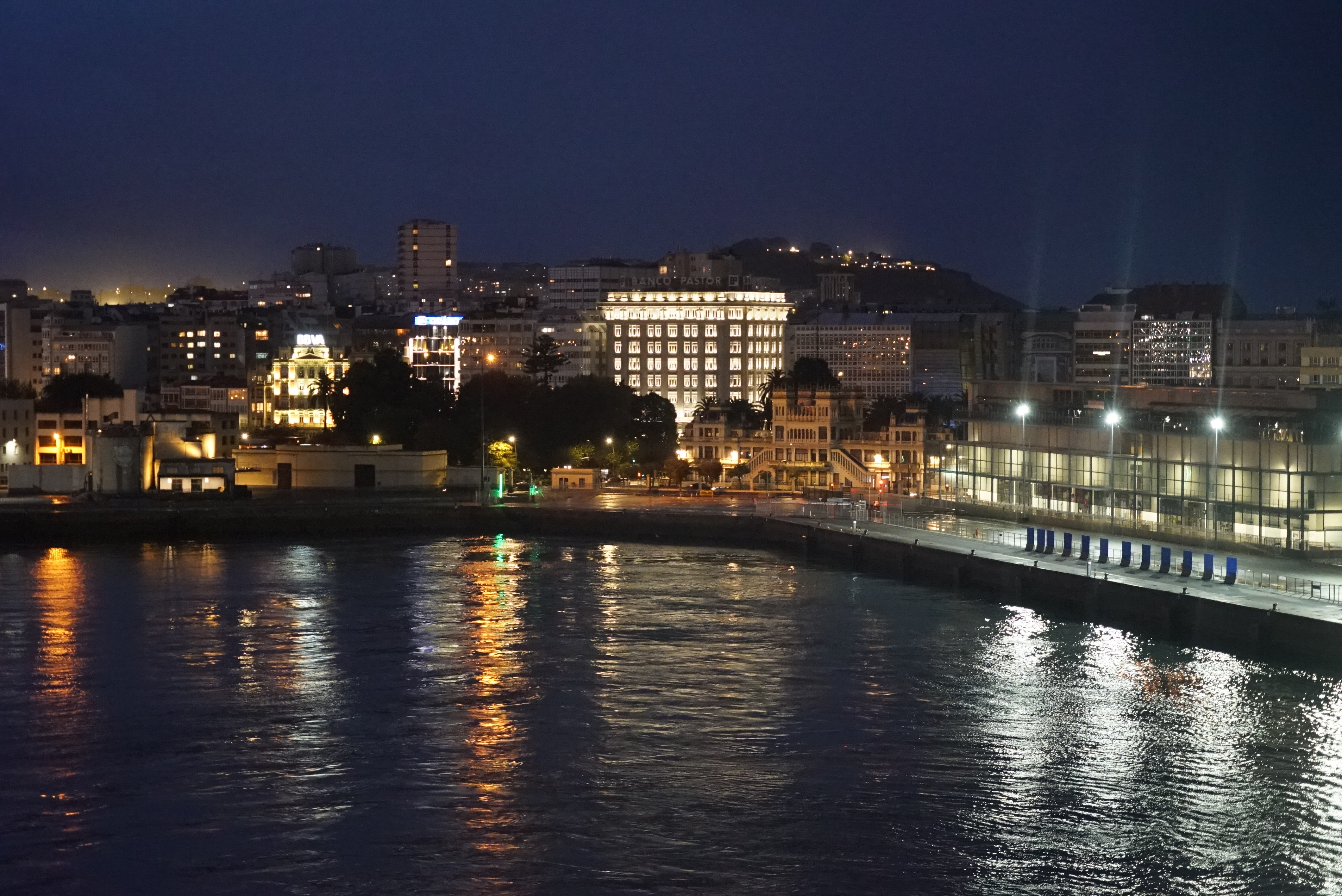 Endlich Land in Sicht! Wir haben die Biskaya mehr oder weniger gut verkraftet und schaukeln uns am Morgen in den Hafen der galizischen Stadt A Coruña. Pünktlich zur Freigabe des Schiffes, fängt es an zu regnen. Der Regen soll uns laut Morgenreport des Kapitäns auch den ganzen Tag immer mal wieder begleiten.