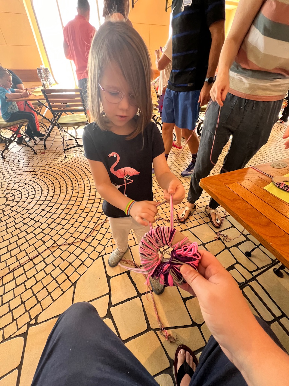 Nach dem wir gestern ja schon super coole Piratenhüte gebastelt haben, ist heute Monster-Bastel Zeit. Man kann sich zwischen einer Gesichtsmaske und einem kleinen Wollmonster entscheiden. Wir basteln fleißig Wollmonster, welche dann später im Kids Club fertiggestellt werden sollen.