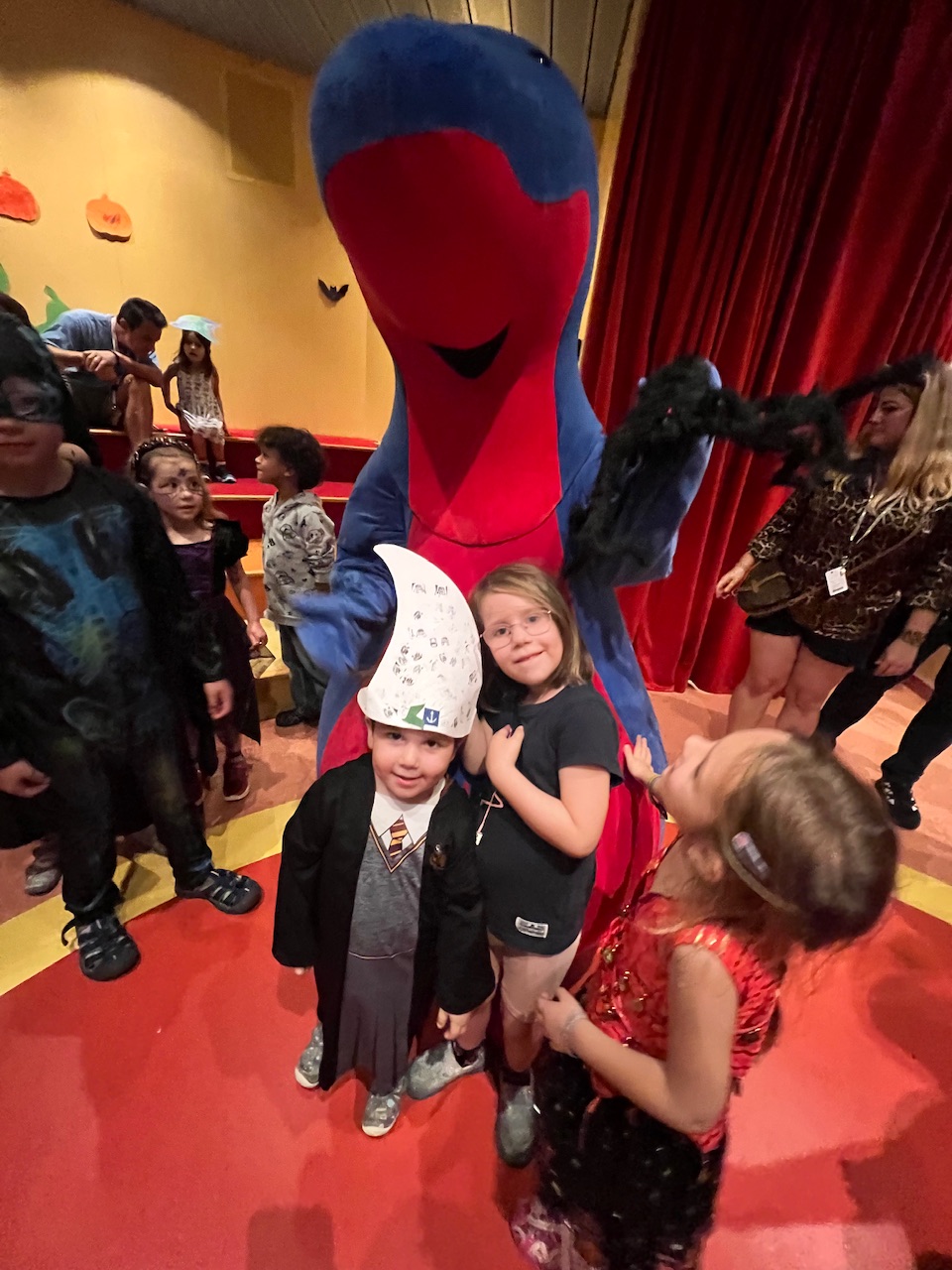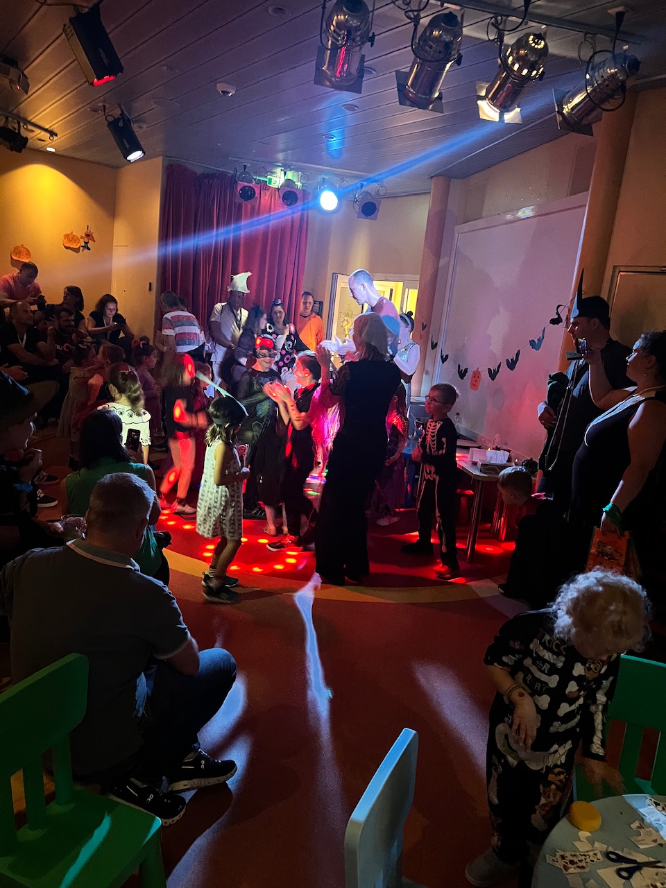 Viel Zeit war aber nicht mehr für Aktivitäten am Nachmittag, denn über allem schwebte immer die Frage der Kinder, wann der Halloween Umzug denn nun endlich los geht. Um 16 Uhr war es dann soweit, im Kostüm sind beide losgezogen zum Kids Club, wo sie noch kurz ihre am Vormittag gebastelten „Eimer“ einsammeln. Kurz darauf läuft die ganze Truppe bei uns an der Kabine vorbei, um das Schiff zu stürmen. Weil die Kinder natürlich nicht bei den anderen Reisenden an die Türen klopfen können, ziehen sie zu den einzelnen Departments und bekommen dann dort Süßigkeiten. Angeblich auch zur Brücke inkl. Kapitän, wir werden sehen was berichtet wird.