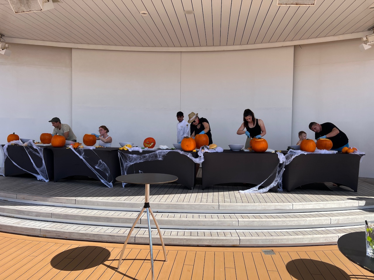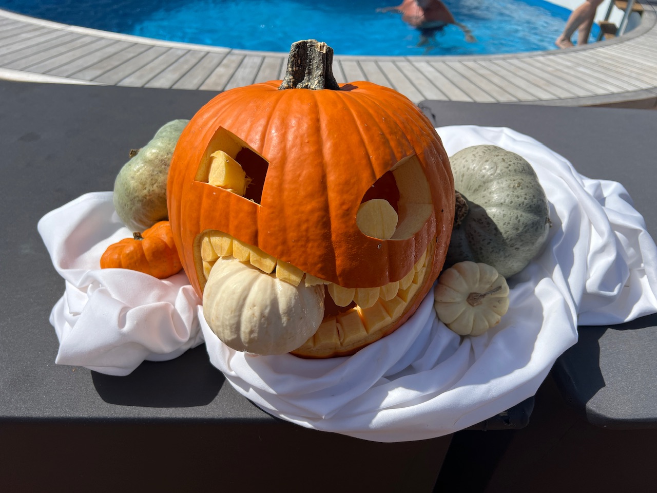 Als die Kinder abgegeben sind, gehen wir auf das Pooldeck. Hier findet heute das große Wett-Kürbis-Schnitzen statt. Und das bei gefühlten 30 Grad und blauem Himmel. Jeweils fünf Kandidaten treten in zwei Gruppen gegeneinander an. Innerhalb von 15 Minuten muss ein Kürbis dekoriert sein - anschließend entscheidet das Publikum über den Sieger. Irgendwann wird es in der Sonne dann aber doch zu heiß um beim Kürbis schnitzen zuzuschauen.
