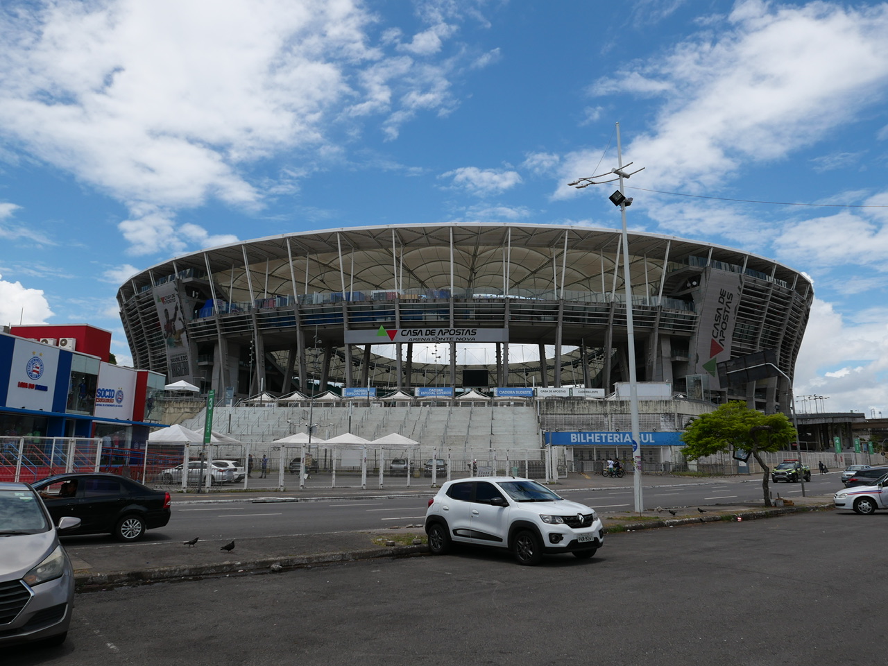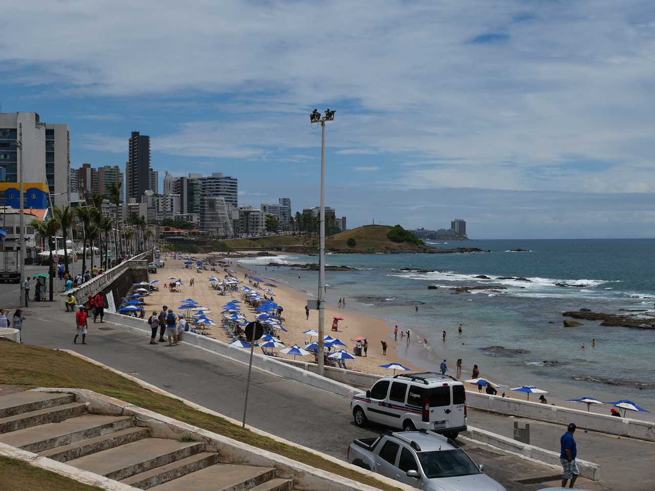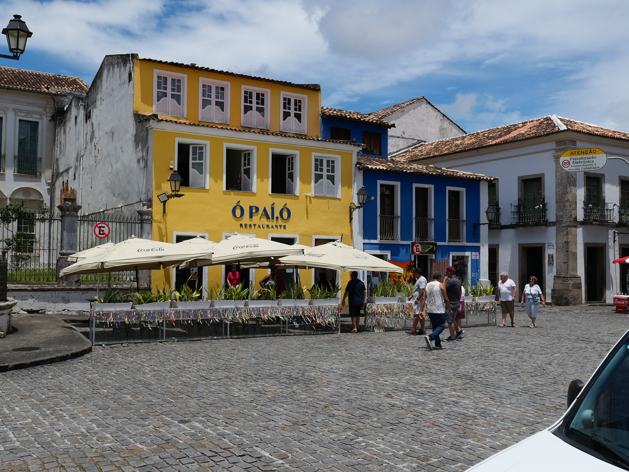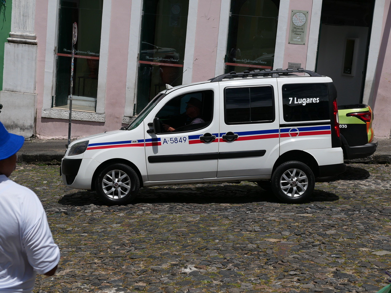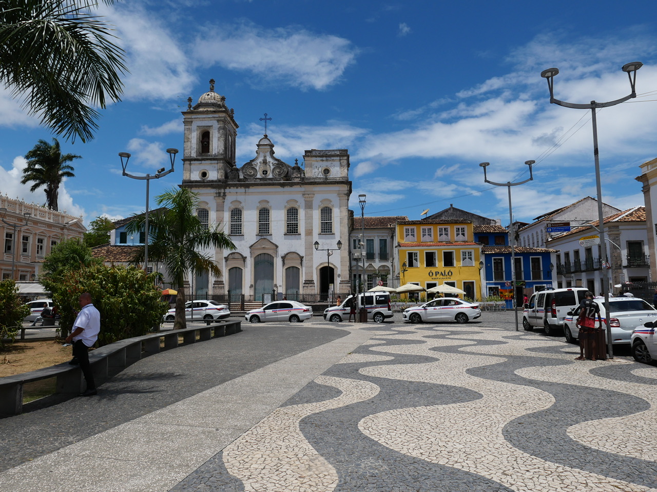 Nachdem wir das Hafenterminal durchlaufen haben, werden wir von hunderten Touranbietern und Taxifahrern begrüßt die sich alle darum reißen ein paar Passagiere einzusammeln. Das ist alles erstmal etwas viel für uns, sodass wir uns zunächst durch die Masse durchschlängeln und erstmal durchatmen können. Dann kommt ein kleiner, älterer Mann mit Hut auf uns zu, und hält uns seine laminierte Tour durch Salvador vor die Nase. In den paar Worten englisch die er kann, deutet er immer abwechselnd auf die Karte und sein Taxi. Das überzeugt uns am Ende, und wir lassen uns mal überraschen was dieses Abenteuer für uns bereit hält.
