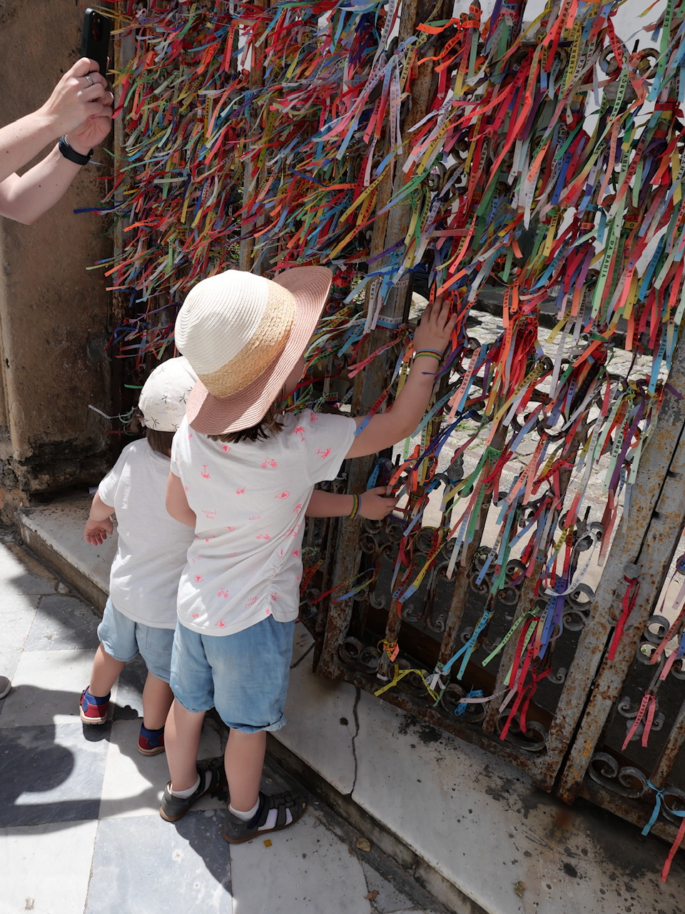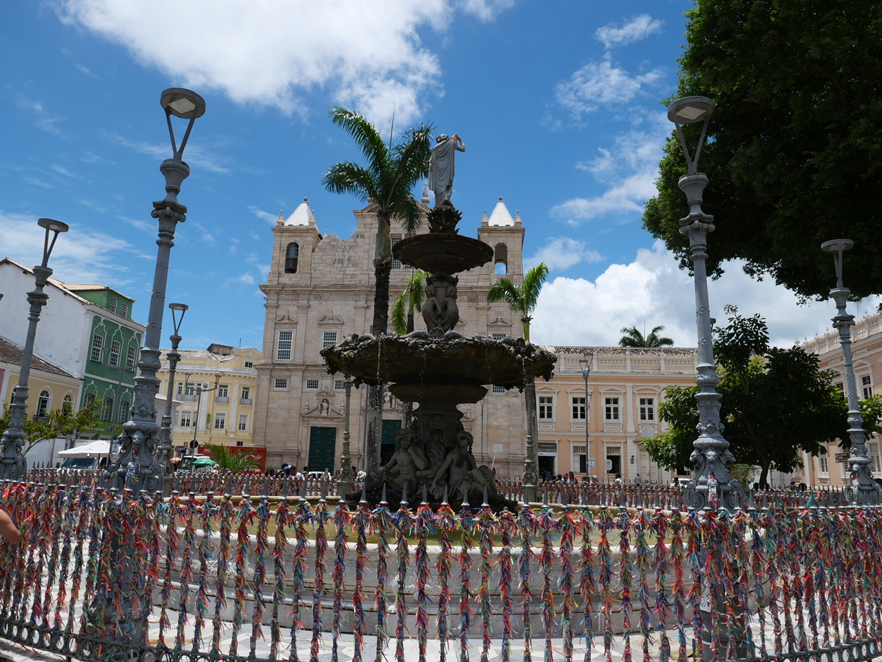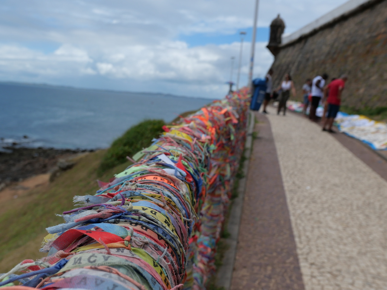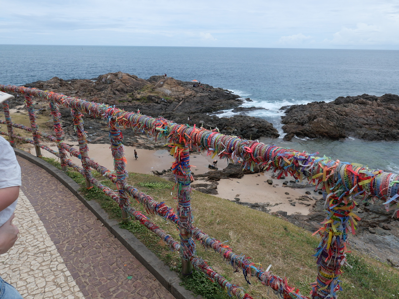 Hier am Leuchtturm fallen uns auch zum ersten Mal die bunten Bänder auf, die es hier an jeder Ecke gibt, und die im Grunde alle Sehenswürdigkeiten verzieren. Es handelt sich um Bonfim Glücksbänder, die je nach Farbe für etwas anderes gut sein sollen. So stehen zum Beispiel grüne Bänder für Gesundheit, und türkise für die Liebe. Man darf diese Bänder nicht abschneiden, weil sich der Wunsch sonst nicht erfüllt. Das hat zur Folge, dass es an einigen Stellen in der Stadt eben so aussieht:
