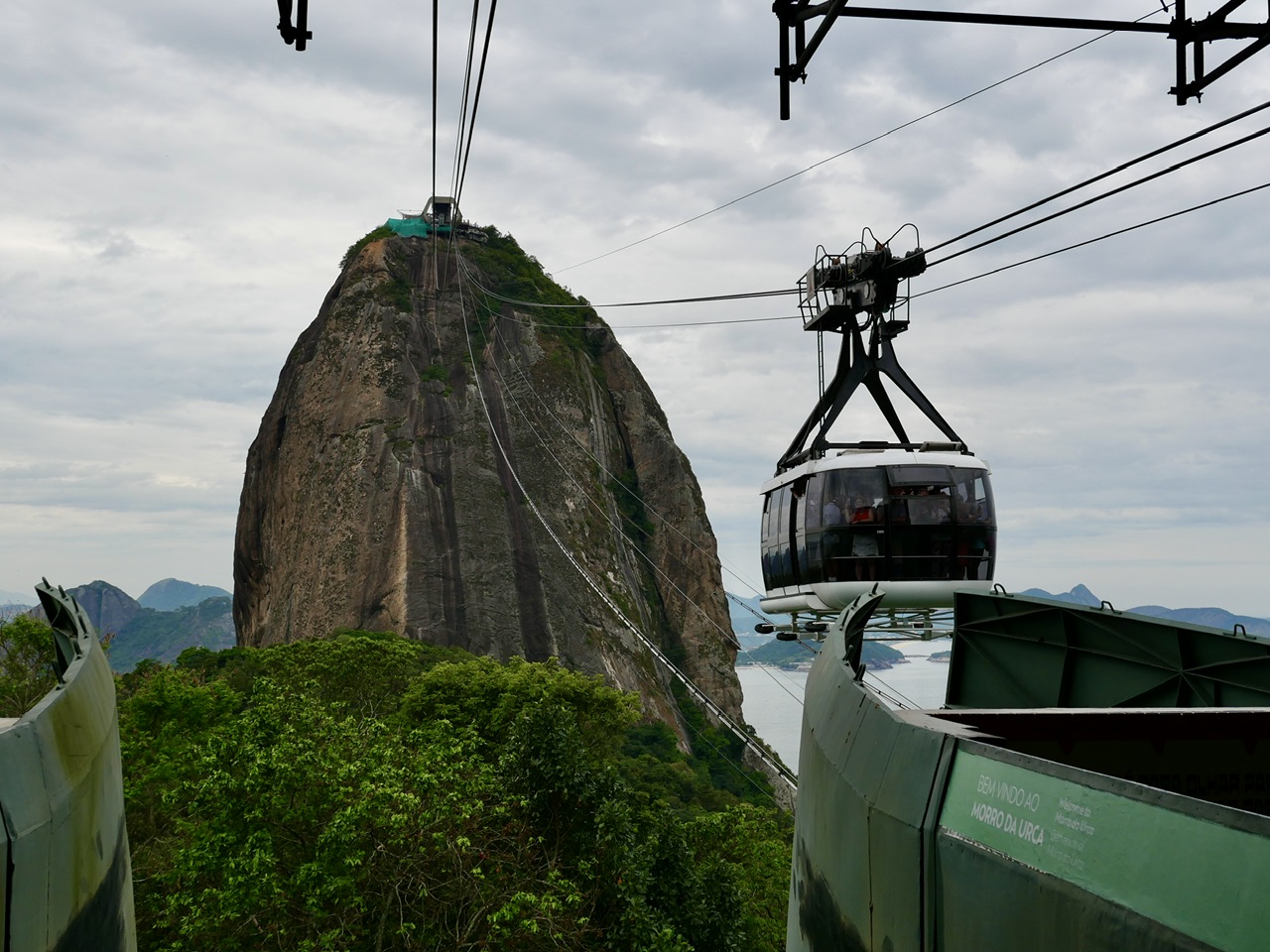Die Seilbahnstation am Fuß des Zuckerhuts ist gut besucht, doch unser Guide Helena hat das geschickt eingeplant. Wir müssen nicht lange warten, bis wir in die erste Gondel steigen können. Die Seilbahn führt uns zunächst zur Zwischenstation auf den Morro da Urca, wo wir bereits die erste atemberaubende Aussicht auf die Stadt, die Bucht und das umliegende Meer genießen. Auch einen kleinen Affen konnten wir in den Bäumen sehen. Der Blick von hier ist schon beeindruckend, aber das Highlight steht noch bevor.