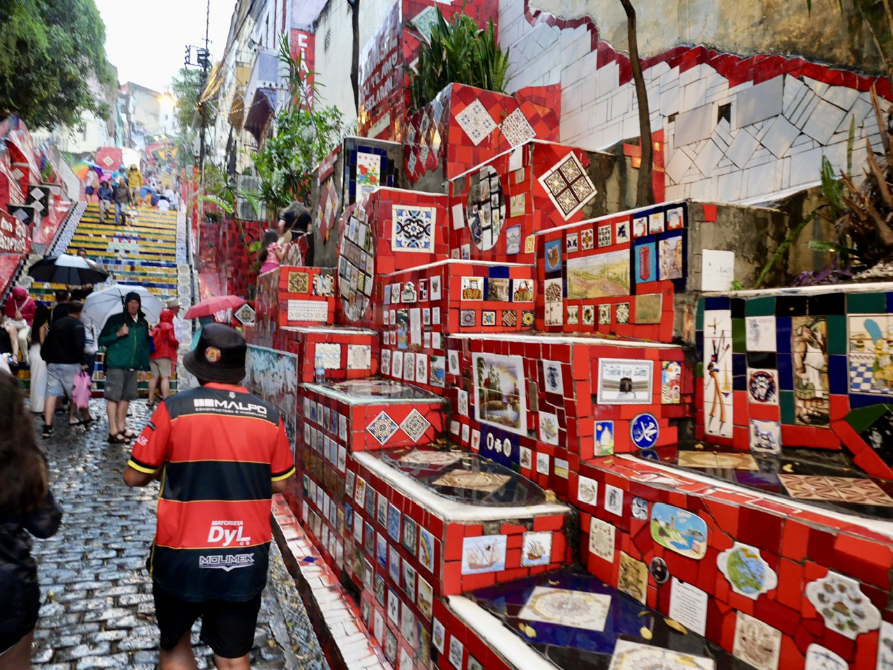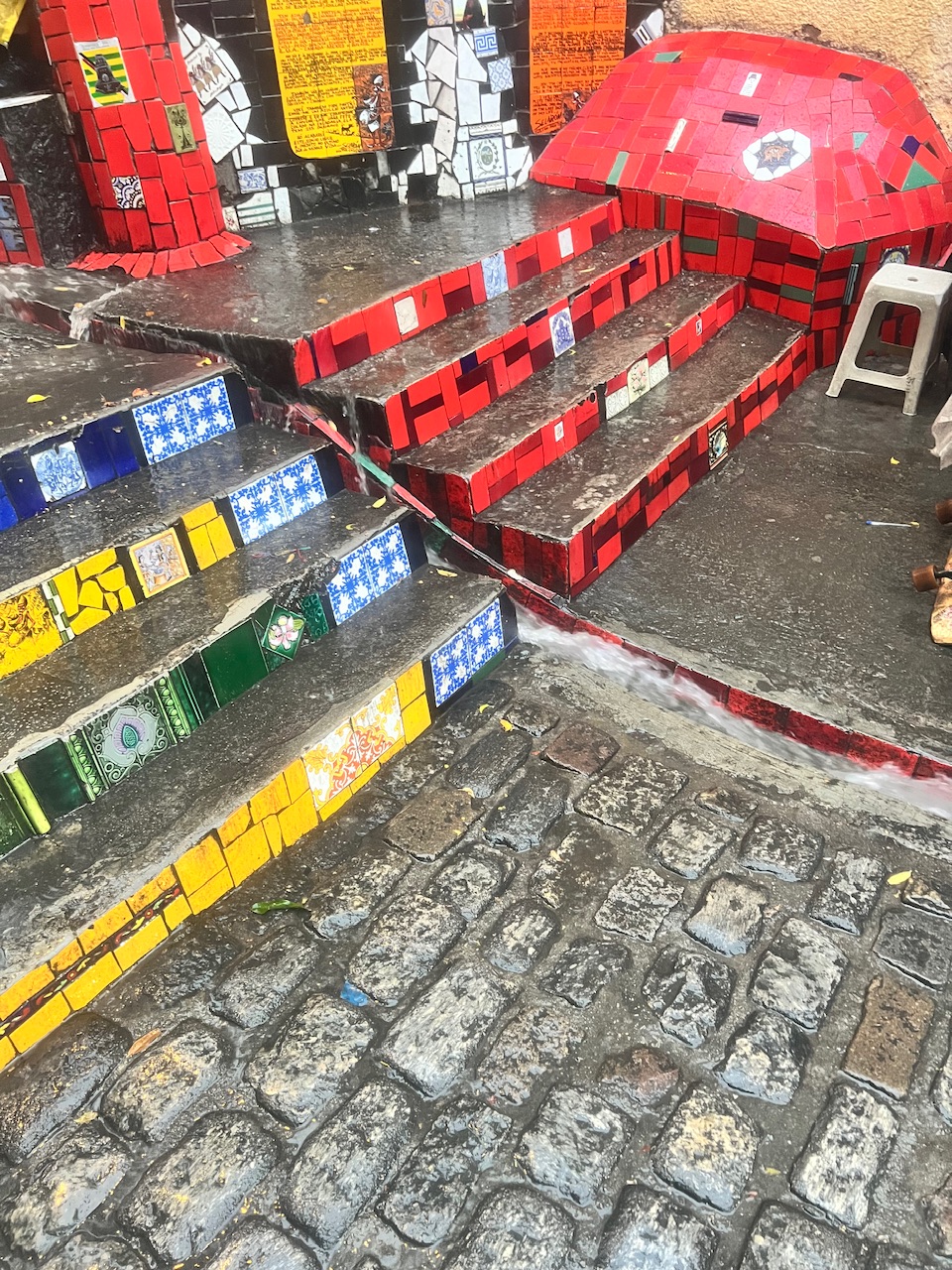 Inzwischen dämmert es – vielleicht wegen der schwarzen Regenwolken, die Rio in ein mystisches, dunkles Licht tauchen. Nächster Halt: die berühmten Selarón-Treppen. Als wir ankommen, öffnet der Himmel seine Schleusen komplett, und es schüttet wie aus Eimern. Glücklicherweise bleibt es warm, und wir sind gut vorbereitet mit unseren Regenjacken. Die Händler am Straßenrand wittern ihr Geschäft und bieten Regenponchos an, doch wir lehnen dankend ab.