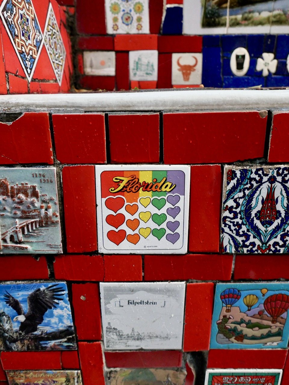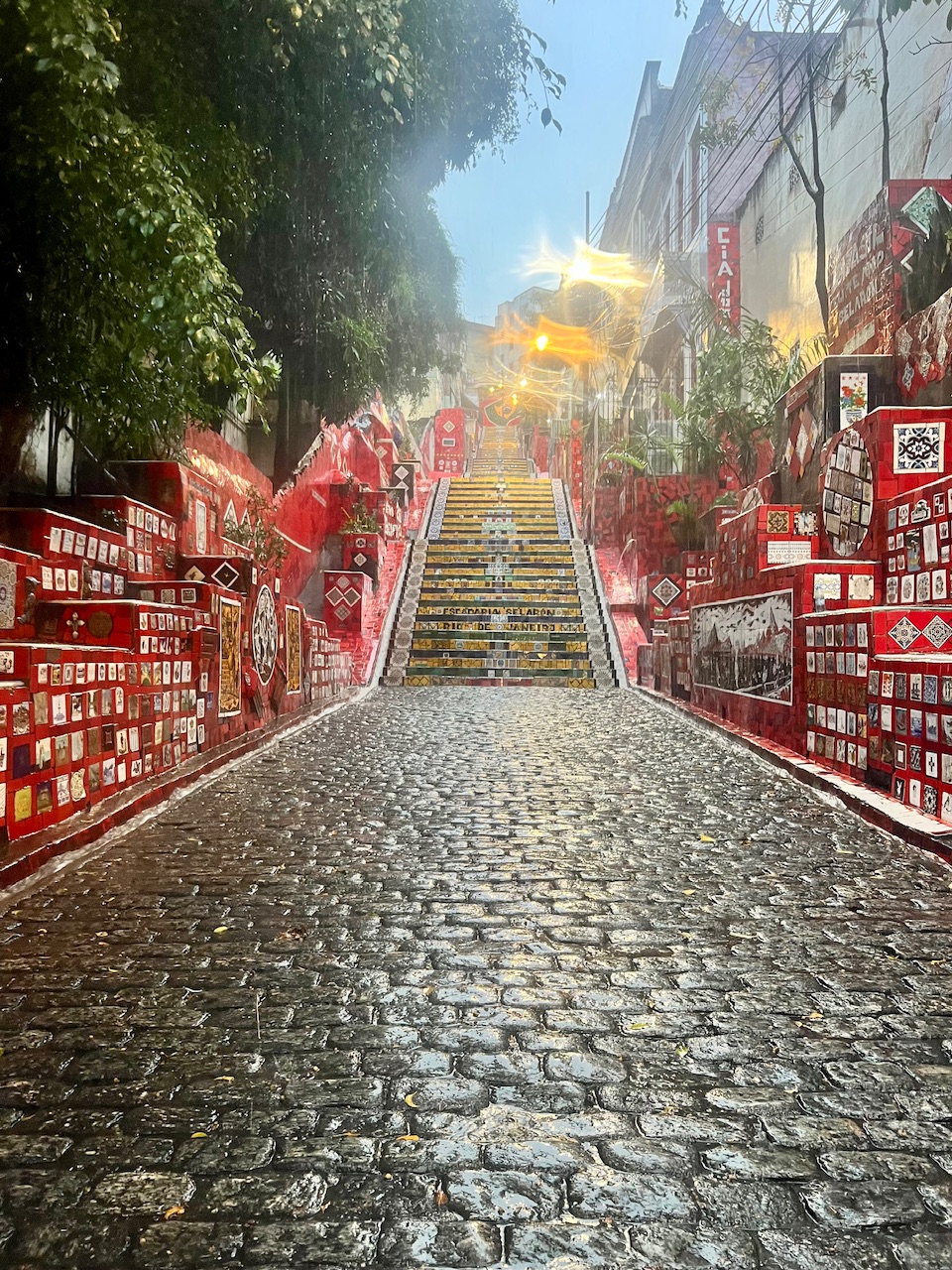 Normalerweise sind die Selarón-Treppen von Touristen überrannt. Heute aber, vermutlich wegen des Regens, haben wir sie fast ganz für uns allein – ein echter Glücksfall! Die bunten Fliesen, die der Künstler Jorge Selarón im Laufe seines Lebens gesammelt und hier angebracht hat, leuchten umso intensiver in den grauen Dunst des Regens. Ursprünglich war die Treppe eine einfache, graue Steintreppe, doch Selarón fand sie so langweilig, dass er begann, sie mit Keramikfliesen aus aller Welt zu verschönern. Mit der Zeit brachten ihm Besucher Fliesen aus ihren Heimatländern mit, und so wurde die Treppe zum Symbol für Vielfalt und Kunst in Rio. Traurigerweise endete das Leben dieses einzigartigen Künstlers auf mysteriöse Weise: Selarón wurde vor einigen Jahren tot an seiner geliebten Treppe gefunden. Bis heute weiß niemand genau, was damals geschehen ist, und so ranken sich viele Legenden um diesen Ort.