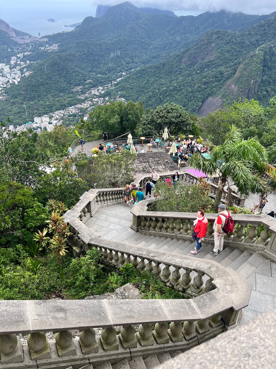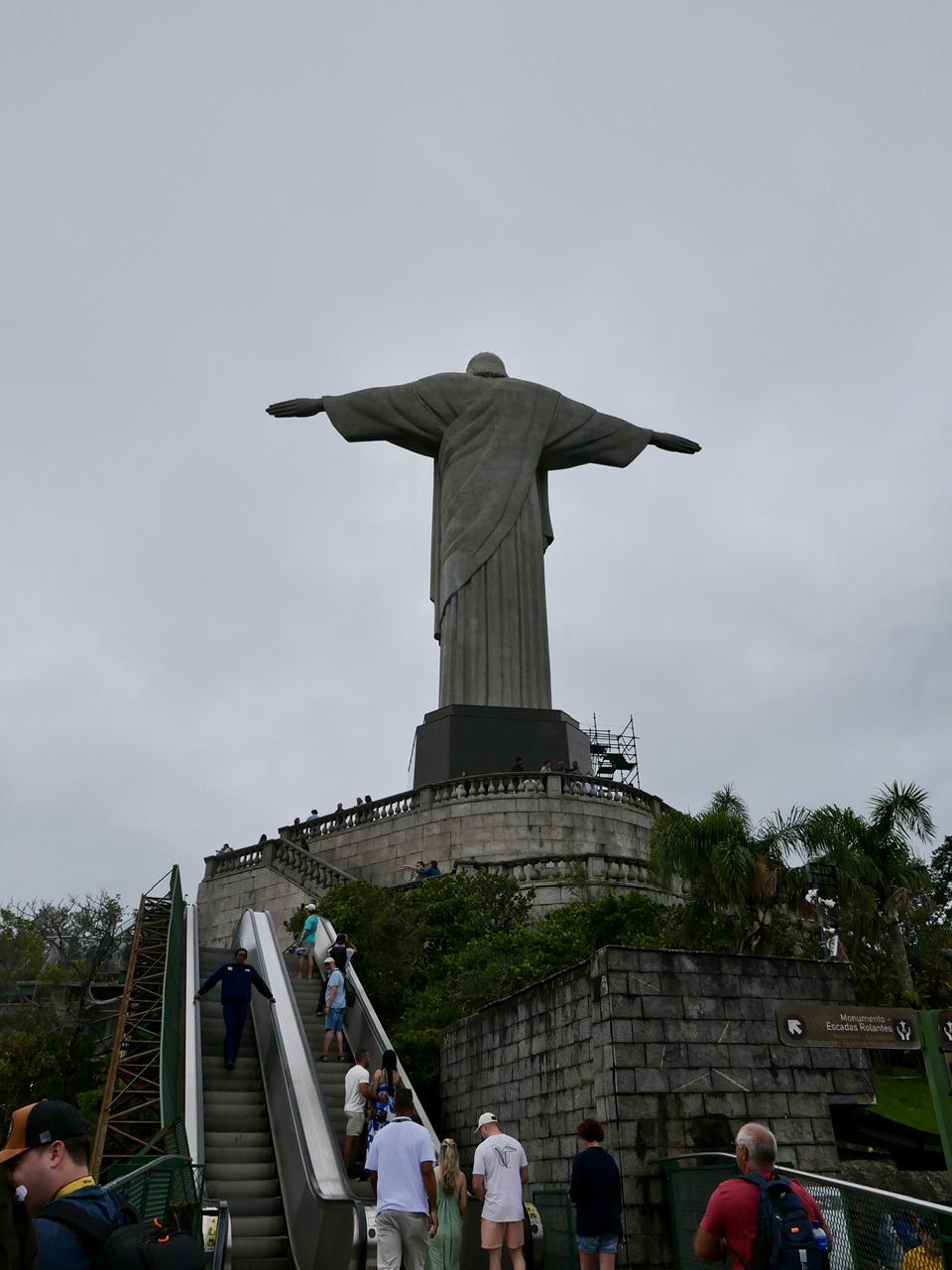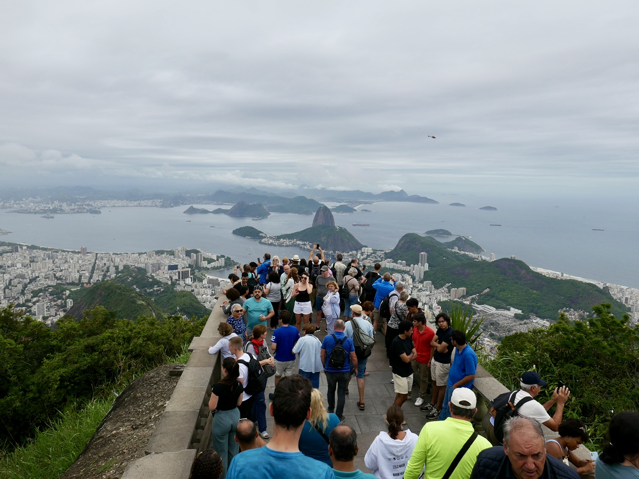 Wir stehen staunend vor diesem Meisterwerk, das in den 1930er Jahren erbaut wurde und seitdem unzählige Besucher anzieht. In dieser Höhe spüren wir auch den Wind, der uns an den Regenschauer von gestern erinnert, heute regnet es nicht, und wir genießen die atemberaubende Aussicht über Rio, die Strände und die Berge.