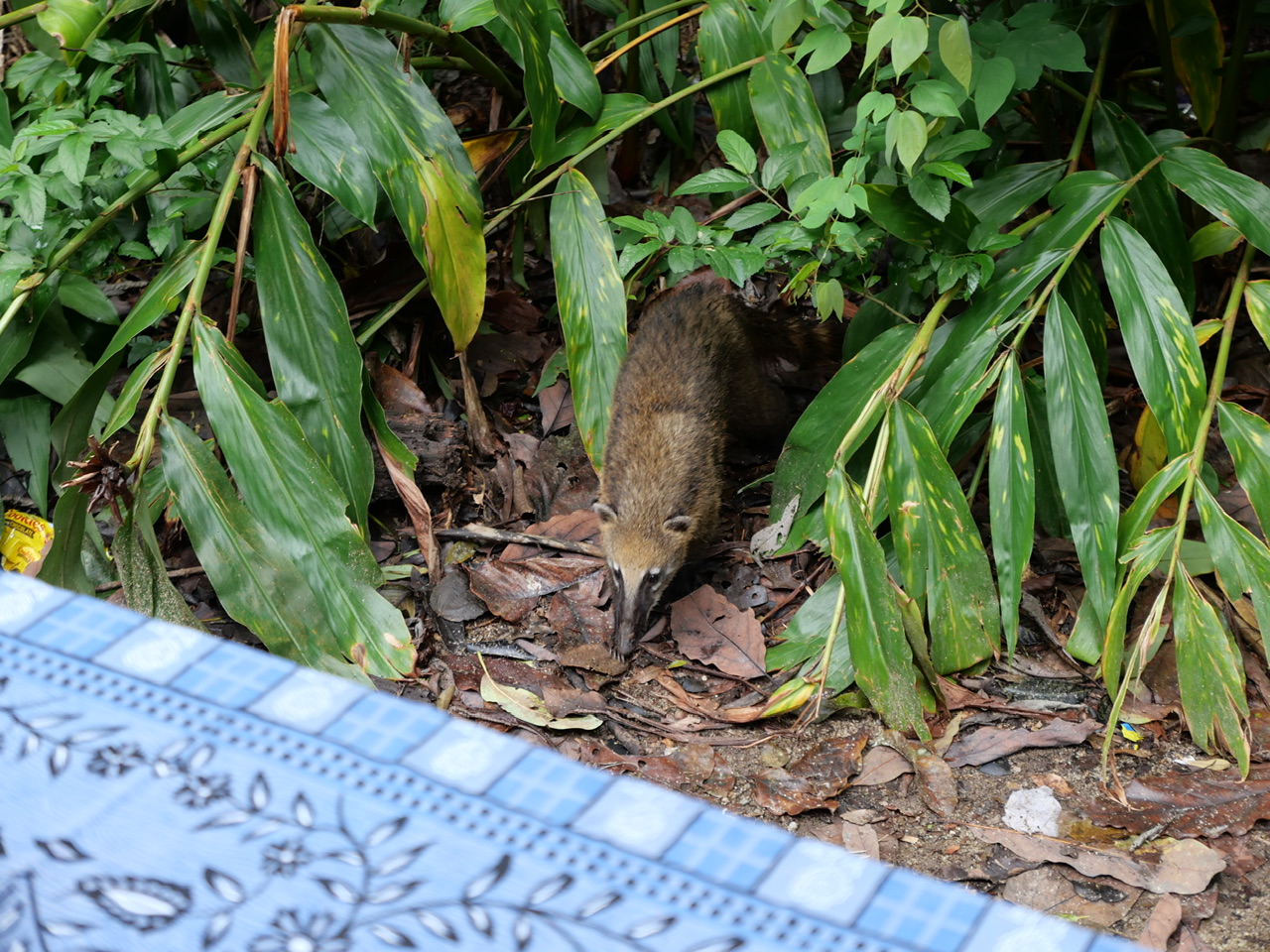 Aus den Büschen kamen auf einmal zwei freche Nasenbären, die ebenfalls sehr an den ganzen Früchten auf dem Tisch interessiert waren. Die beiden hatten so gar keine Hemmungen vor Menschen - und so versuchten sie immer wieder an das Essen zu kommen. Es hieß also für die Erwachsenen das Essen zu verteidigen, da die Kinder noch im Flusslauf des Wasserfalls spielten.
