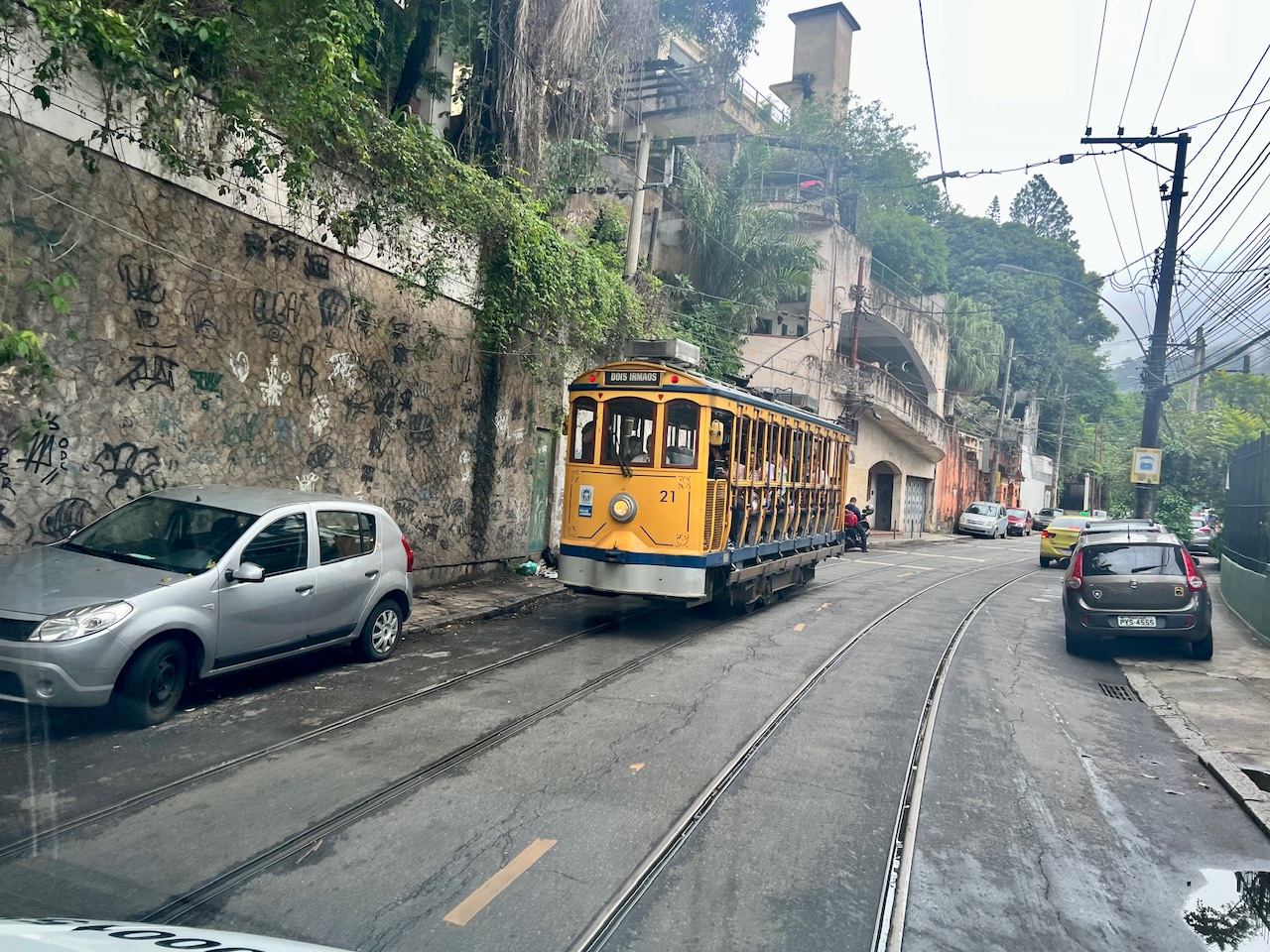 Unser Weg führt uns durch eines meiner persönlichen Highlights, von denen ich im Vorfeld gar nichts wusste. Wir fahren durch das historische Stadtzentrum von Rio durch die auch heute noch die alte historische Straßenbahn fährt. Hier sitzt der Fahrer einfach mit den Fahrgästen in einem offenen Wagen. Durch dieses Gebiet fahren wir aber leider nur durch.
