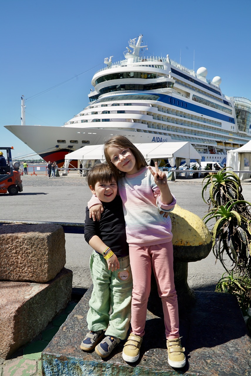 Nachdem wir das Gelände vom Hafen verlassen haben, kam auf einmal ein Kind auf uns zugerannt, schnurstracks auf Theo und Lotti zu und hat uns gefragt ob wir nicht zusammen durch die Stadt wollen. Weil wir die Eltern auch ganz nett finden, stimmen wir da zu - und so machen wir uns zu acht auf den Weg in die „Ciudad Vieja“, der Altstadt. Wir sind ja noch relativ früh, deshalb wirkt die ganze Stadt noch relativ leer.