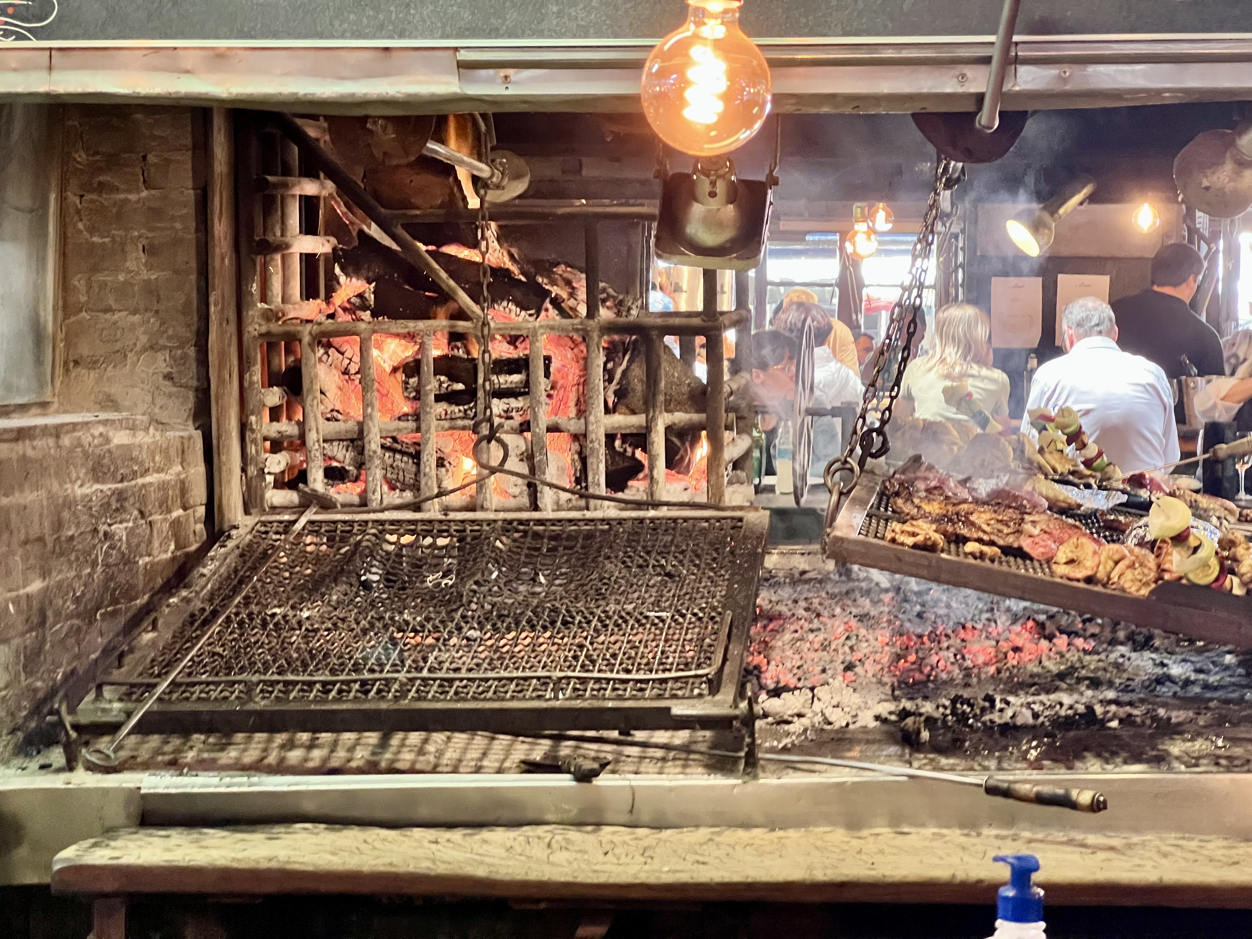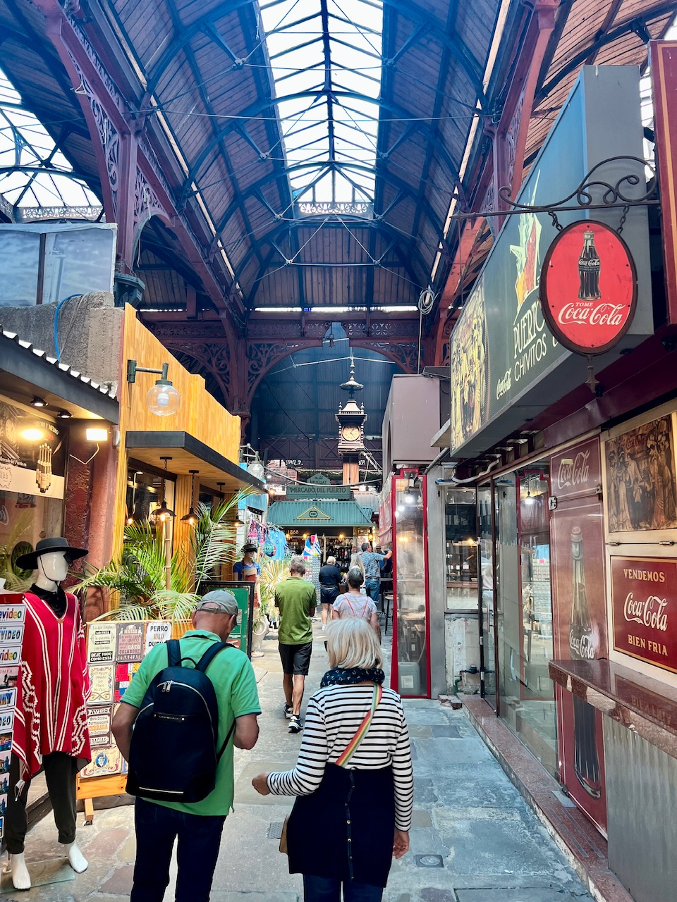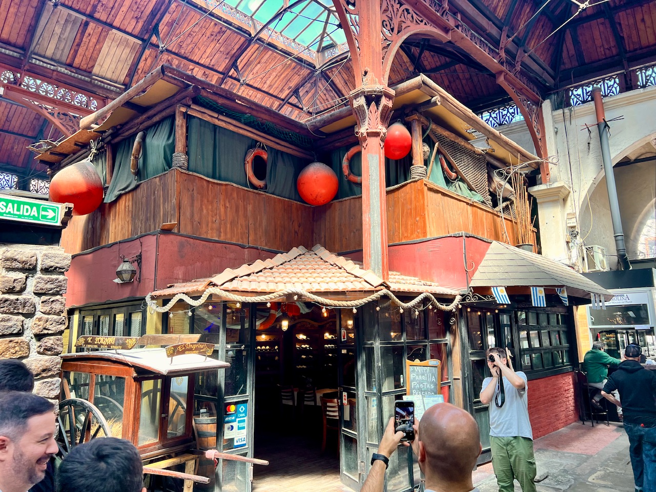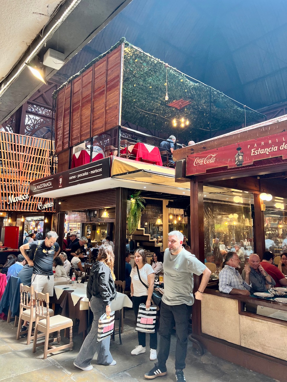 Die Atmosphäre in der Halle ist unbeschreiblich. Es sind unglaublich viele Menschen unterwegs und drängen sich in die vielen kleinen Restaurants. Es reiht sich eine Küche an die nächste. Alle grillen über offenem Feuer viele Kilo Rindfleisch. Auch wenn auf dem Bild offensichtlich zwei Kreuzfahrer vor uns laufen, sind unter den Besuchern des Marktes weitaus mehr einheimische Unterwegs als Touristen. Die Kleine Hallte platzt aus allen Nähten, jeder kleine Bereich wird für Tische und Stühle genutzt.