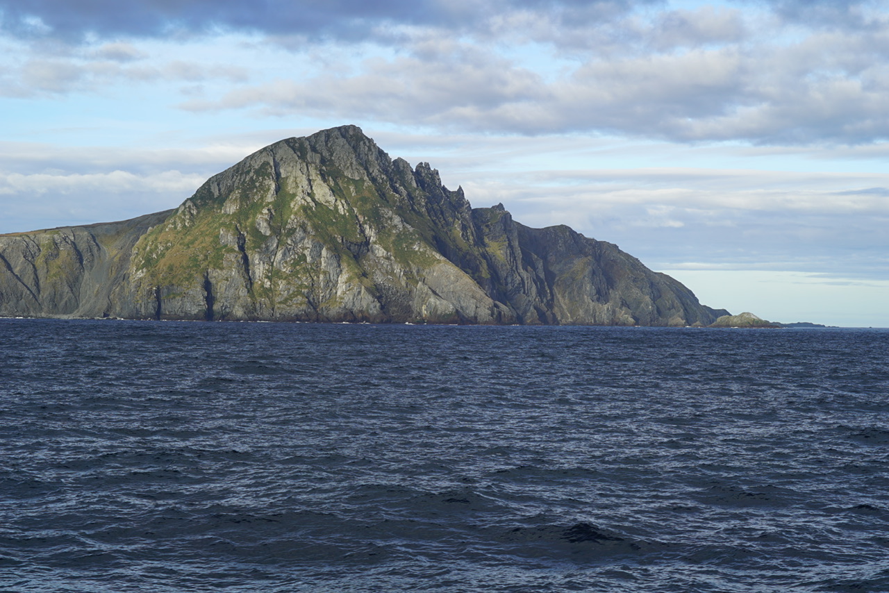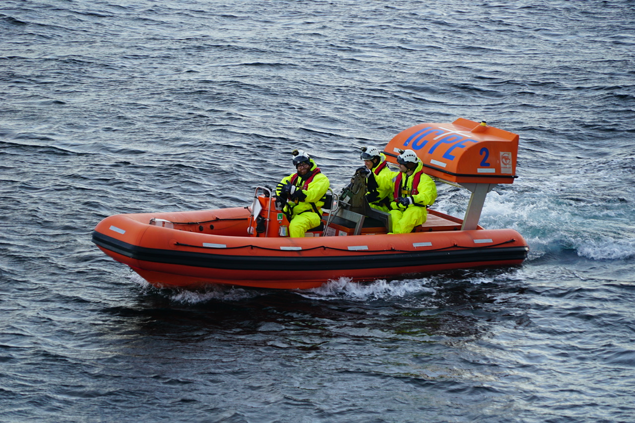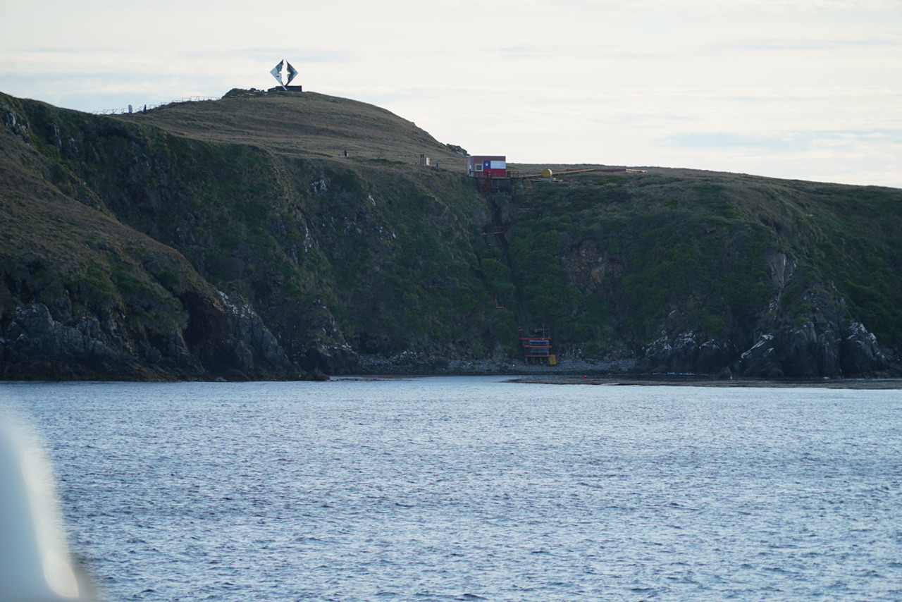Nachdem wir den Motor wieder angestellt hatten, meldet sich der Kapitän für Überraschung Nummer zwei. Wie wir vorher erfahren hatten, lebt auf der Insel ein „Leuchtturmwärter“ mit seiner Familie (Frau und zwei Kinder 8 und 14 Jahre). Da die Versorgung mit frischen Lebensmitteln an diesem Ort der Welt eher schwierig ist, helfen wir heute aus. 4 Brückenmitglieder fahren mit unserem Zodiac vollbeladen mit Lebensmitteln und Geschenken für die Kinder. Während dessen treiben wir etwa 45 vor der Insel mit Prämiumblick auf den Leuchtturm und das berühmte Albatrossmahnmal. Das können wir glücklicherweise nun auch von der Kabine beobachten. Da wir uns einmal drehen. Unter tosendem Applaus fährt unsere Crew los und wird auch später wieder begrüßt. Sie haben auch eine Schiffsflagge abgegeben, die dort in die Sammlung mit aufgenommen wird. Bei untergehender Sonne verlassen wir diesen magischen Ort und fallen glücklich ins Bett.