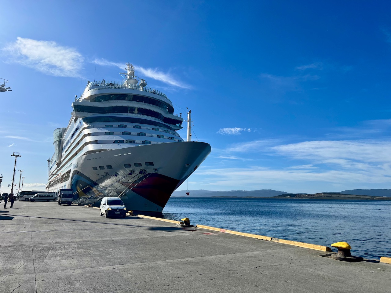 Der Hafen von Ushuaia spielt eine zentrale Rolle für Expeditionen in die Antarktis. Aufgrund seiner strategischen Lage am Beagle-Kanal ist er der wichtigste Ausgangspunkt für Schiffe, die das Südpolargebiet erkunden. Jährlich starten von hier zahlreiche Expeditionskreuzfahrten, die Forscher, Abenteurer und Touristen in die eisige Wildnis bringen. Wir sind auch das einzige echte Kreuzfahrtschiff am Anleger, alles andere sind Eisbrecher und andere Expeditionsschiffe. Witziger Weise liegt eines der Schiffe der Hurtigruten hier mit Motorschaden und kann heute nicht zu seiner nächsten Reise starten. Es wird übrigens nicht der einzige Schaden am heutigen Tag sein, der zu einer Unterbrechung einer Reise führt. Dazu aber dann später mehr.
