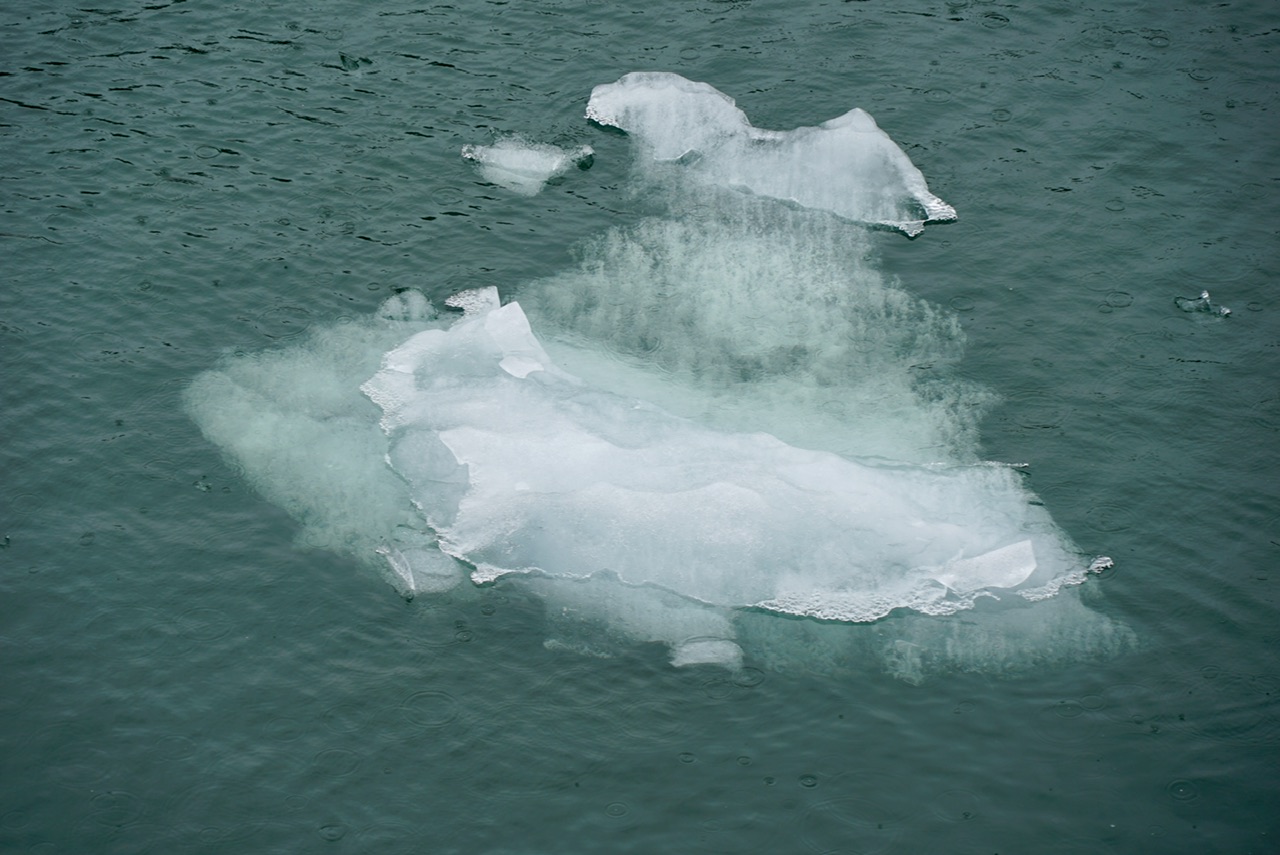 Das Wetter ist ziemlich durchwachsen und ziemlich kalt. Wir hoffen, dass es bis zum Nachmittag noch etwas aufklart. Und dann ist es kurz nach 15 Uhr bereits soweit, es kommen uns die ersten Schollen und Growler entgegen. Wieder dauert es eine ganze Weile, bis wir wirklich Sichtkontakt zum Gletscher haben. Wir nähern uns jetzt noch ein bisschen langsamer als vorhin, da die Eisfläche tatsächlich etwas dichter ist und teilweise auch Bergy bits enthält. Aber wir sind ja hier in guten Händen und vertrauen einfach mal.